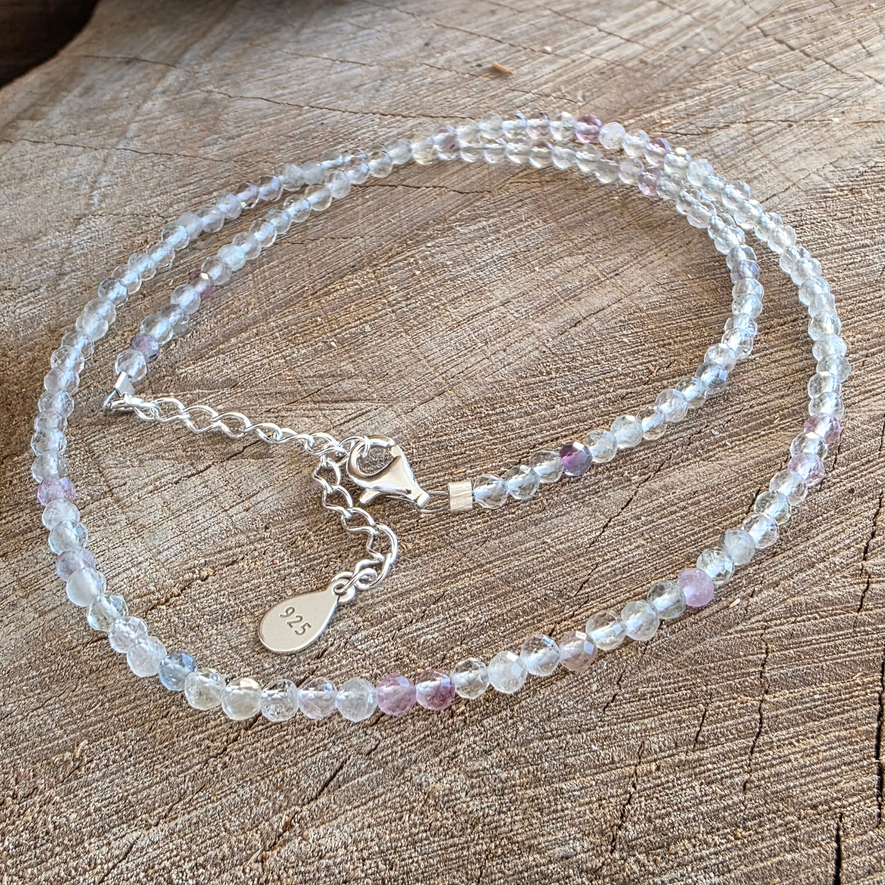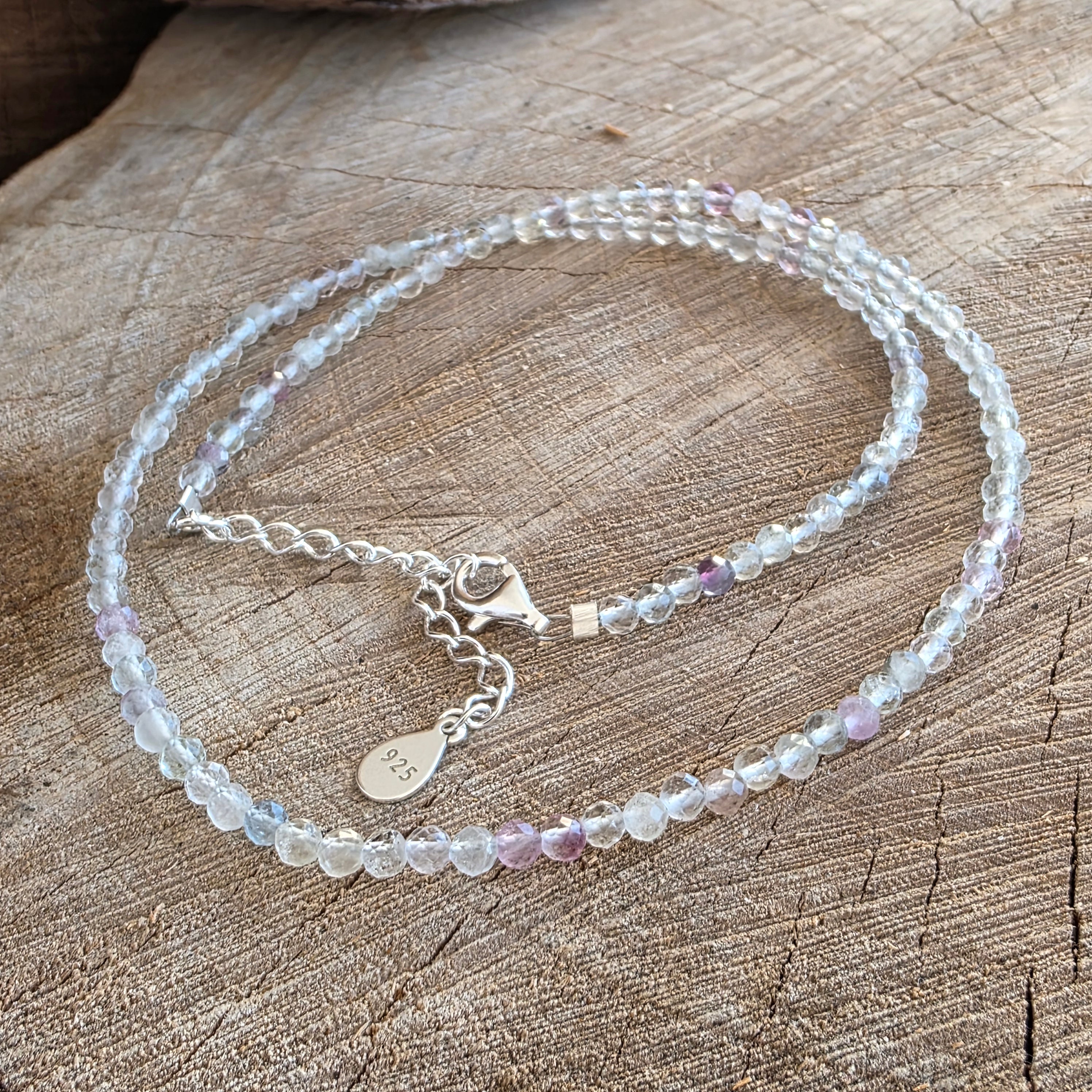 Egy nyaklánc, mint egy nyitott ablak a fény felé – élénk, tiszta, játékos és ugyanakkor mély. A 3 mm-es csiszolt szivárvány fluorit gyöngyök olyan árnyalatokban ragyognak, amelyek a lila, a zöld, a kék és a rózsaszín között táncolnak, hidat képezve az érzelem és az ész, az álom és az éberség között.