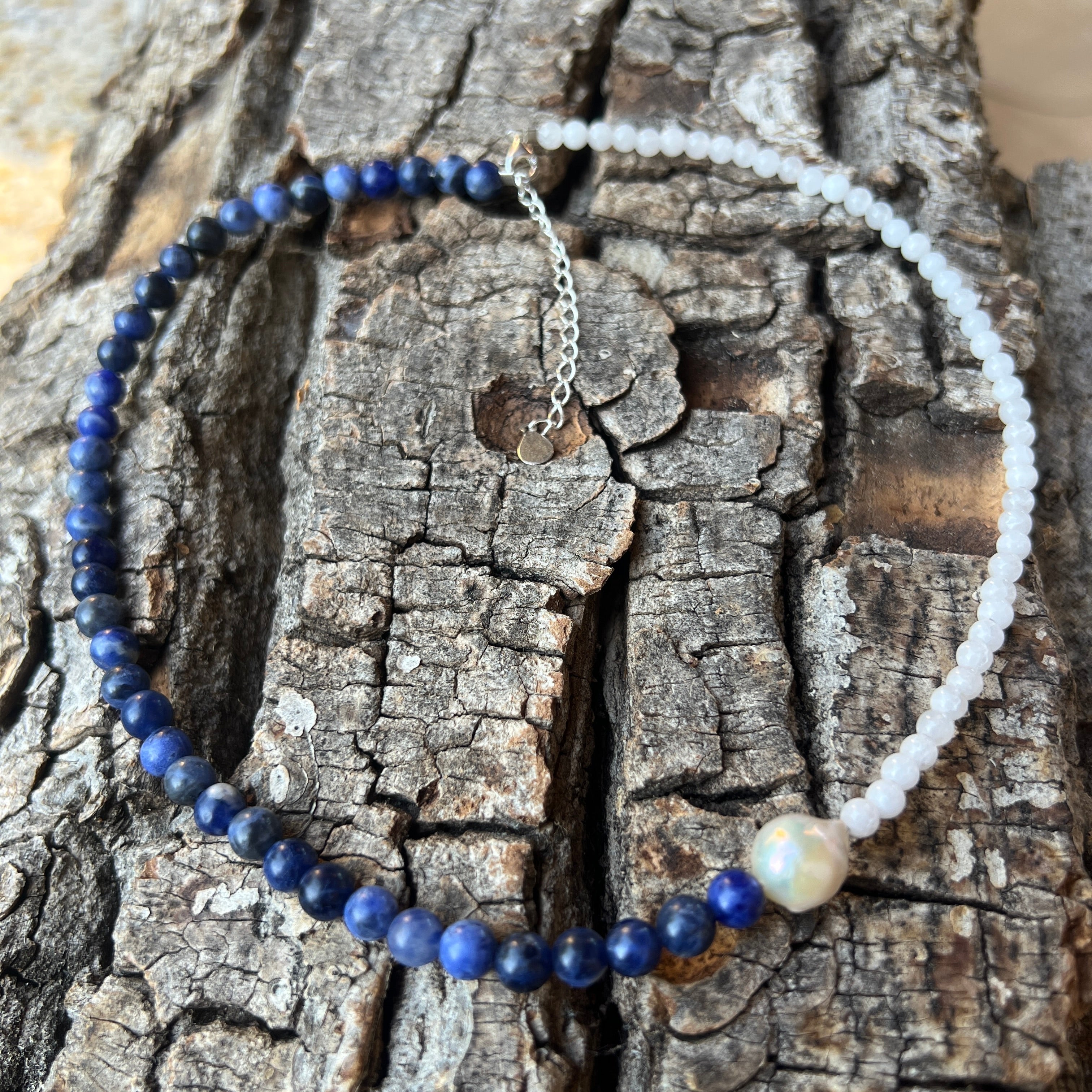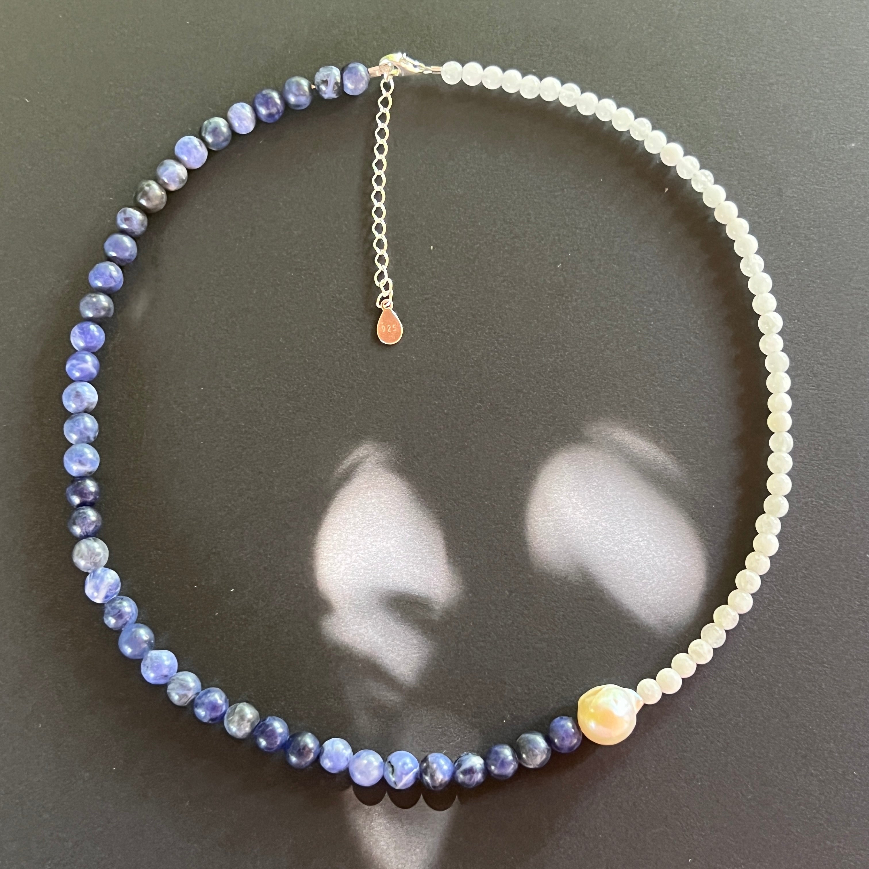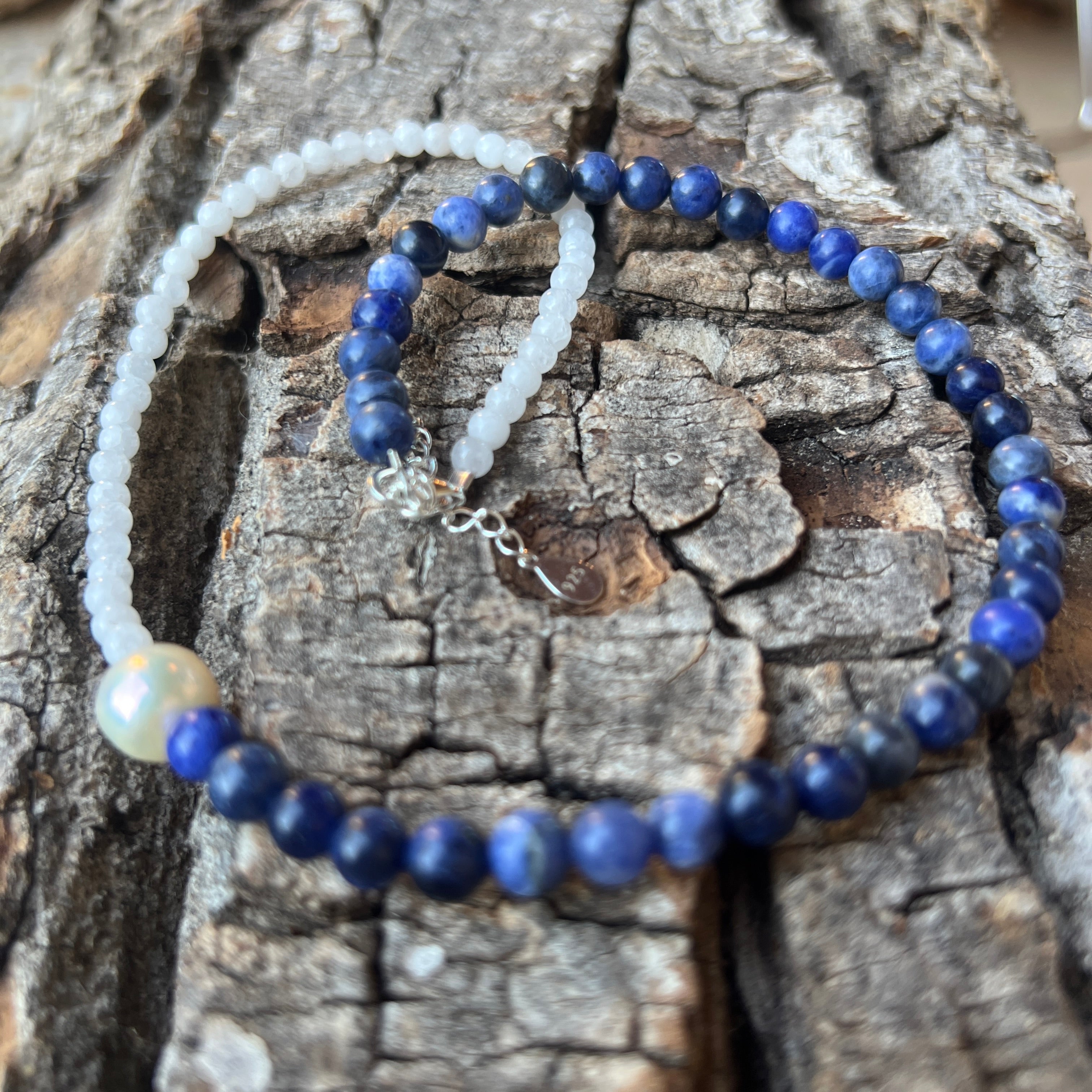 A szodalit a tiszta intuíció és az őszinte kommunikáció köve – segít kifejezni a belső igazságot és elengedni a mentális félelmeket. Fehér jade gyengéd bölcsességet, finom védelmet és nyugodt fényt hoz, amely áthatja a lény minden rétegét. A világok közötti hídként elhelyezett gyöngy pedig finoman és mélységgel köti össze a két energiát.