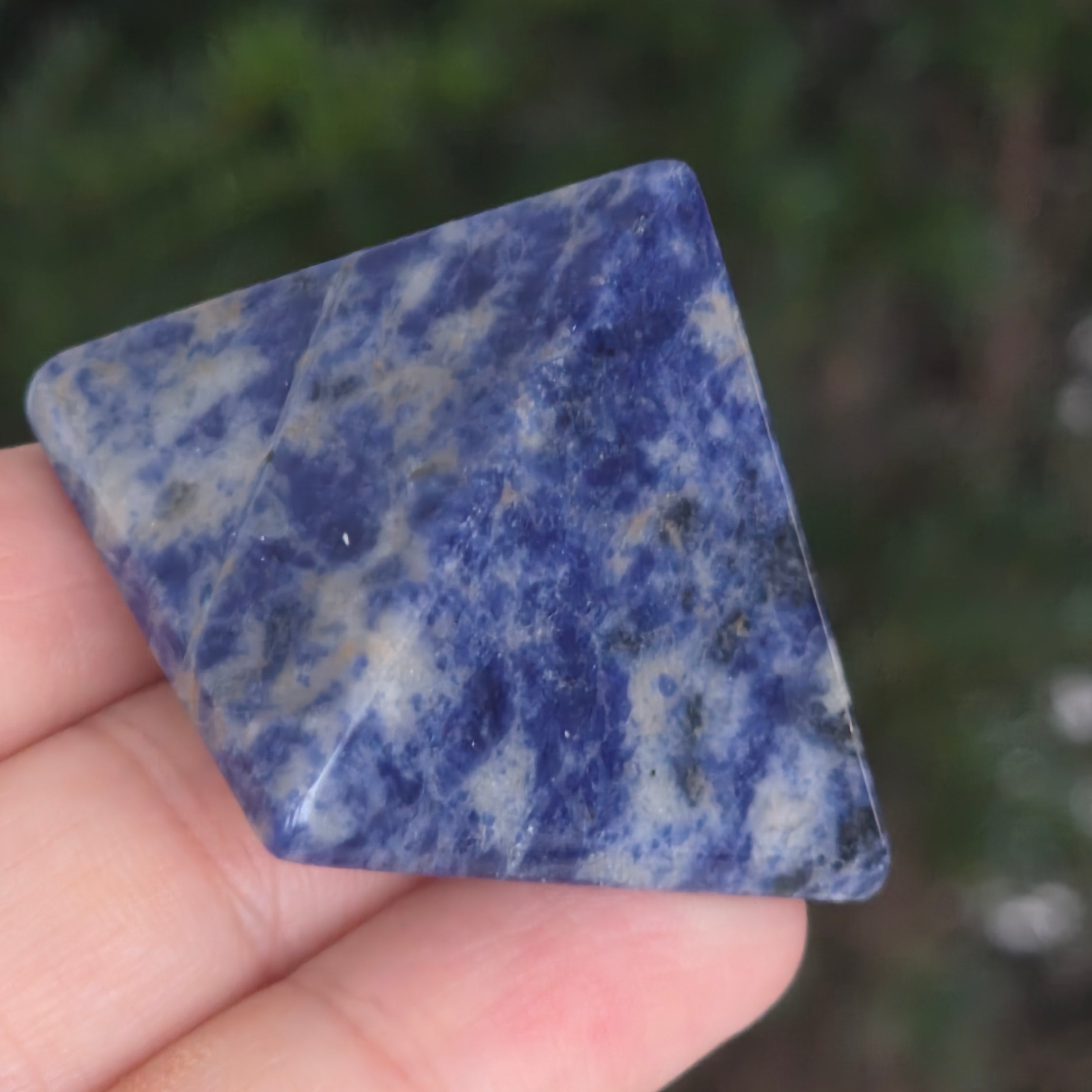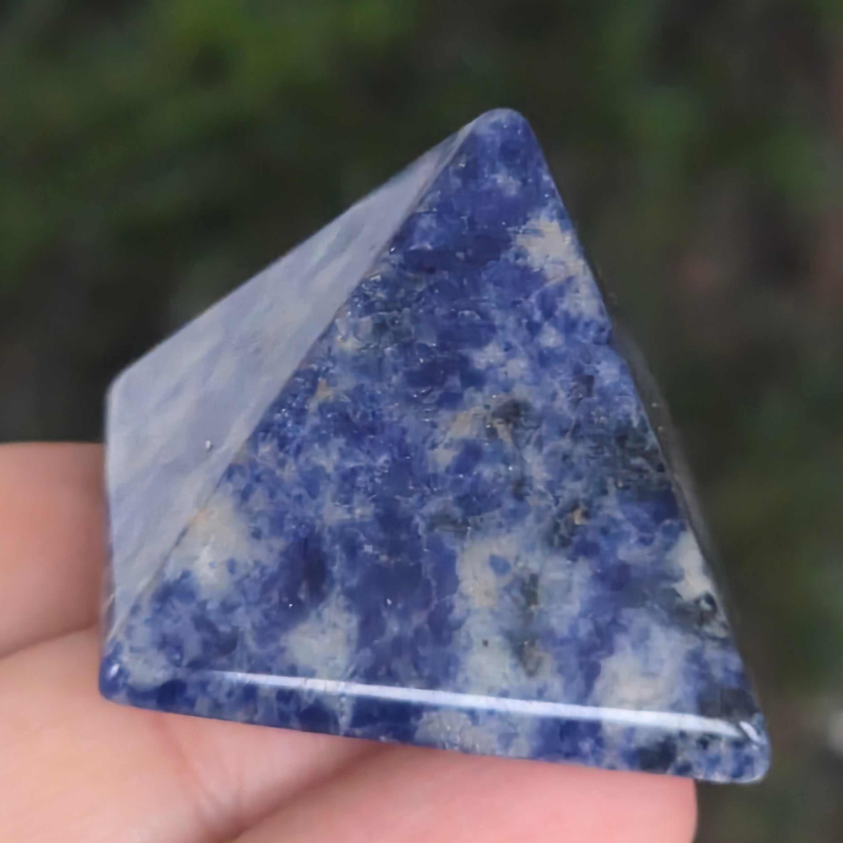 Egy piramis, amely a csillagos ég mélységét és a tiszta gondolatok nyugalmát hordozza. Ez a természetes szodalit darablenyűgöző keverékét mutatja az intenzív kéknek, fehérnek és szürkének, finom erezettel, mintha víz rajzolná a követ. A finoman csiszolt felület visszafogottan tükrözi a fényt, nyugalmat és koncentrációt sugároz.