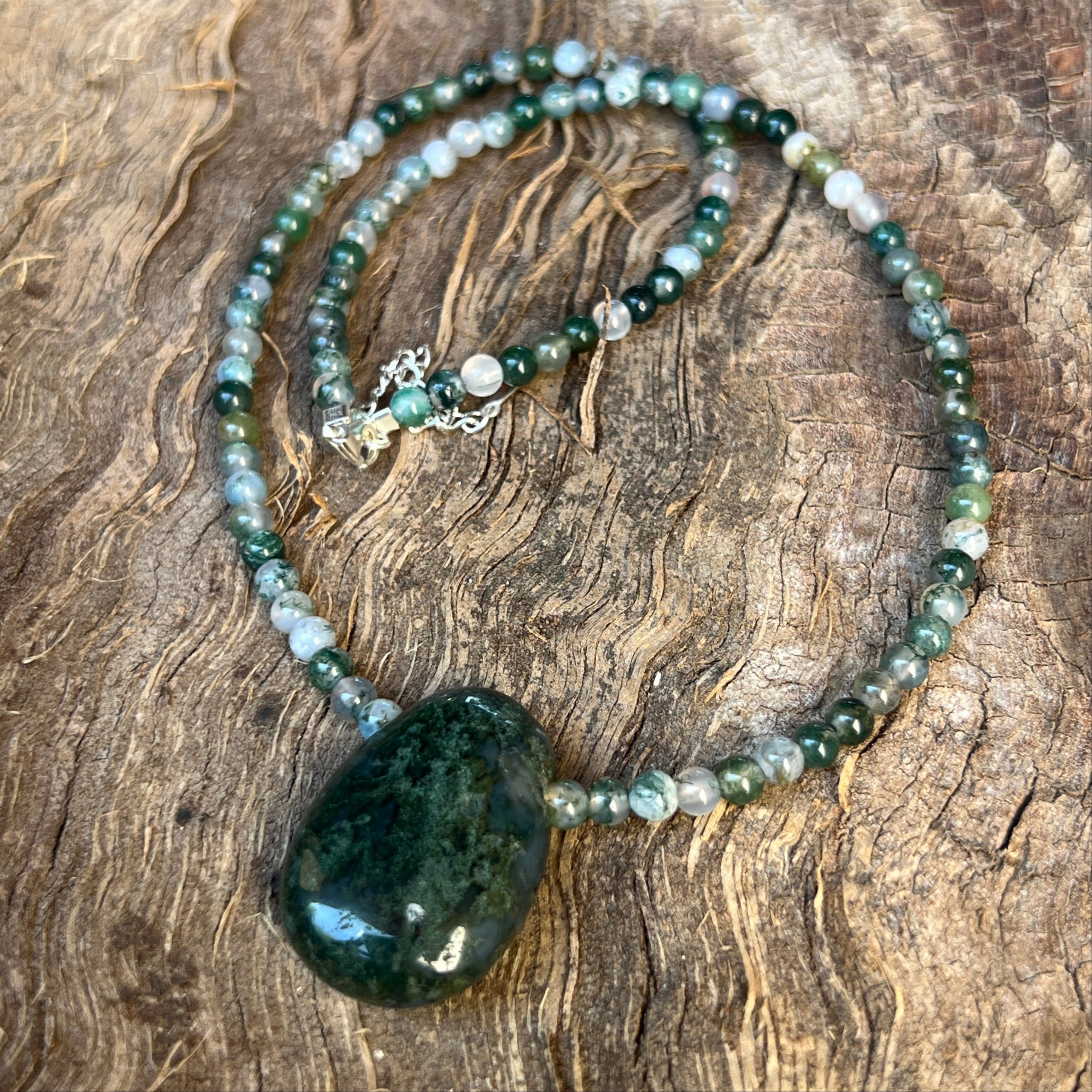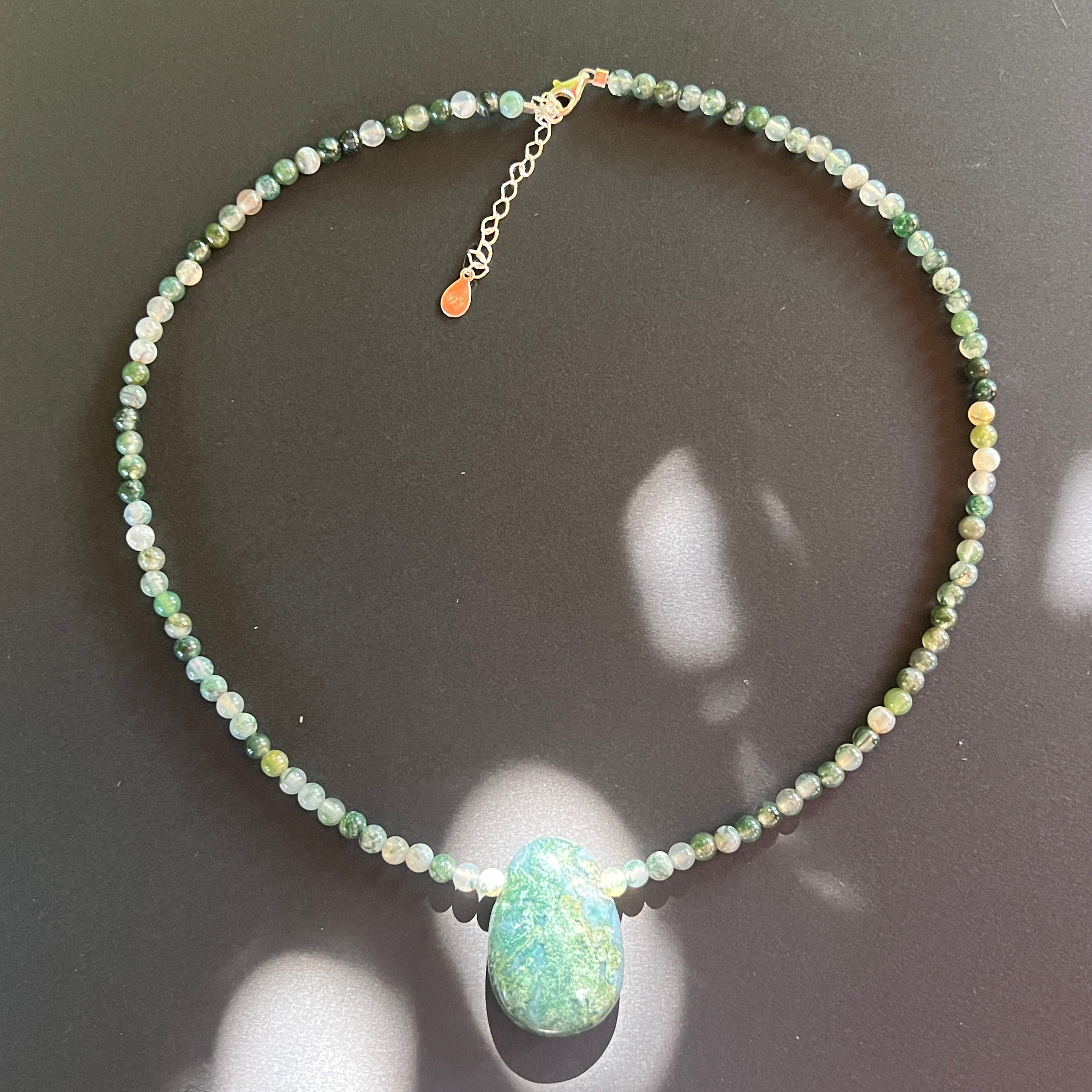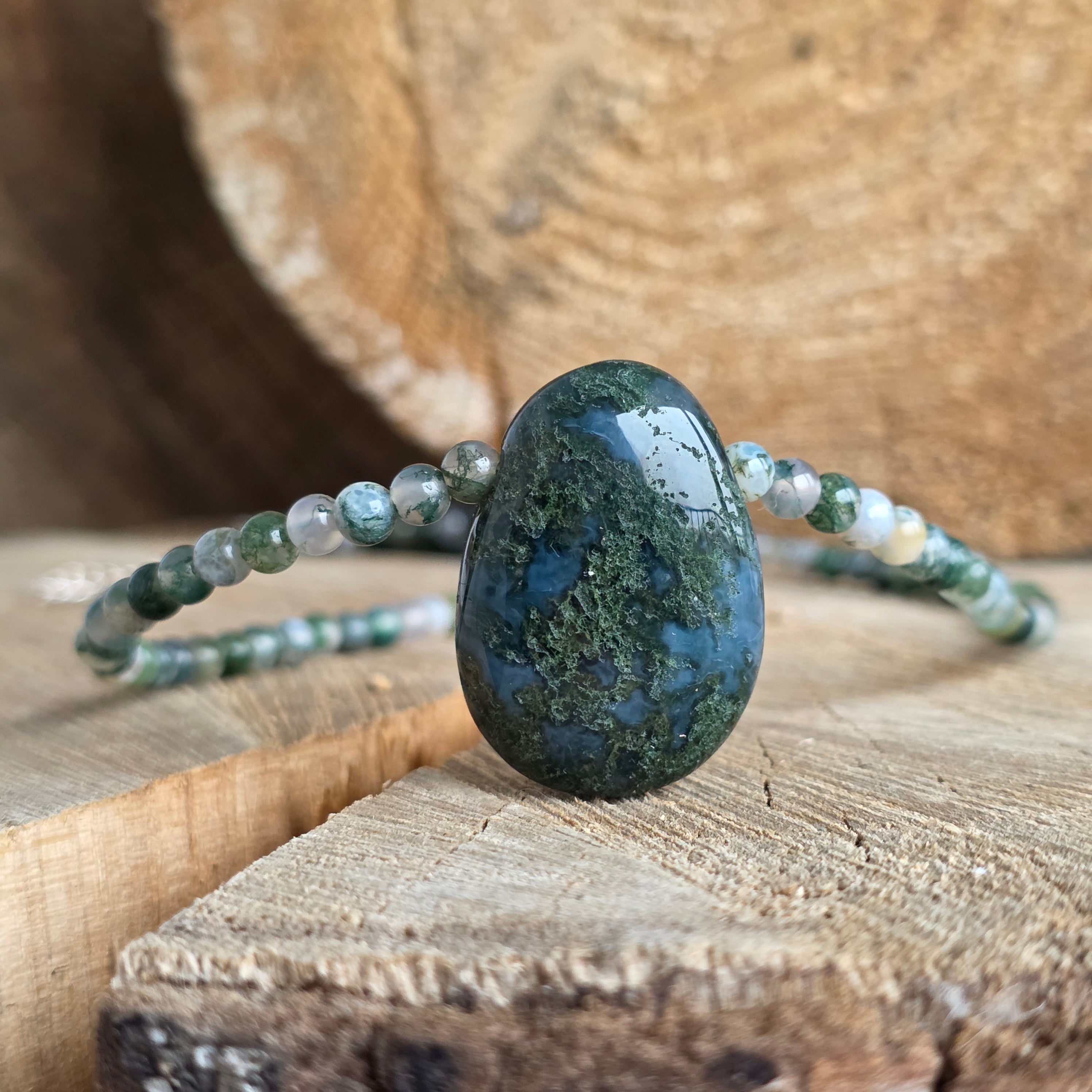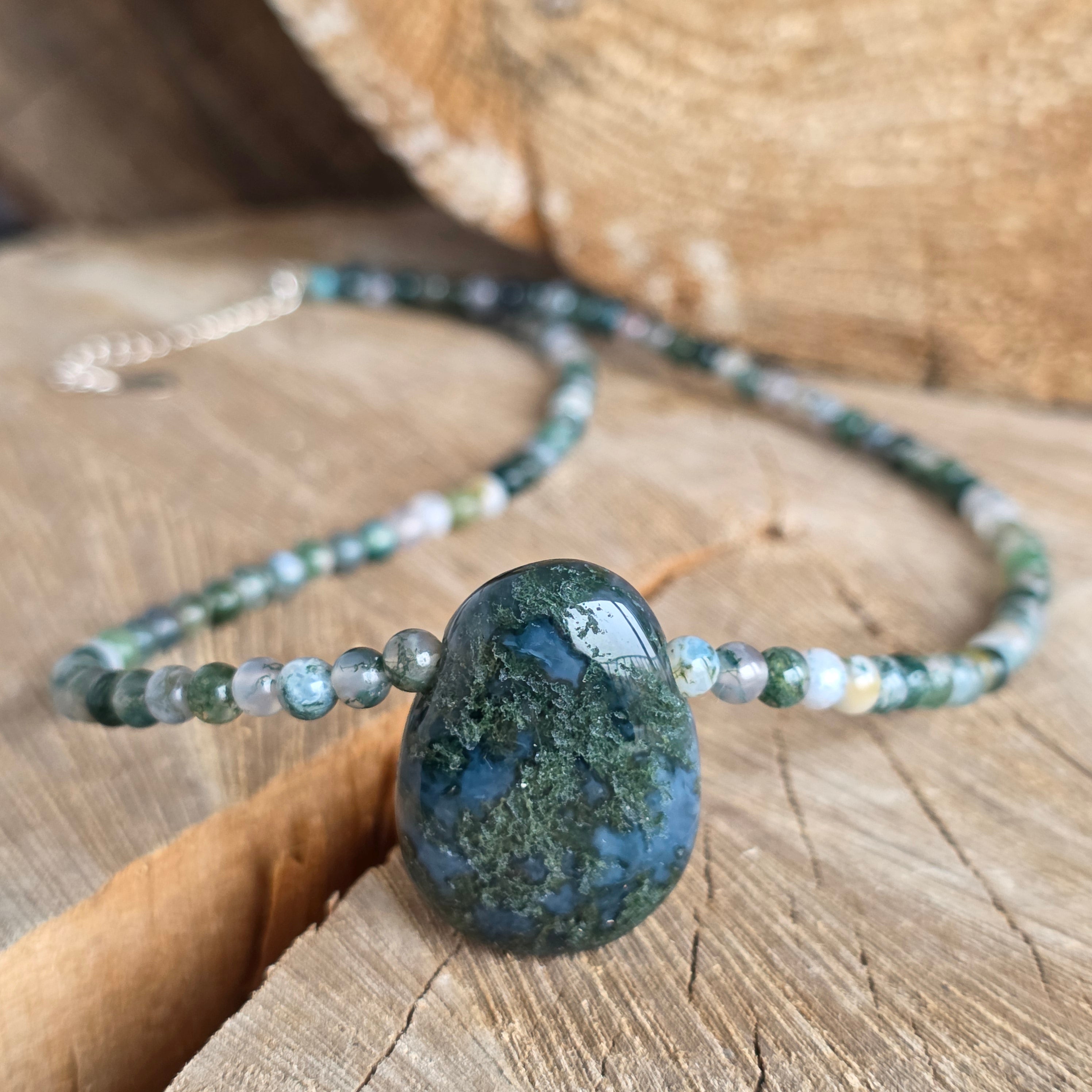 Egy nyaklánc, mint egy mini erdő, a nyakra viselve – zöld, organikus, tele élettel és titokkal. A 4 mm-es szövőmoha achát gyöngyök mini tájakat tárnak fel: áttetsző formák, zöldes erezetekkel átszőve, amelyek moharétegekre, levelekre és gyökerekre emlékeztetnek, melyek a mélységben dobognak.