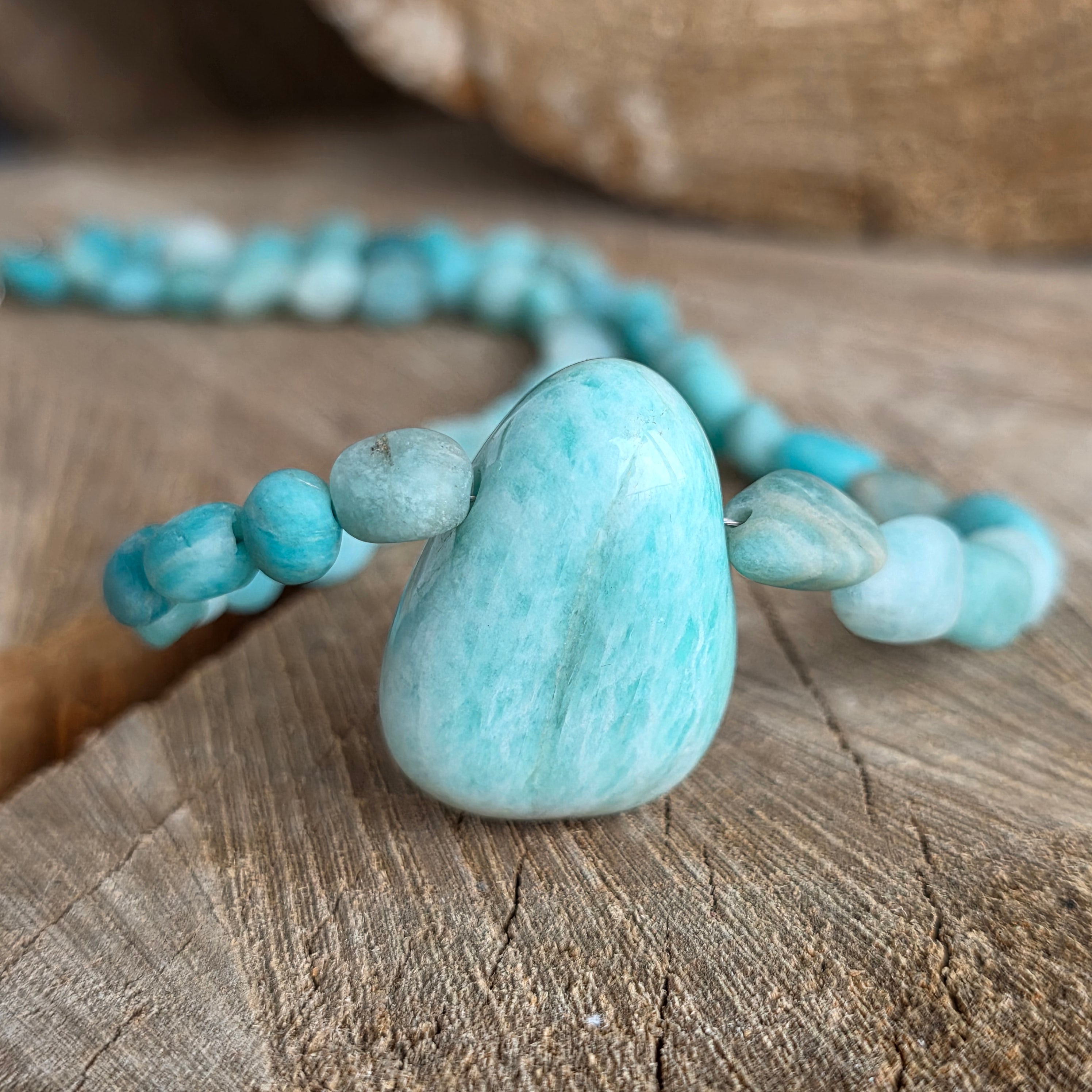 Egy nyaklánc a szent folyók és a nyári borult ég rezgésével – erős, nyugodt és jelentéssel teli. A természetes amazonit gyöngyök, 8-10 mm átmérővel, zöldes-kék friss árnyalatokat tárnak fel, amelyeket a természet tökéletlen és autentikus ritmusokban festett.