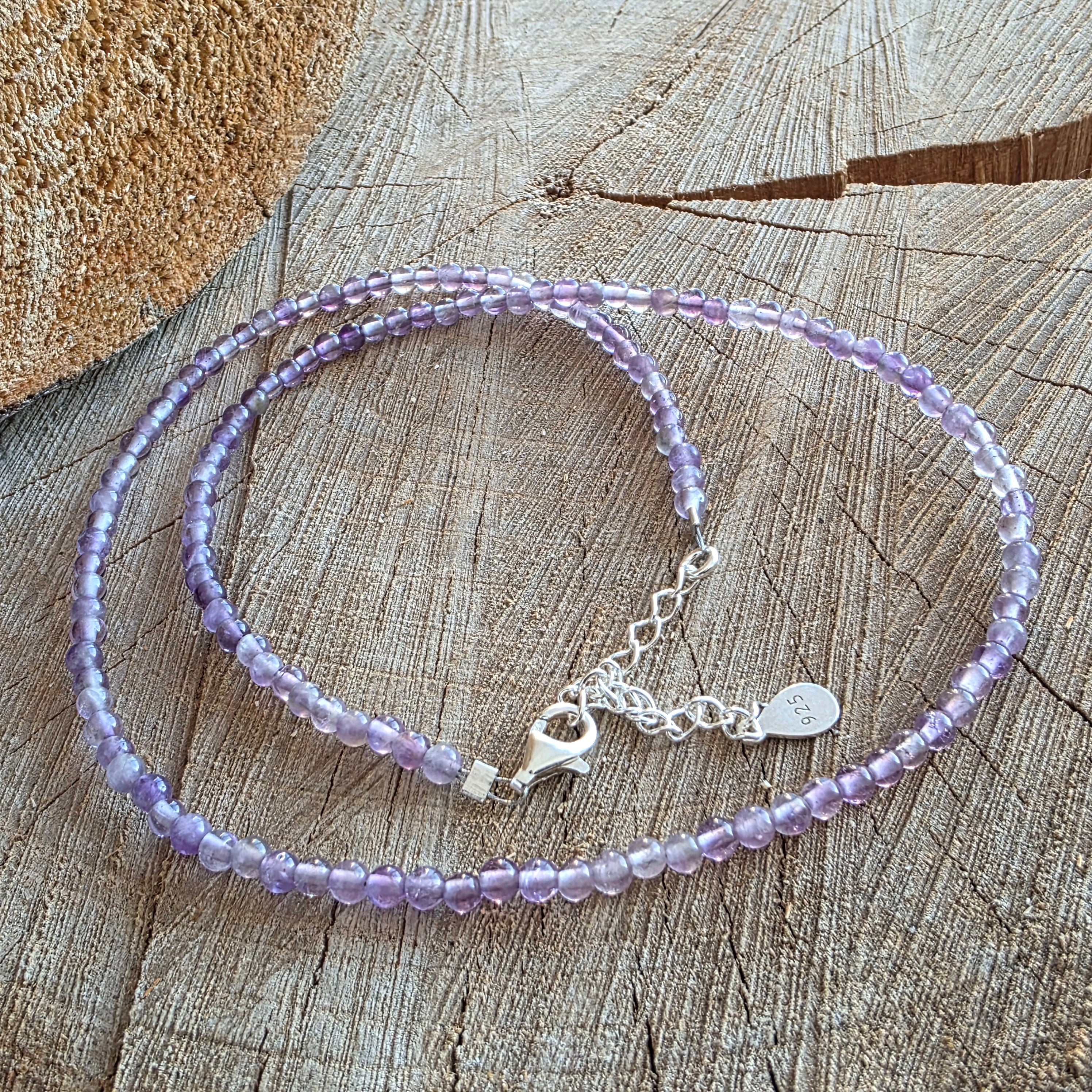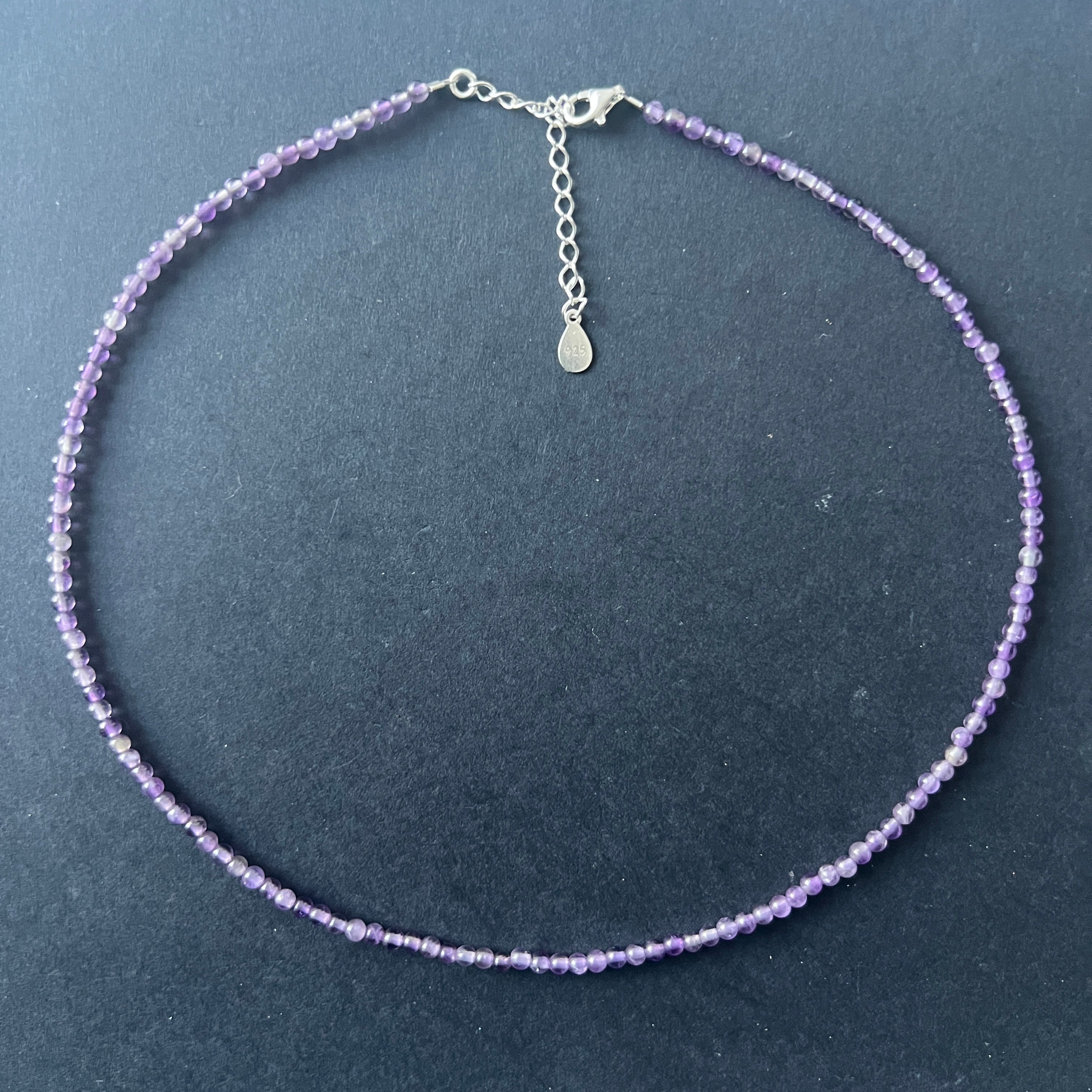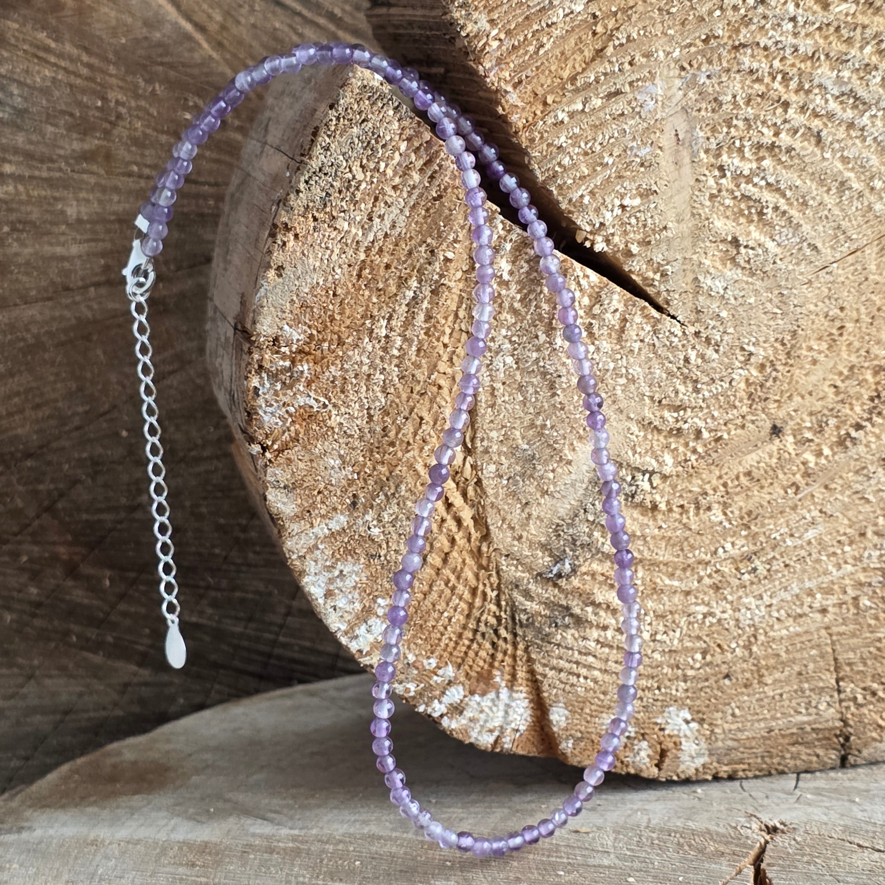 Egy finom nyaklánc, amely a tisztaság és a természetes elegancia nyugodt rezgését kínálja. A 3 mm-es természetes ametiszt gyöngyök harmonikusan simulnak a nyak vonalára, lágy, majdnem éteri csillogásban visszaverve a fényt.