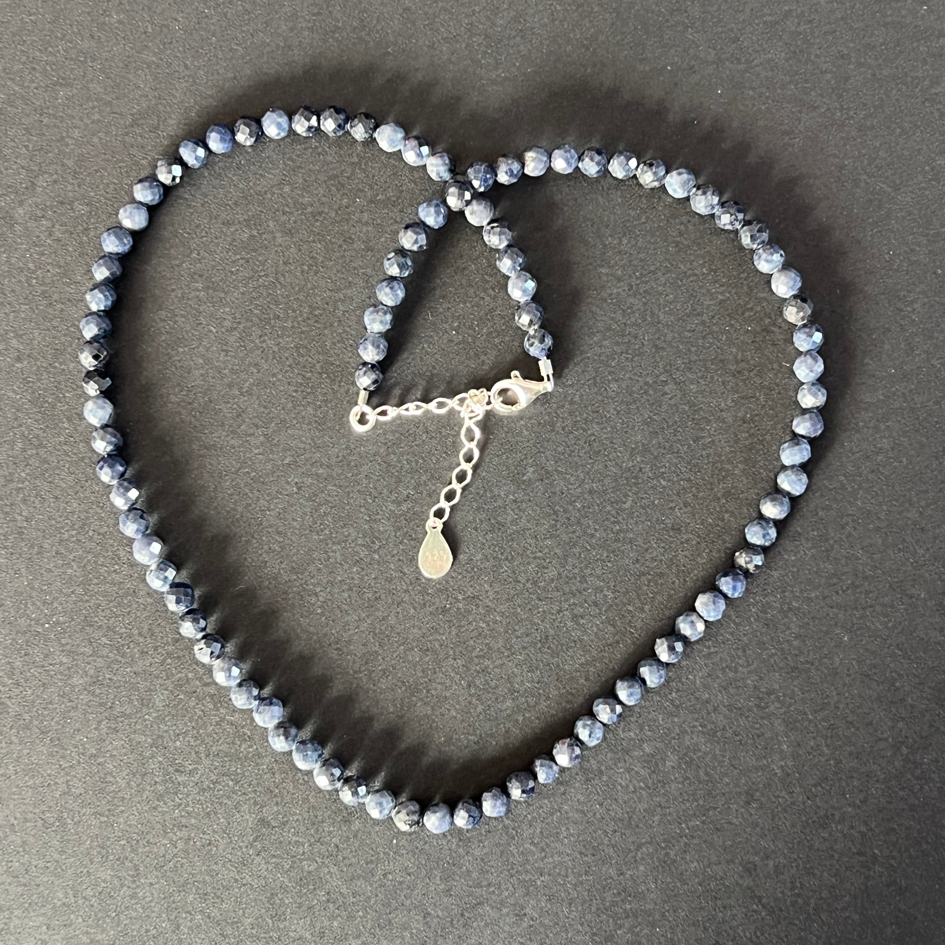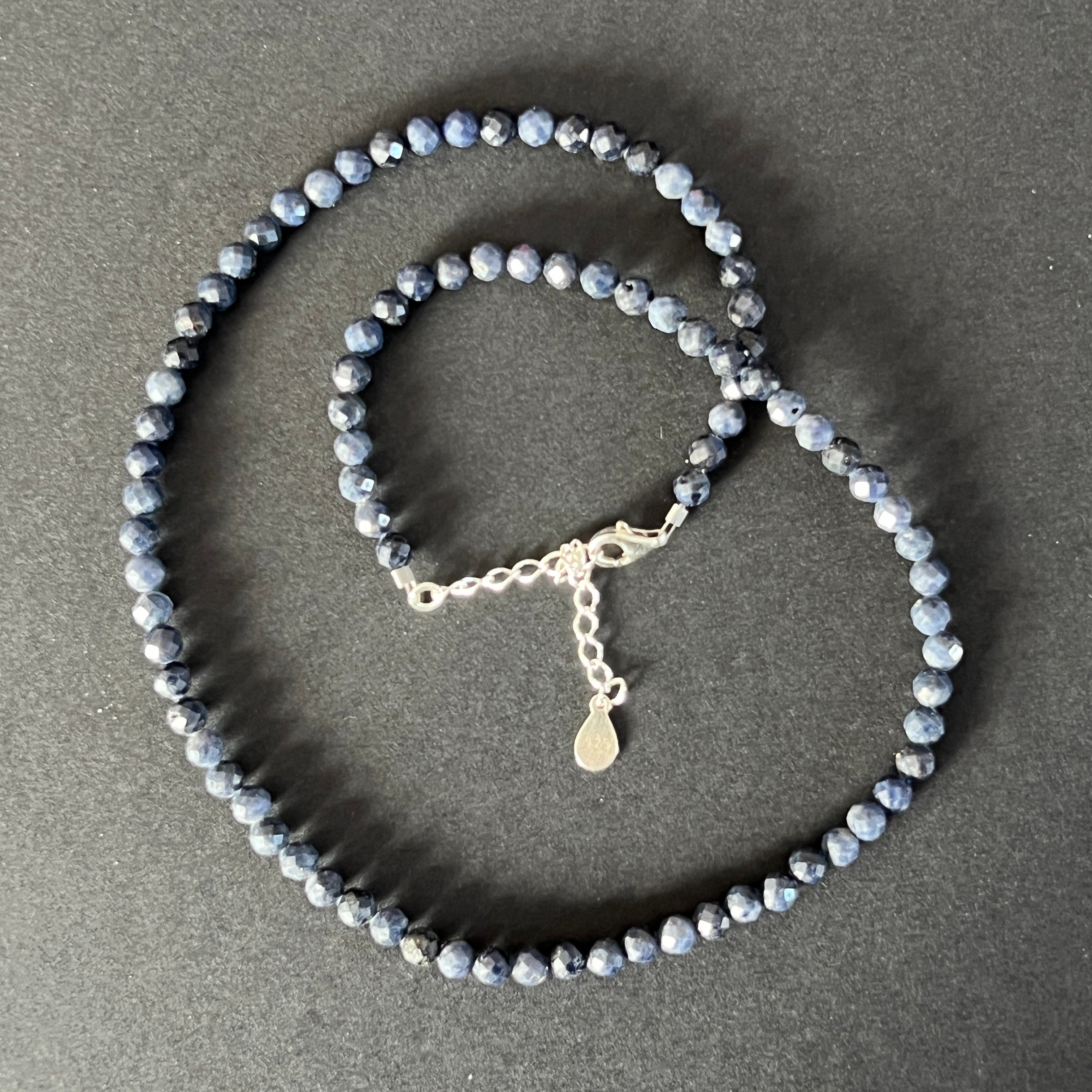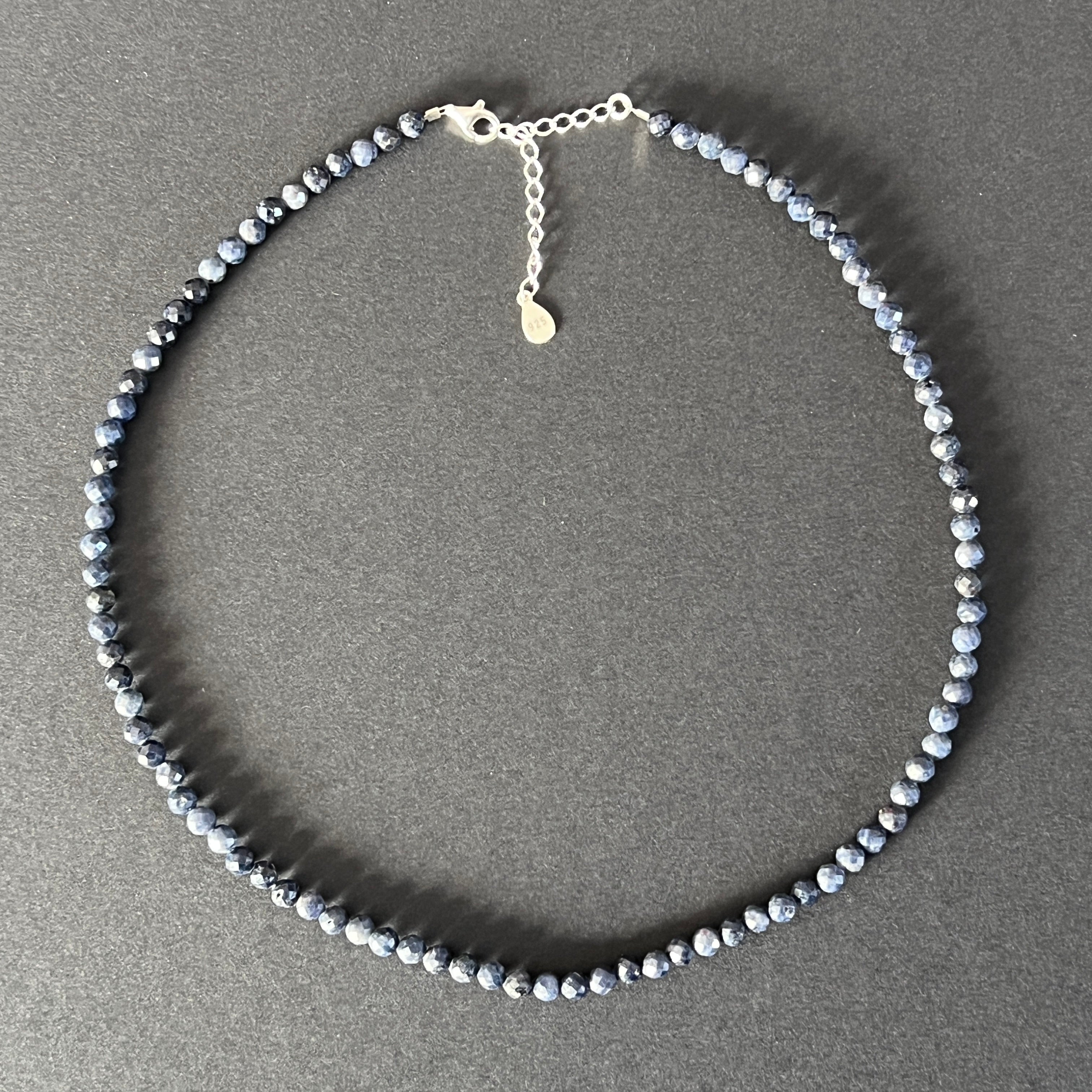 Egy nyaklánc, amely a csillagos éjszaka misztikumát és a kék ég mélységét hozza a nyakadba. A 4-5 mm-es természetes fazettált zafír gyöngyök a drágakő sötét és intenzív tükröződéseit hordozzák, melyek a királyi jelleggel és a belső erővel kapcsolatosak.