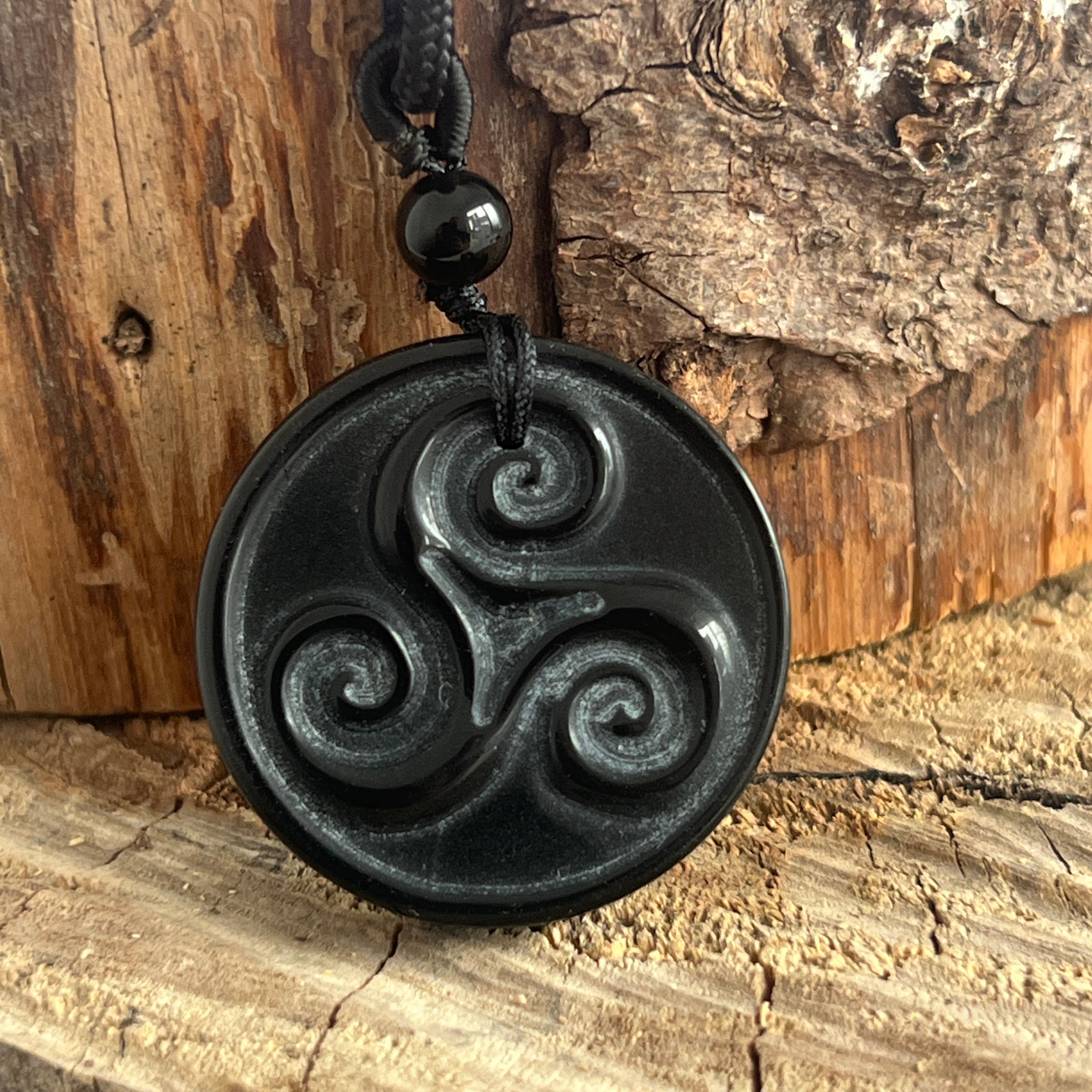 Természetes obszidián medál nyaklánc | Triskelion kelta spirál