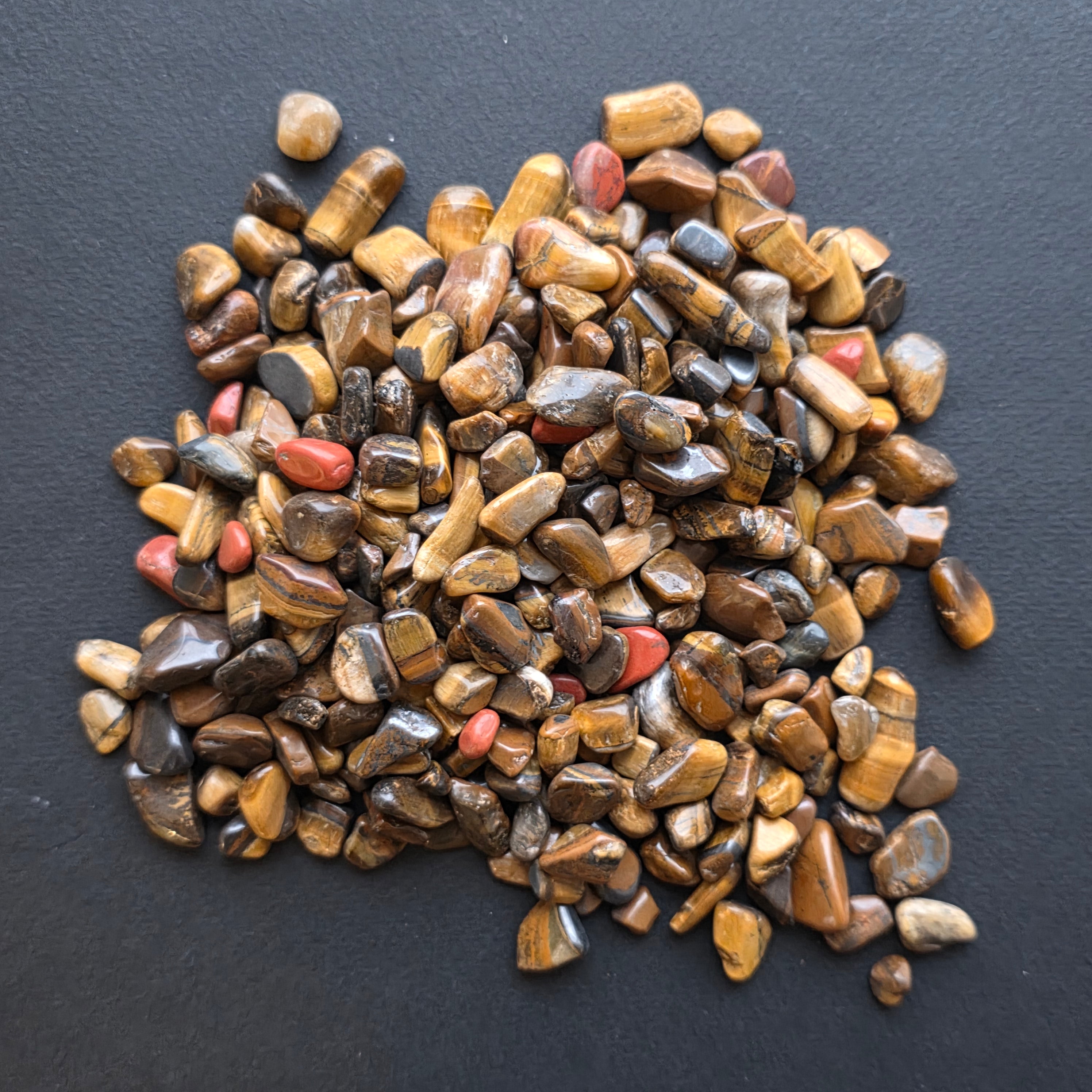 A kövei 6-8 mm szabálytalanok, mindegyiknek megvan a maga fényjátéka. Egyes chipek aranyosabbak, mások vörösesbarnák, és vannak olyan világos csíkok, amelyek változó látószöggel mozognak. Együtt vizuálisan élénk, energikus és mélyen természetes keveréket hoznak létre.