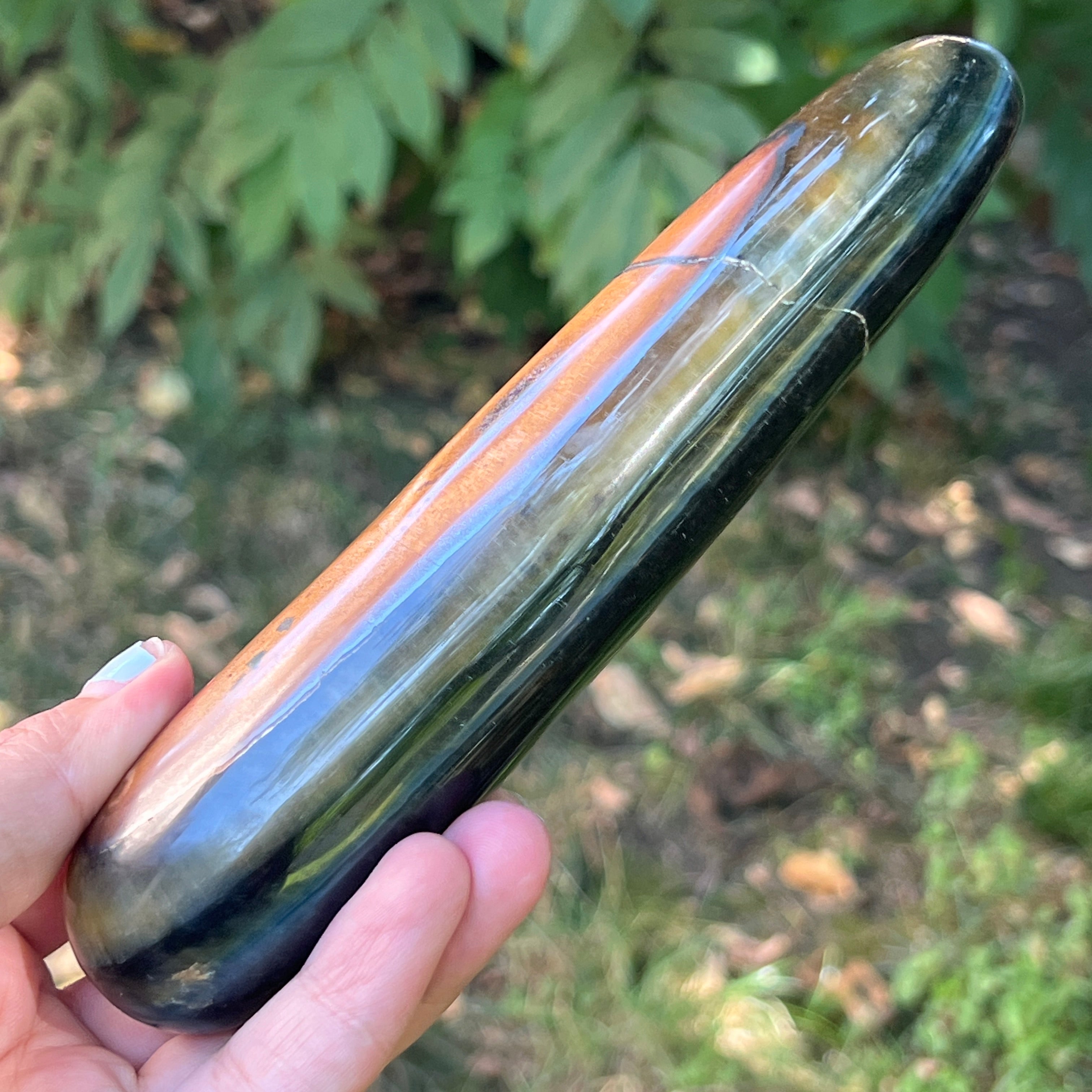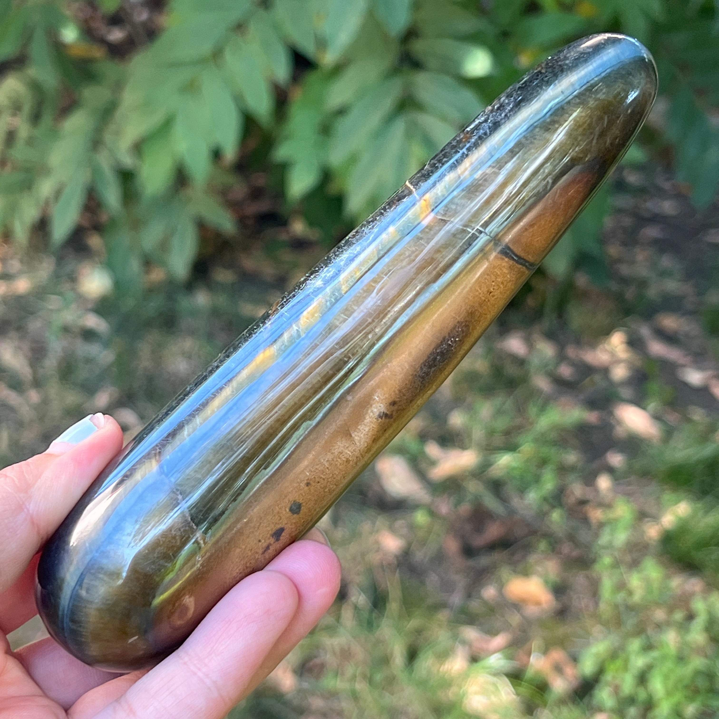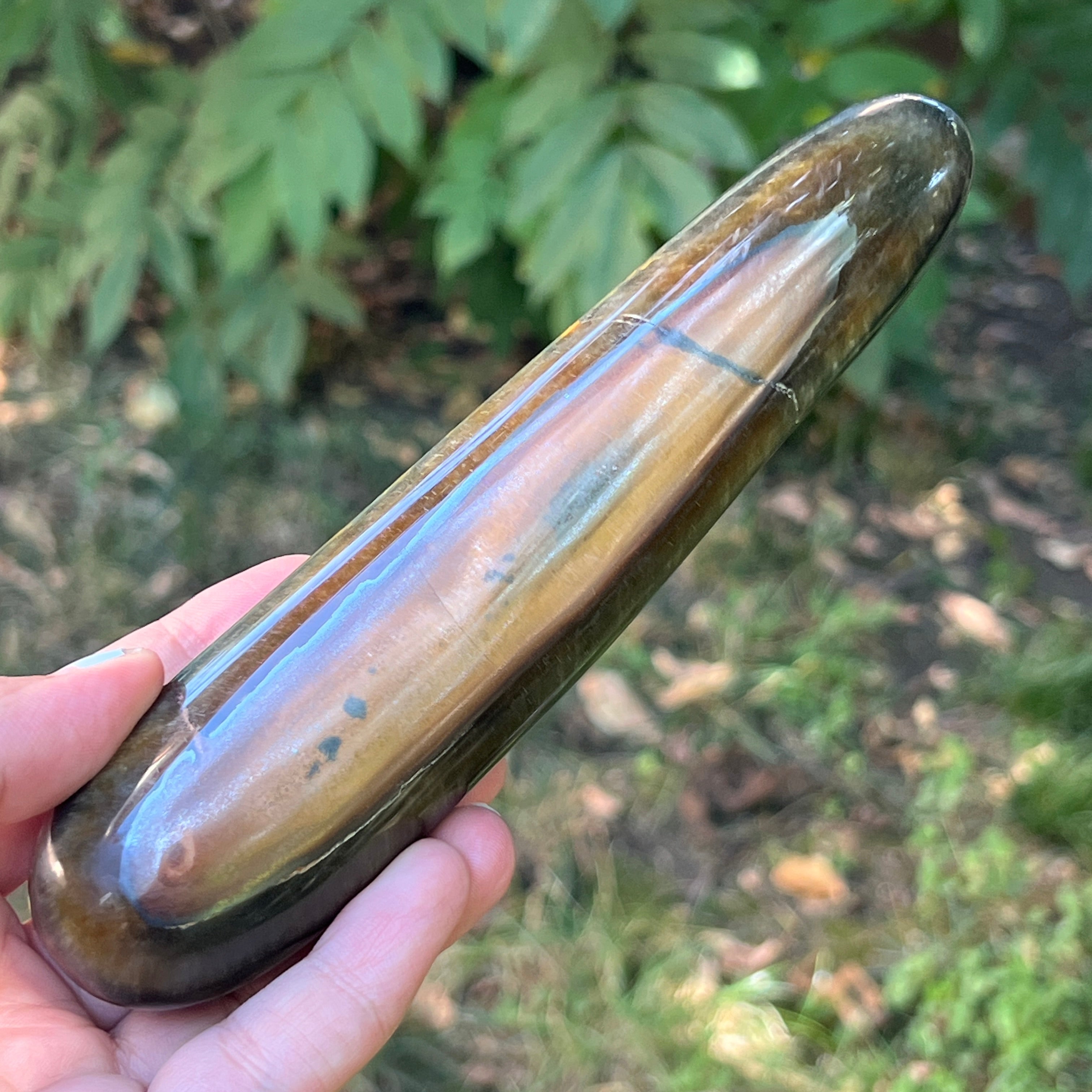 Ez a tigrisszem masszázspálca egyedi darab, faragott és csiszolt, hogy a Föld koncentrált energiáját ergonomikus formáján keresztül irányítsa, ideális gyógyító rituálékhoz, energetikai masszázshoz vagy mély relaxációhoz.