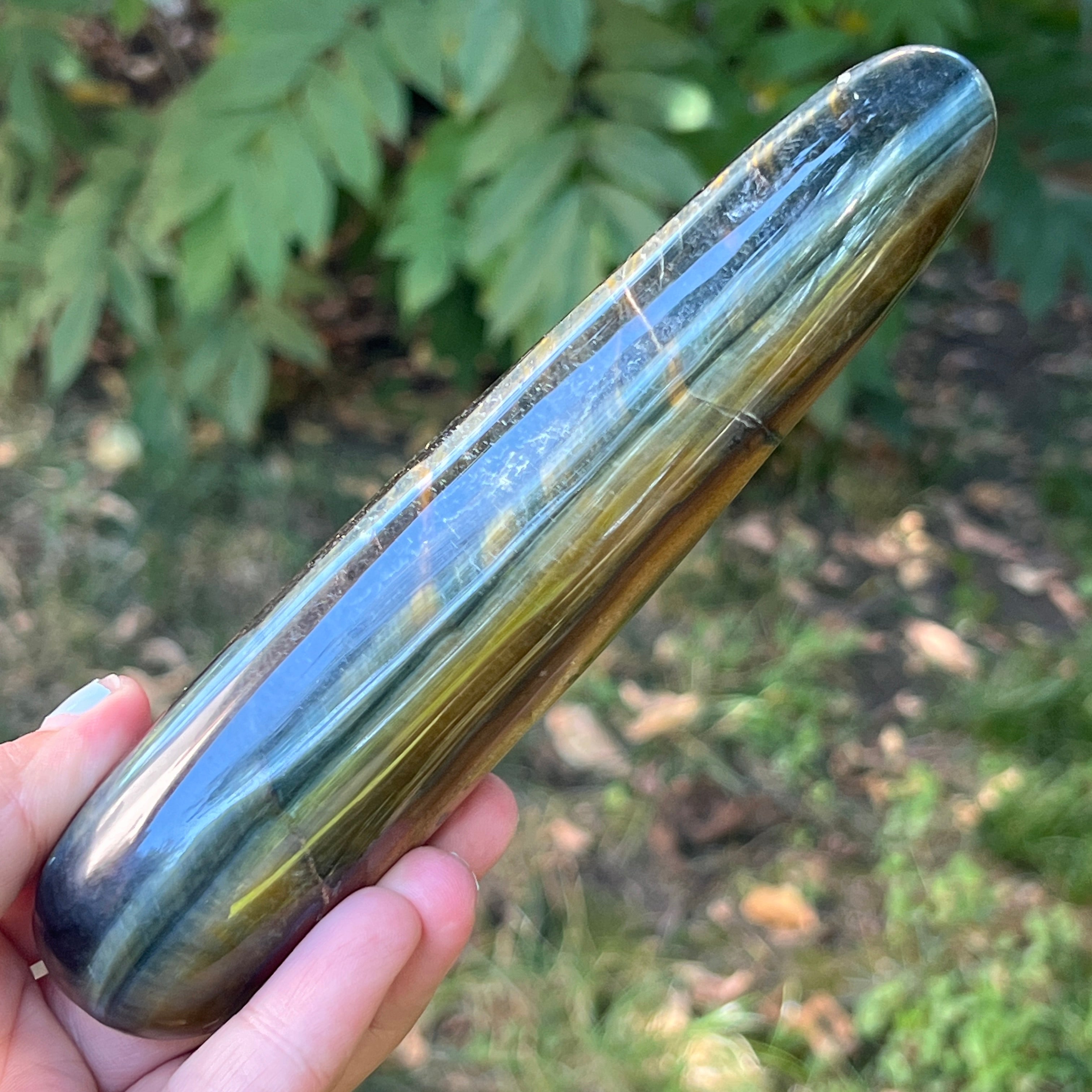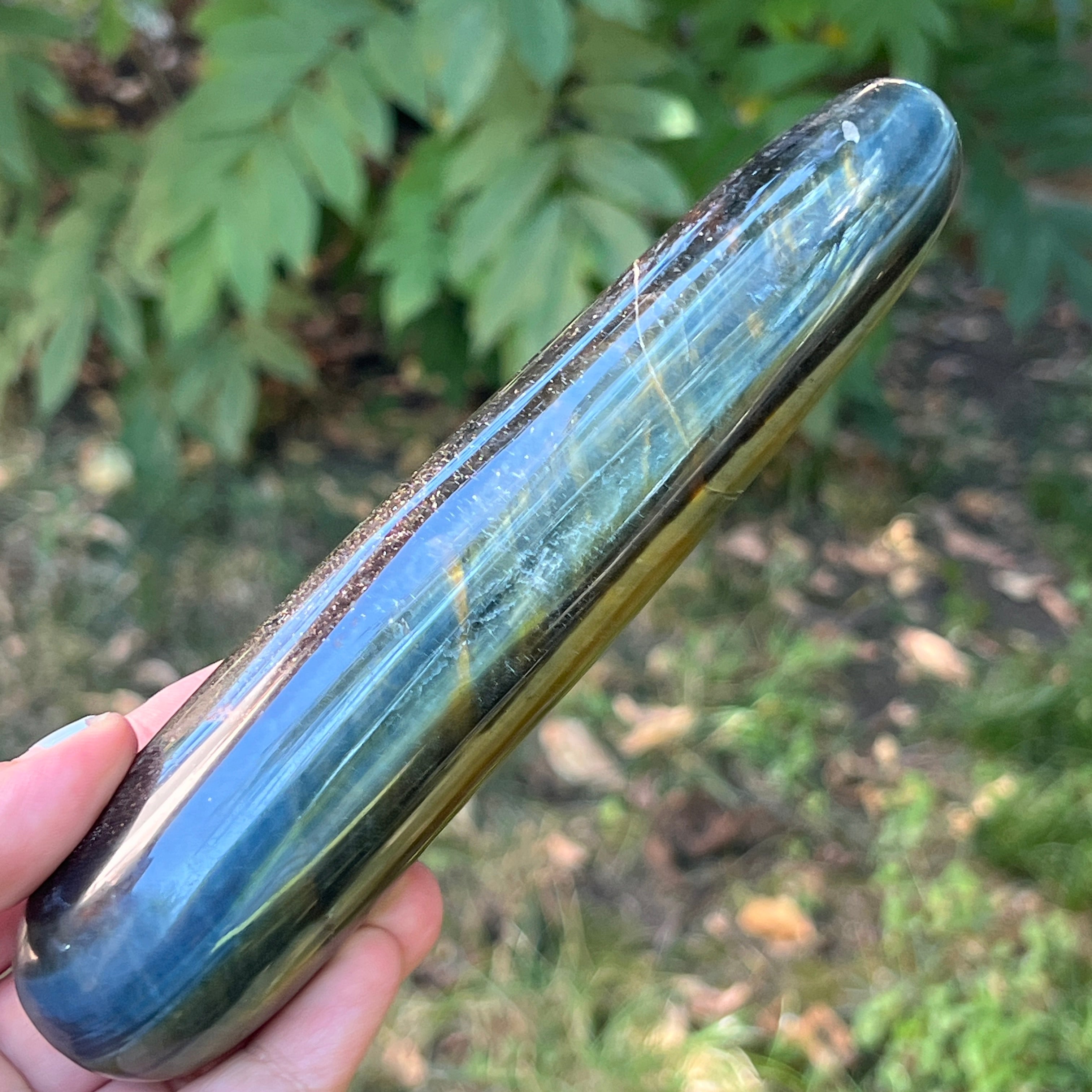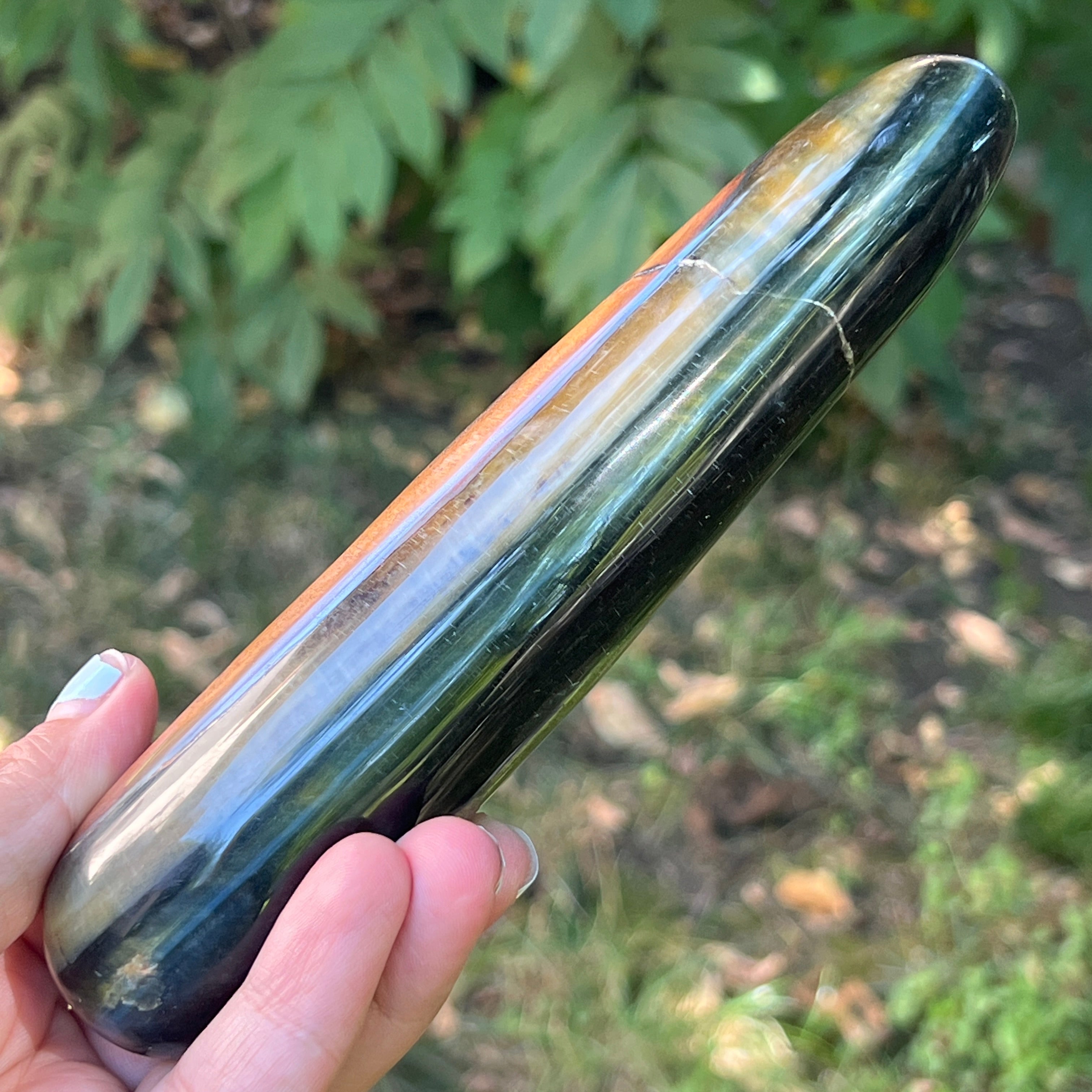 Ez a tigrisszem masszázspálca egyedi darab, faragott és csiszolt, hogy a Föld koncentrált energiáját ergonomikus formáján keresztül irányítsa, ideális gyógyító rituálékhoz, energetikai masszázshoz vagy mély relaxációhoz.