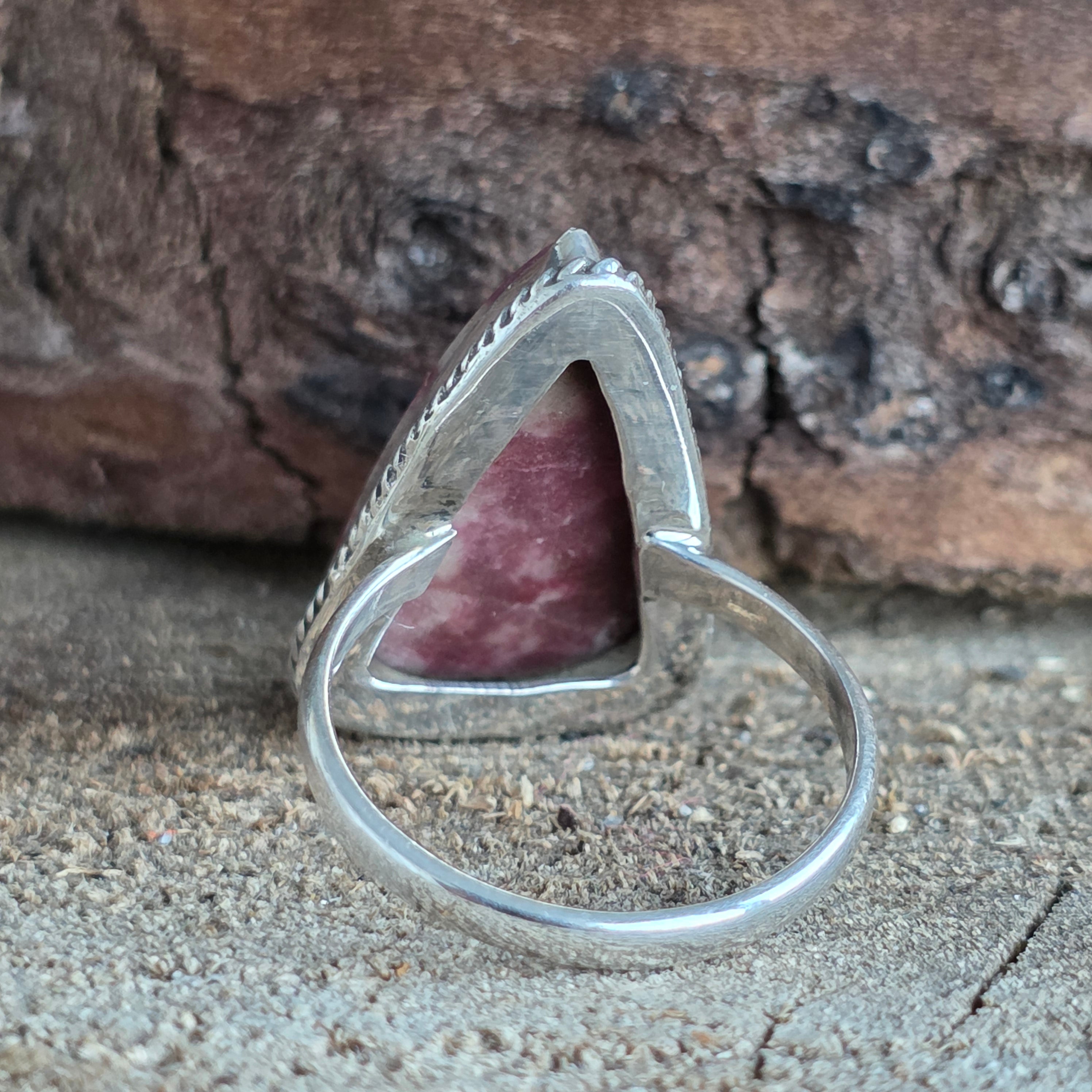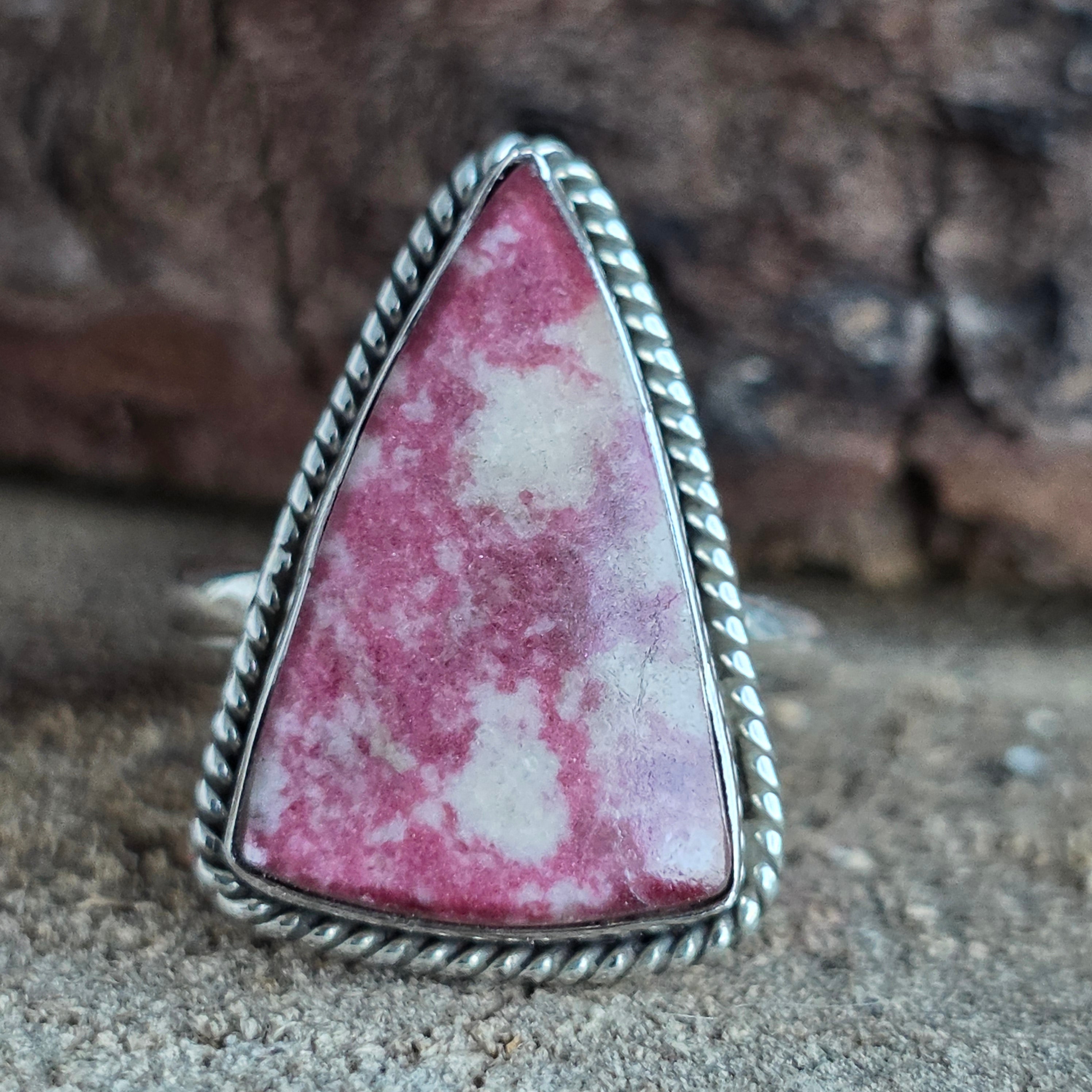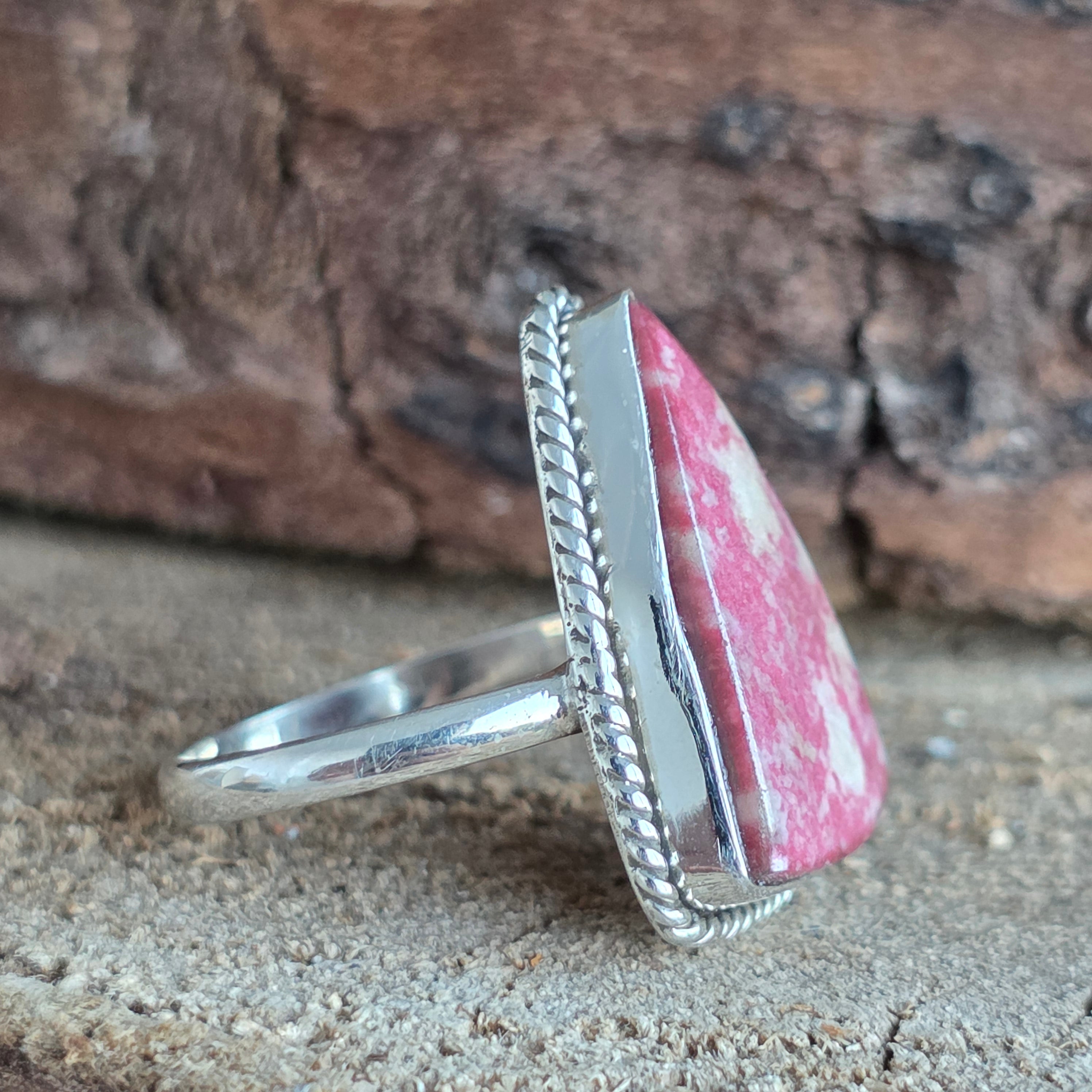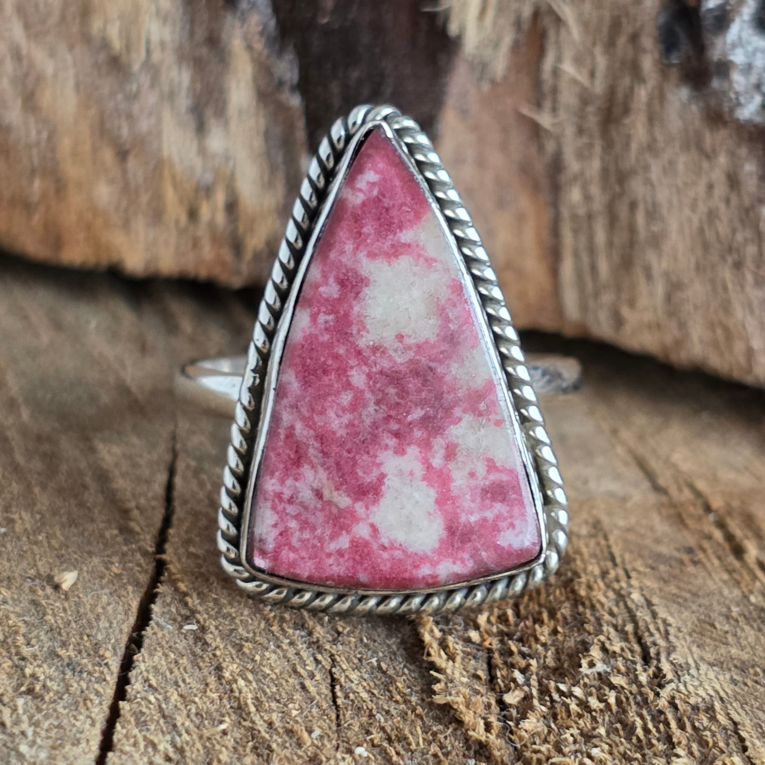 Egy 925-ös ezüstből készült gyűrű, amely magában hordozza az északi föld energiáját – Tulit, egy rózsaszín zoizit változat, természetes textúrával és finom színárnyalatokkal a lazacrózsaszín, fukszia és mészfehér között.