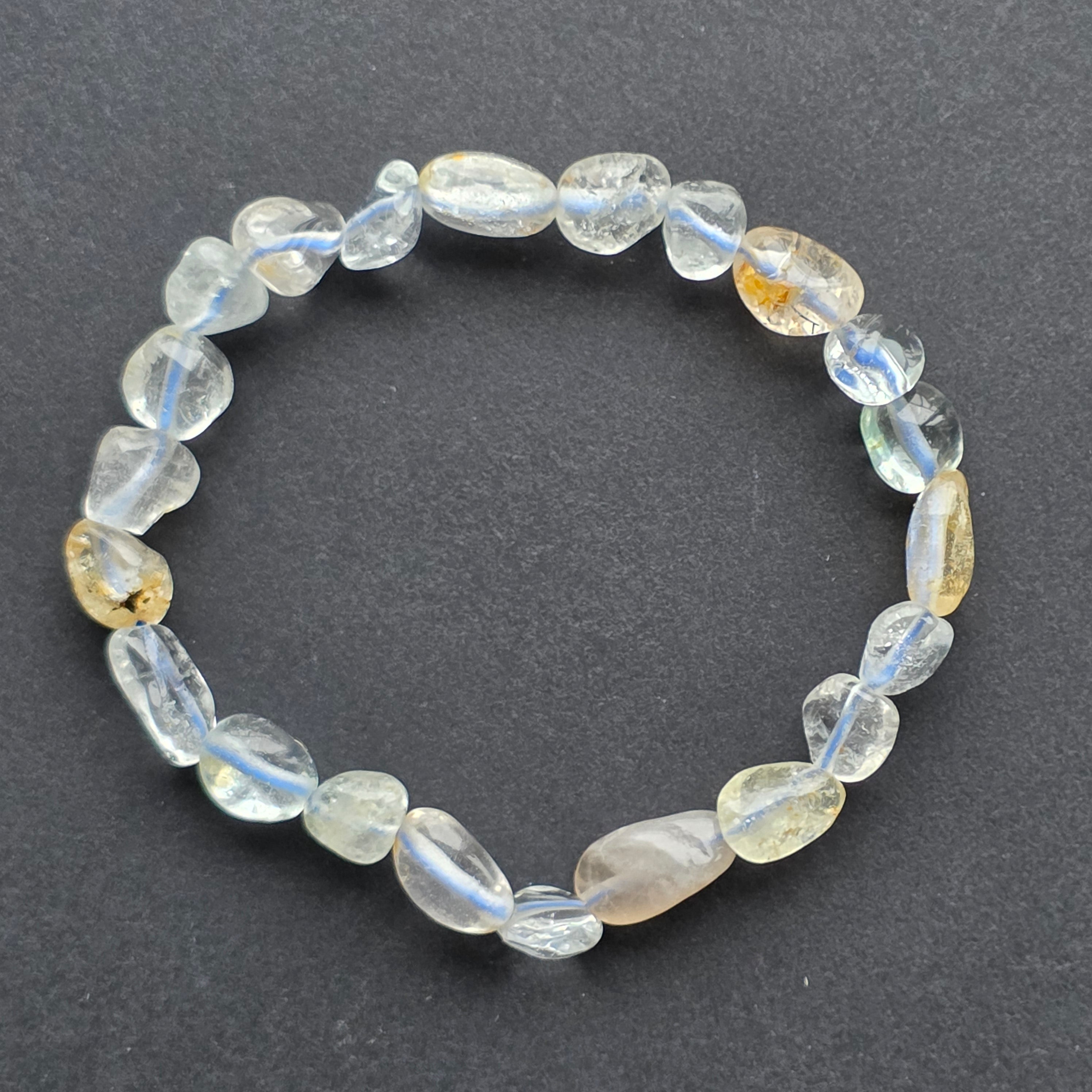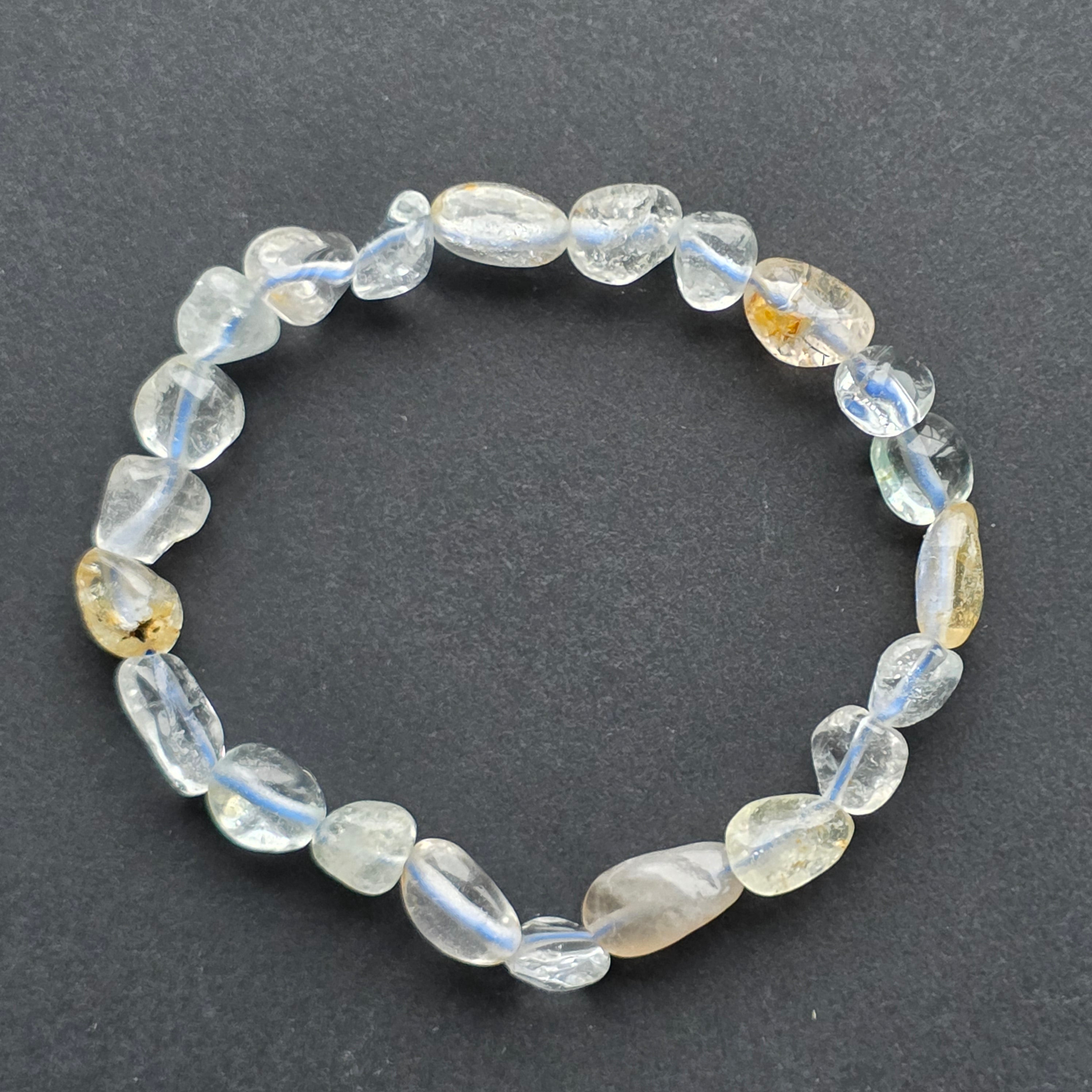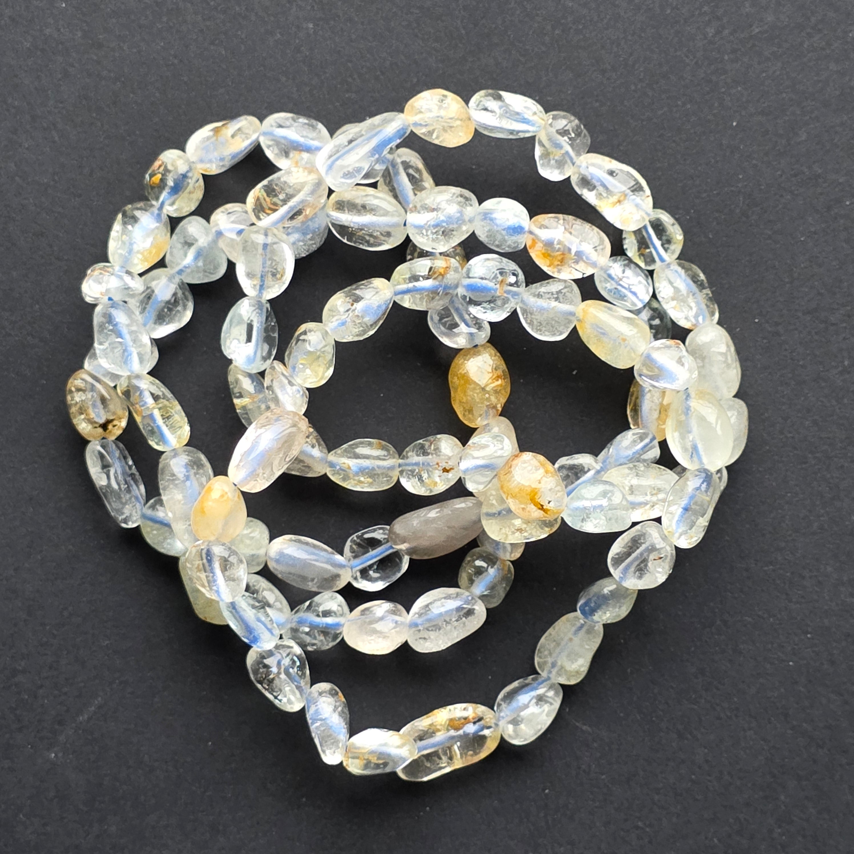 A Tumble topáz karkötő a fény ünneplése a legtisztább formájában. A sima, természetesen kerekített kavicsok finom árnyalatjátékot teremtenek – halványkék, meleg sárga és áttetsző darabok, amelyek a fényt úgy ragadják meg, mint a homokon megtörő hullámok. Minden egyes topázdarab organikus, egyedi formájú, mintha magában őrizné saját útjának történetét a természetben.