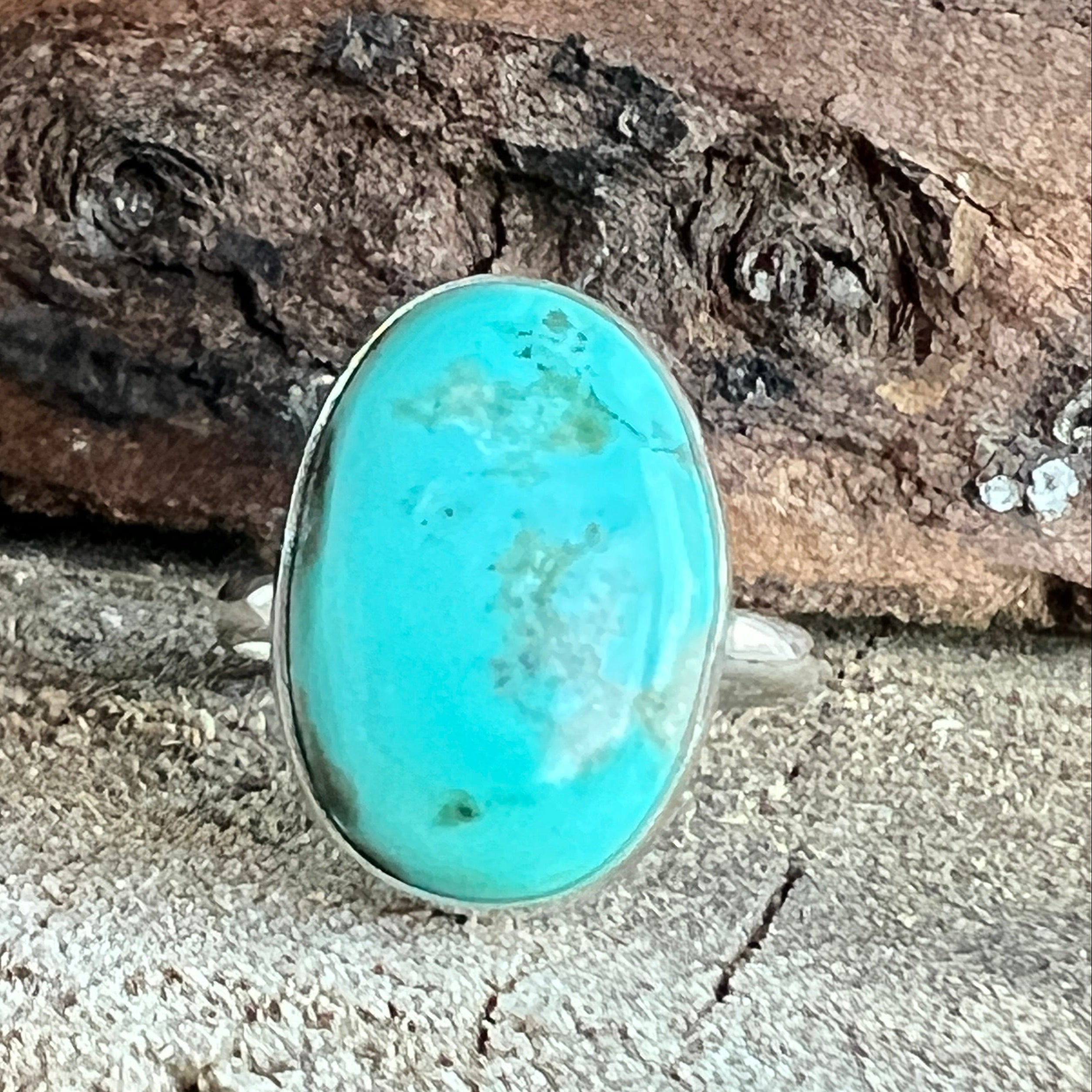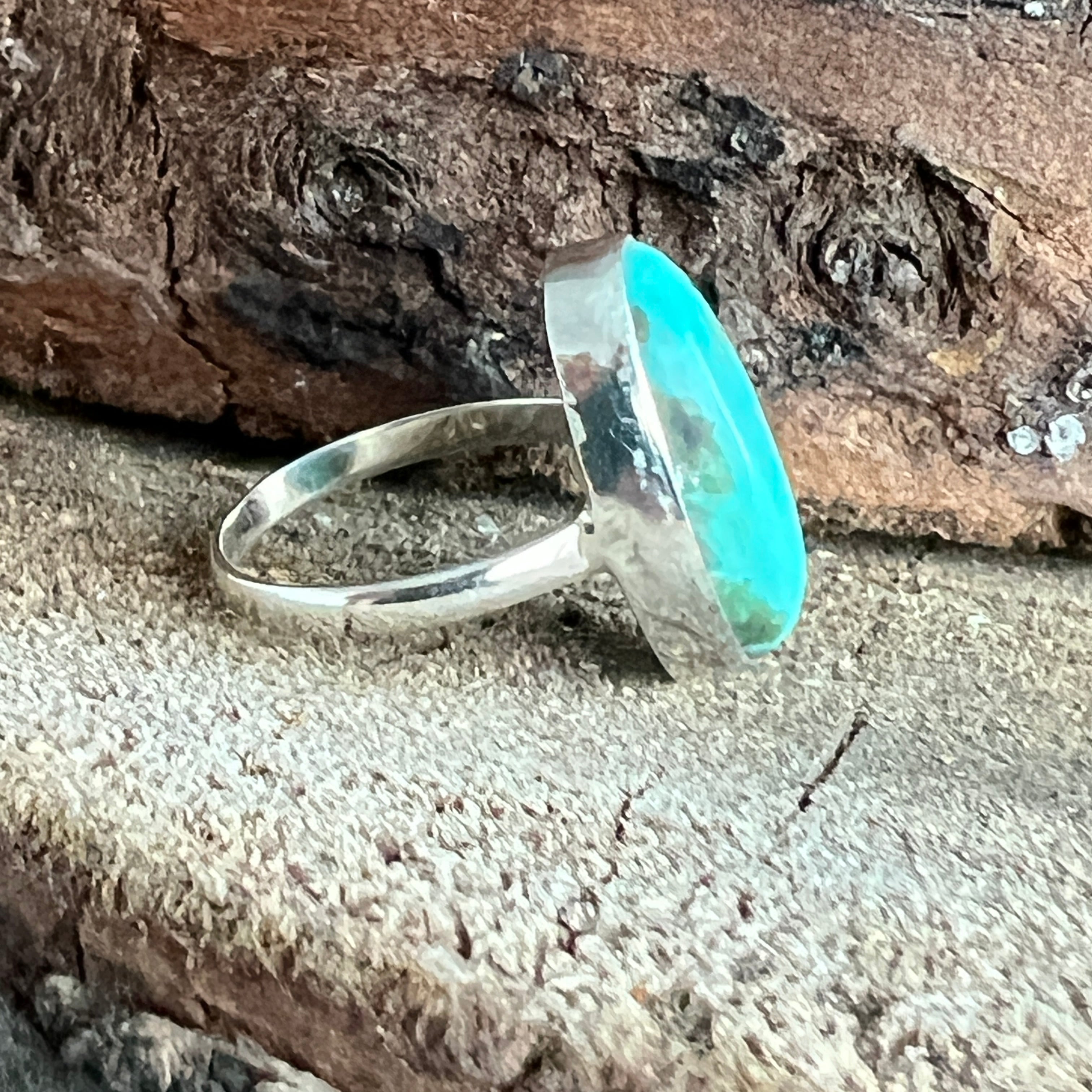 Elegáns gyűrűből készült 925 ezüst, természetes kővel türkiz égi kék és akvamarin zöld árnyalatokkal, finom barna és szürke erekkel átszőve. A minimalista plain collet dizájn a kőre összpontosítja az egész figyelmet, kiemelve organikus szépségét és autentikus textúráját.