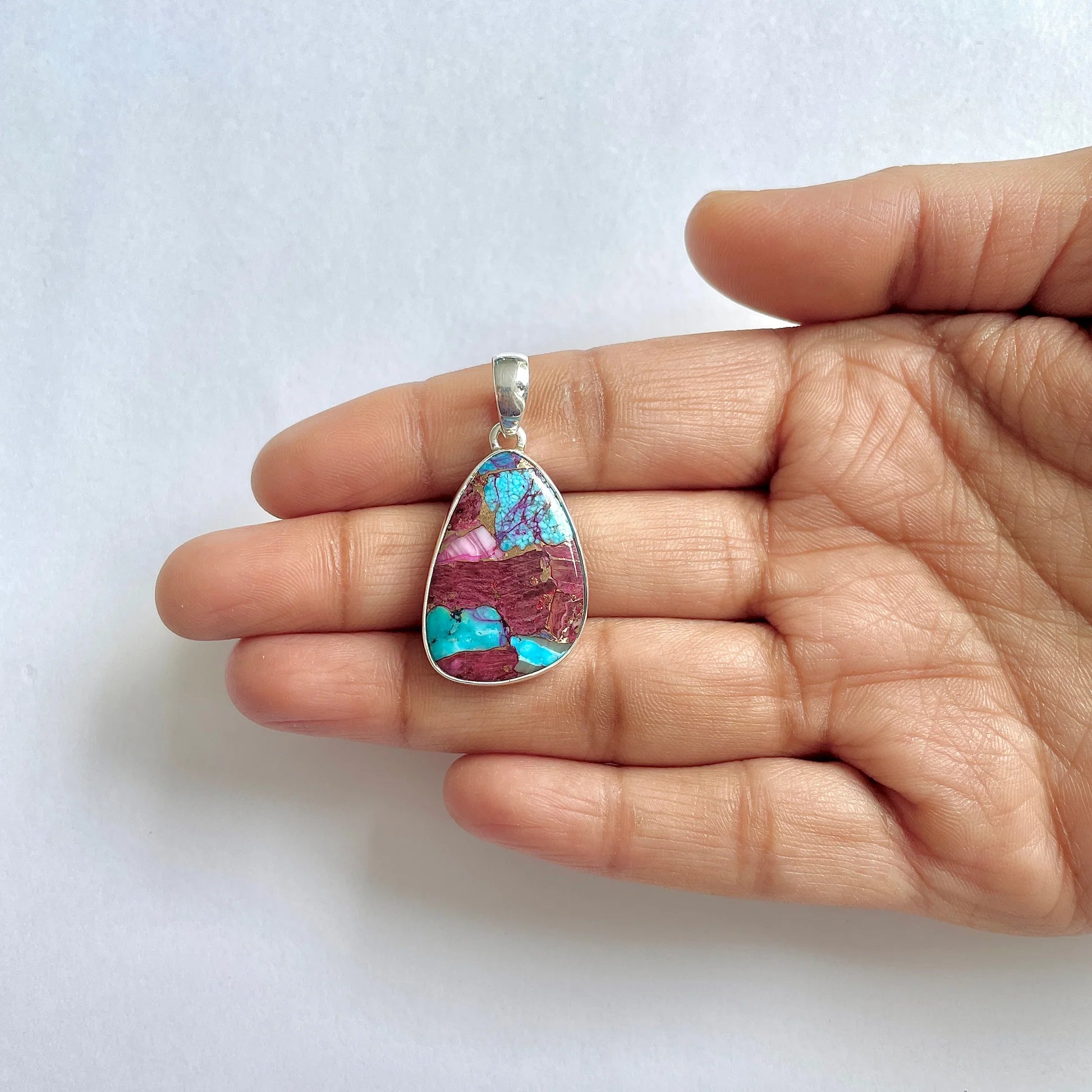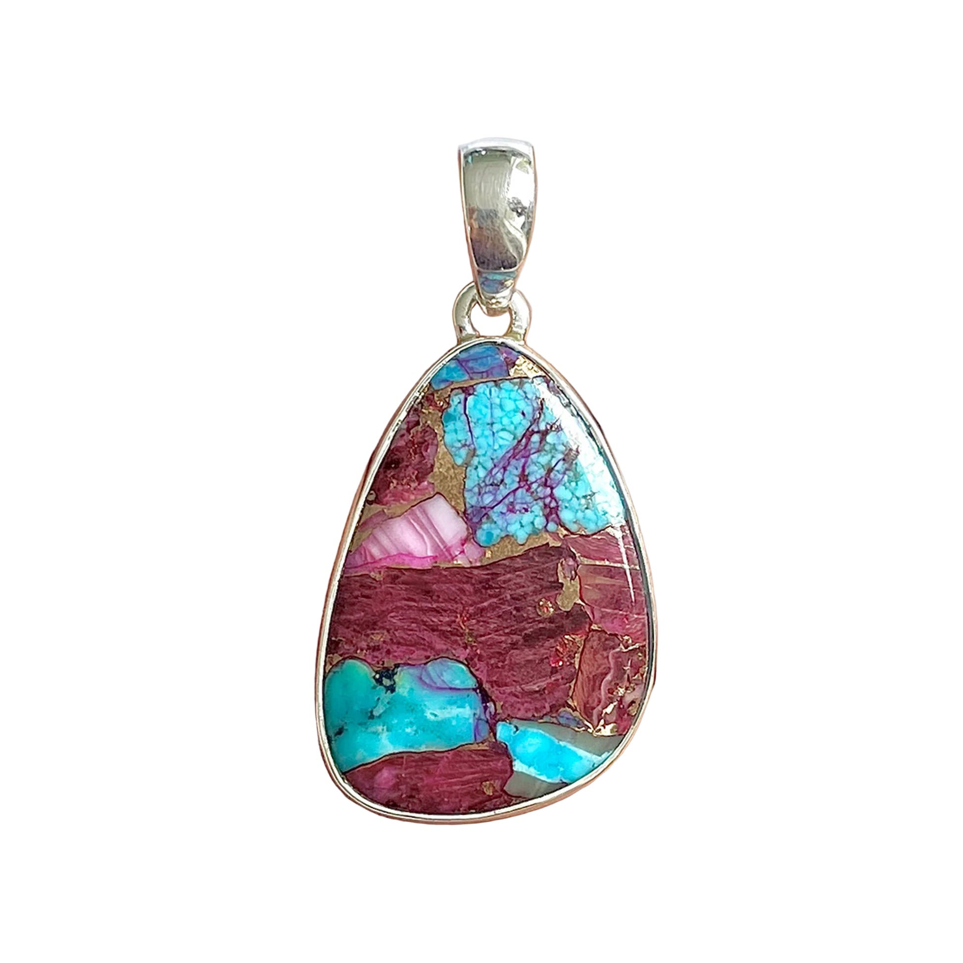 Ez az egyedülálló medál a természet két kincsét egyesíti – Tüskés osztriga és A türkiz – látványos színes mozaikban. A kagyló ibolya, rózsaszín és narancssárga árnyalatai összefonódnak a türkiz intenzív kékjével, eleven ékszert alkotva, amely a tenger és a naplemente találkozását idézi.