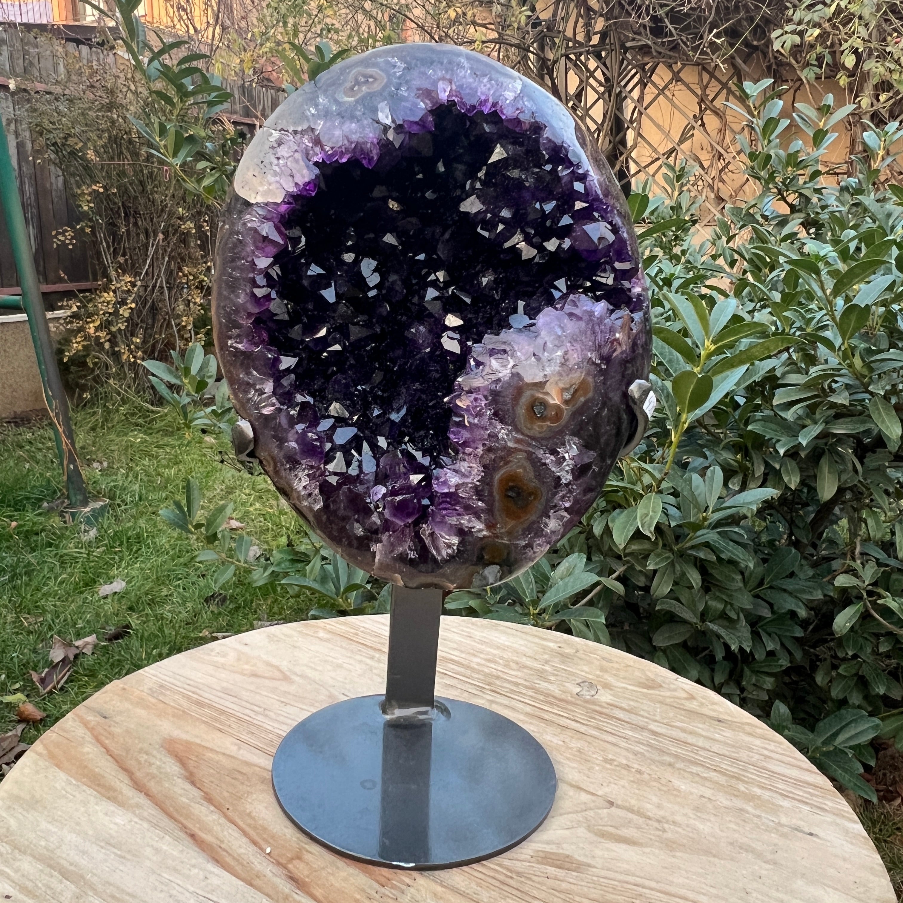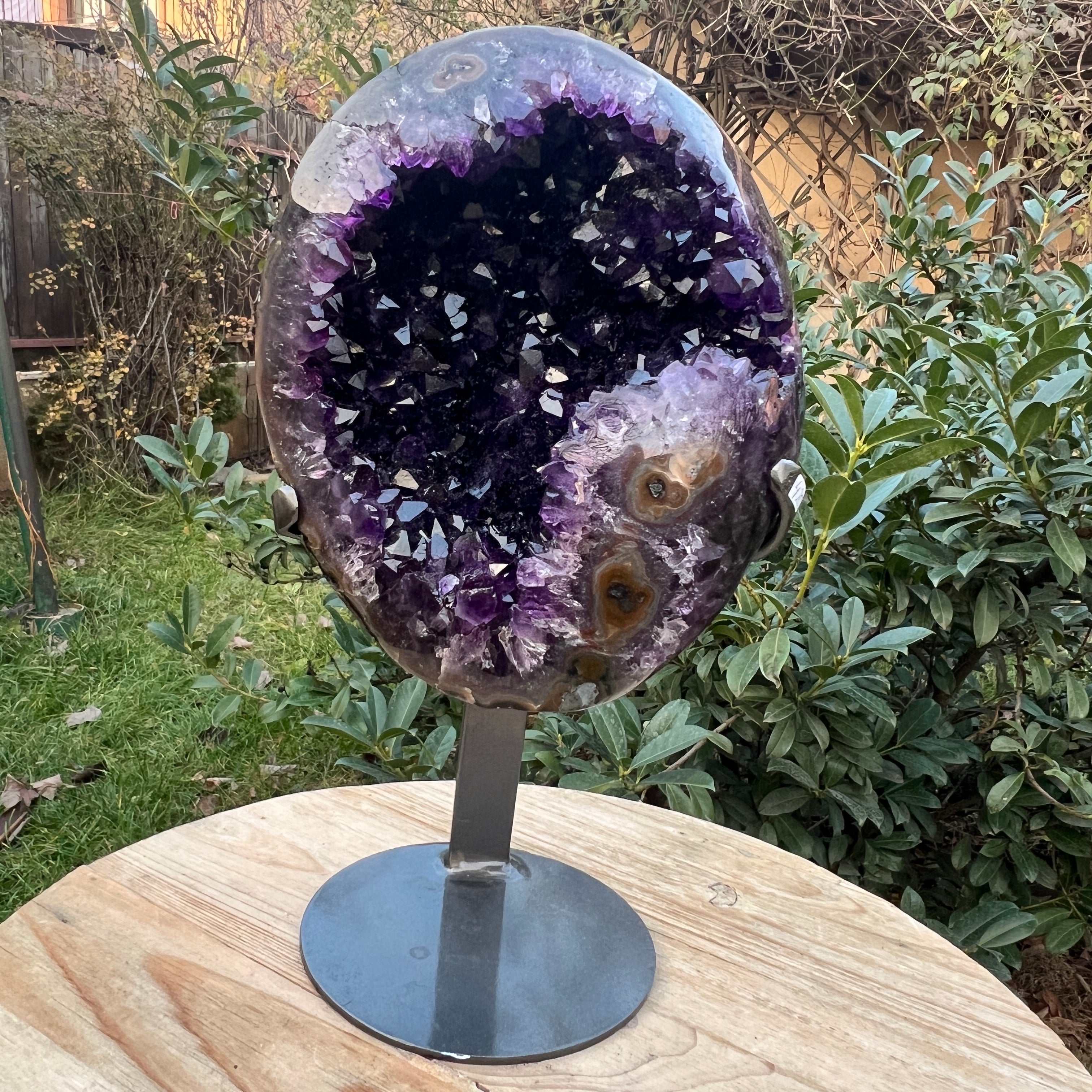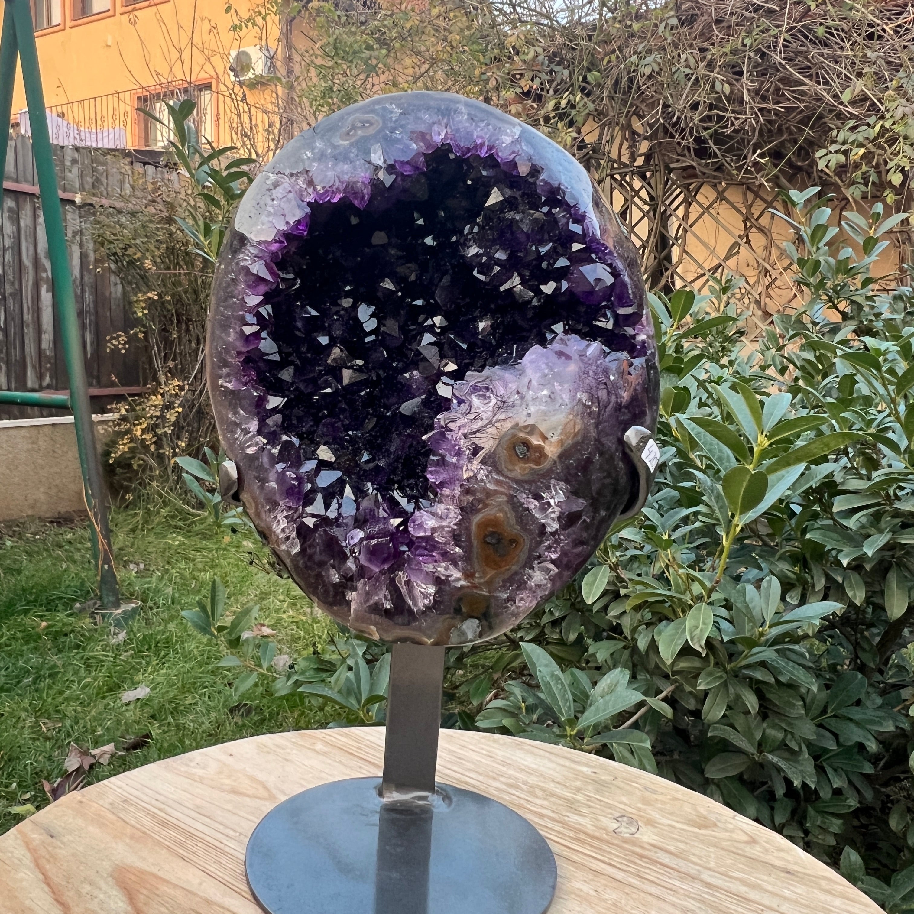 Uruguayi ametiszt geoda állványon, XL2 modell, teljes méret (állvánnyal együtt): 35 cm * 18 * 5 cm, ametiszt geoda mérete (állvány nélkül): 21,5 cm * 18 * 10 cm