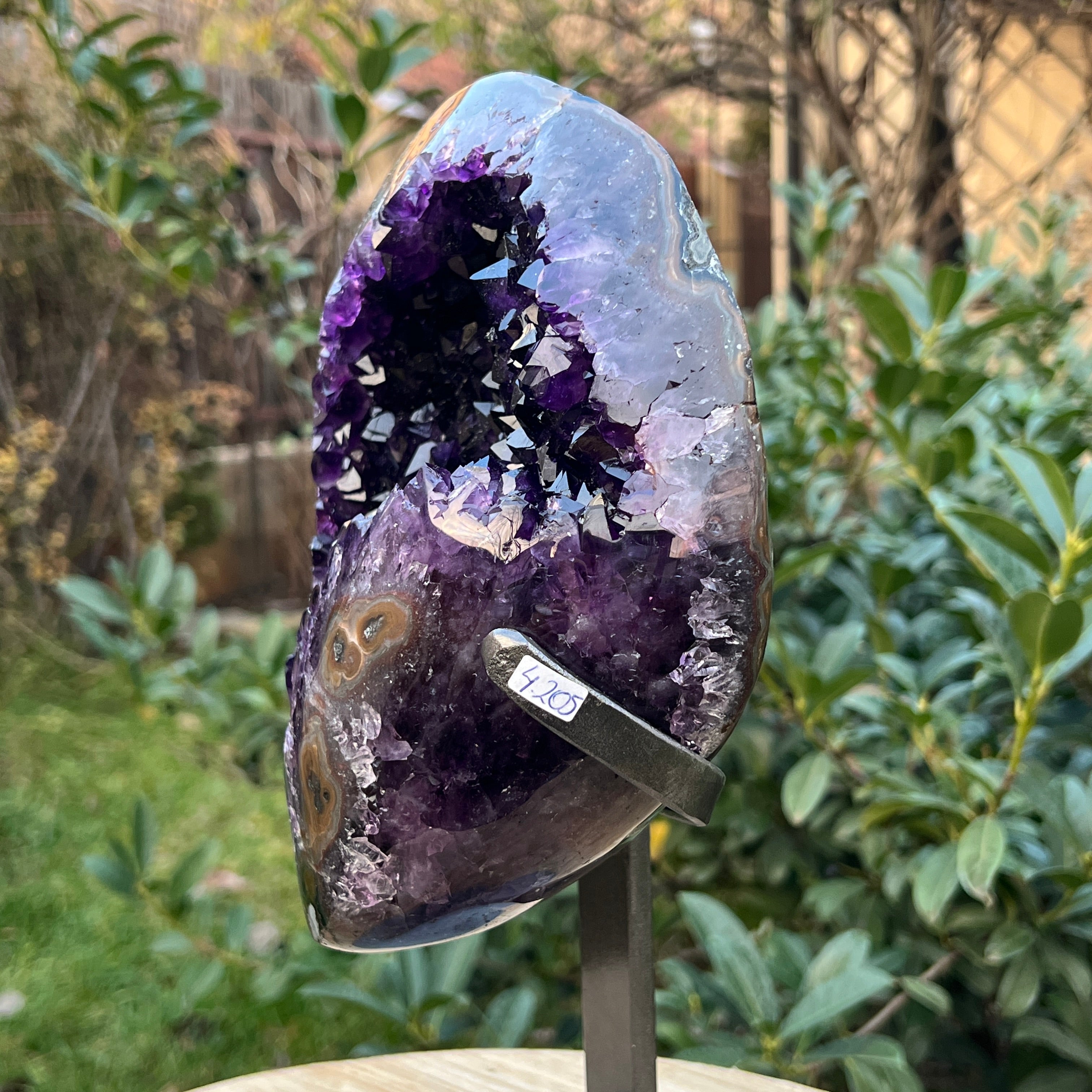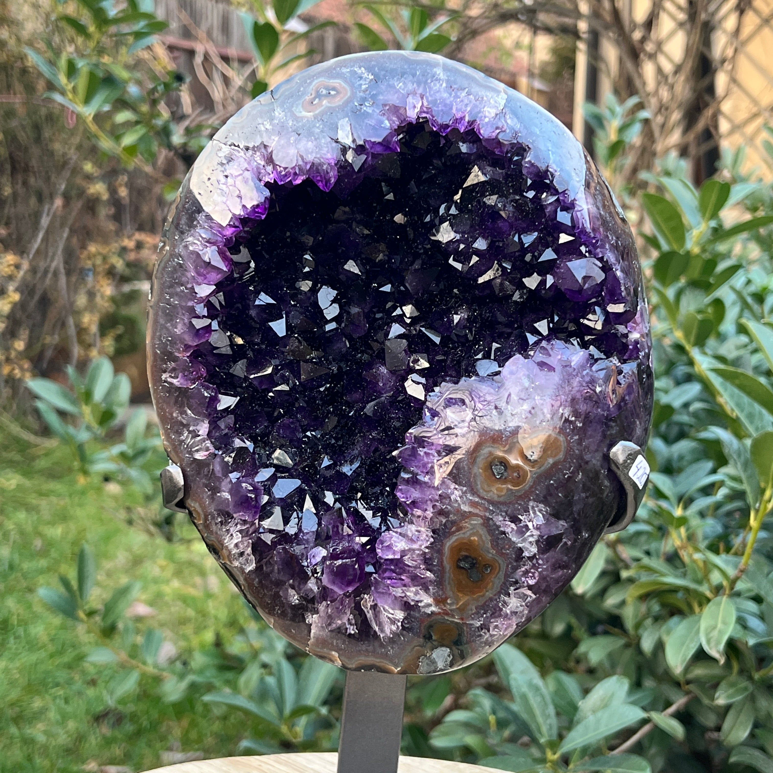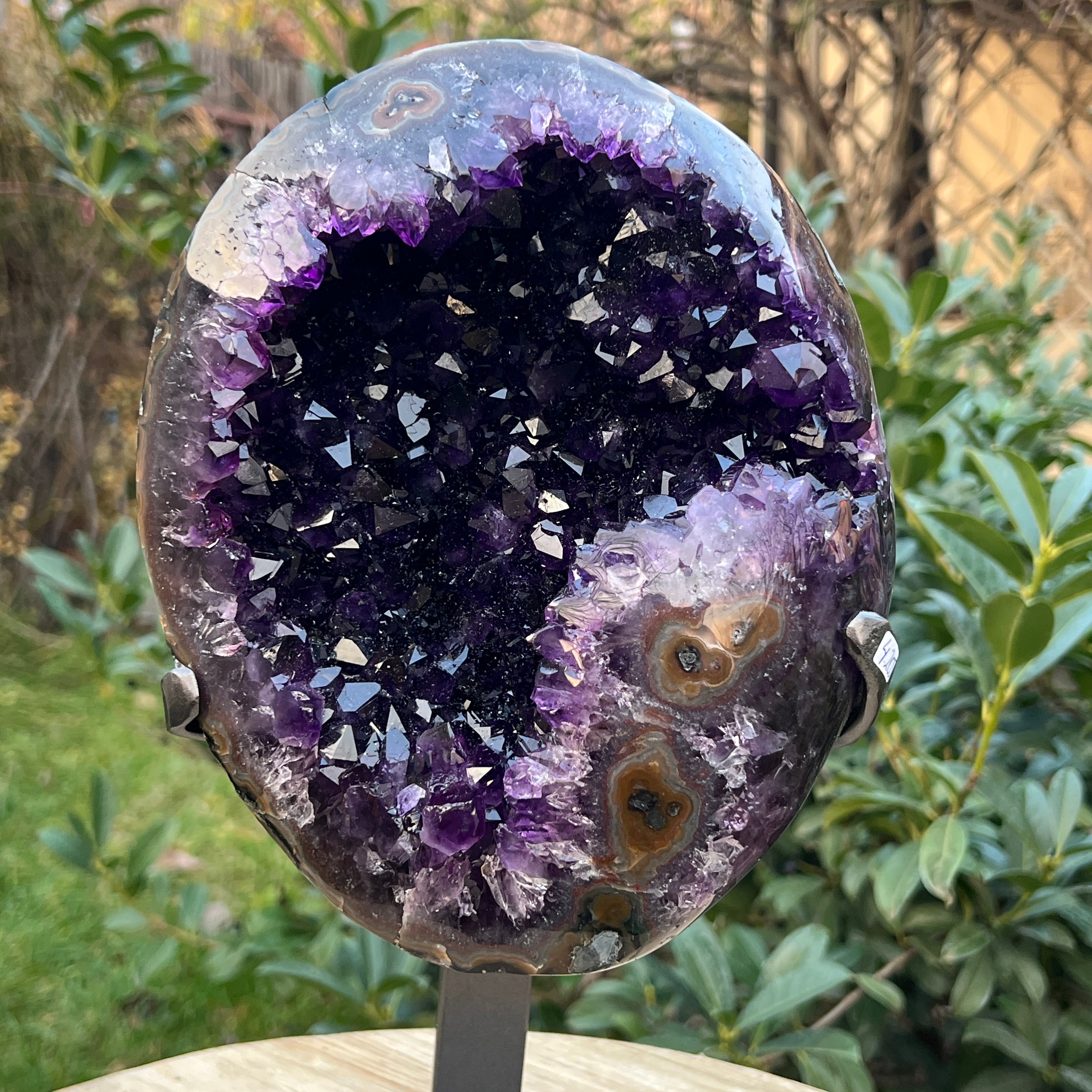 Uruguayi ametiszt geoda állványon, XL2 modell, teljes méret (állvánnyal együtt): 35 cm * 18 * 5 cm, ametiszt geoda mérete (állvány nélkül): 21,5 cm * 18 * 10 cm