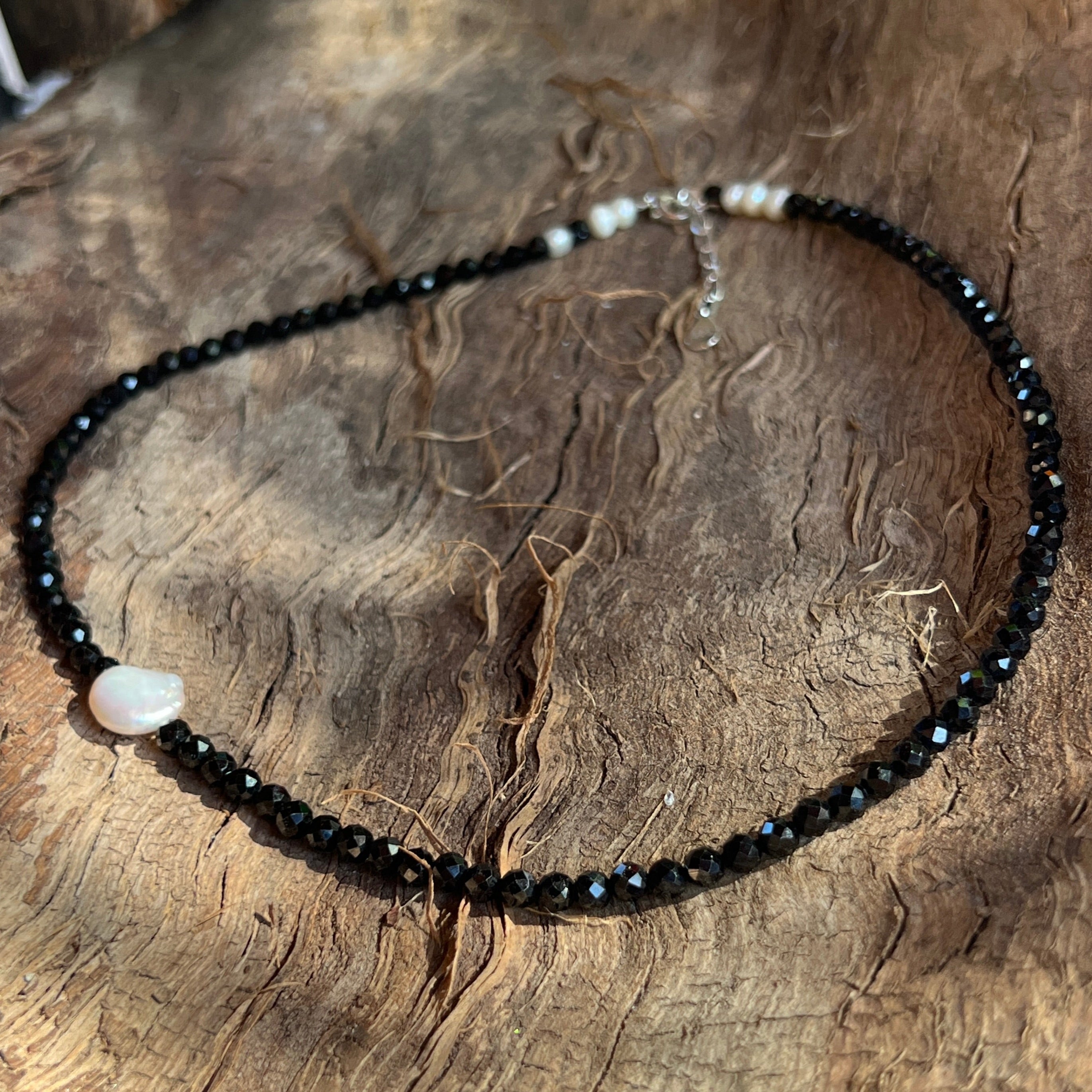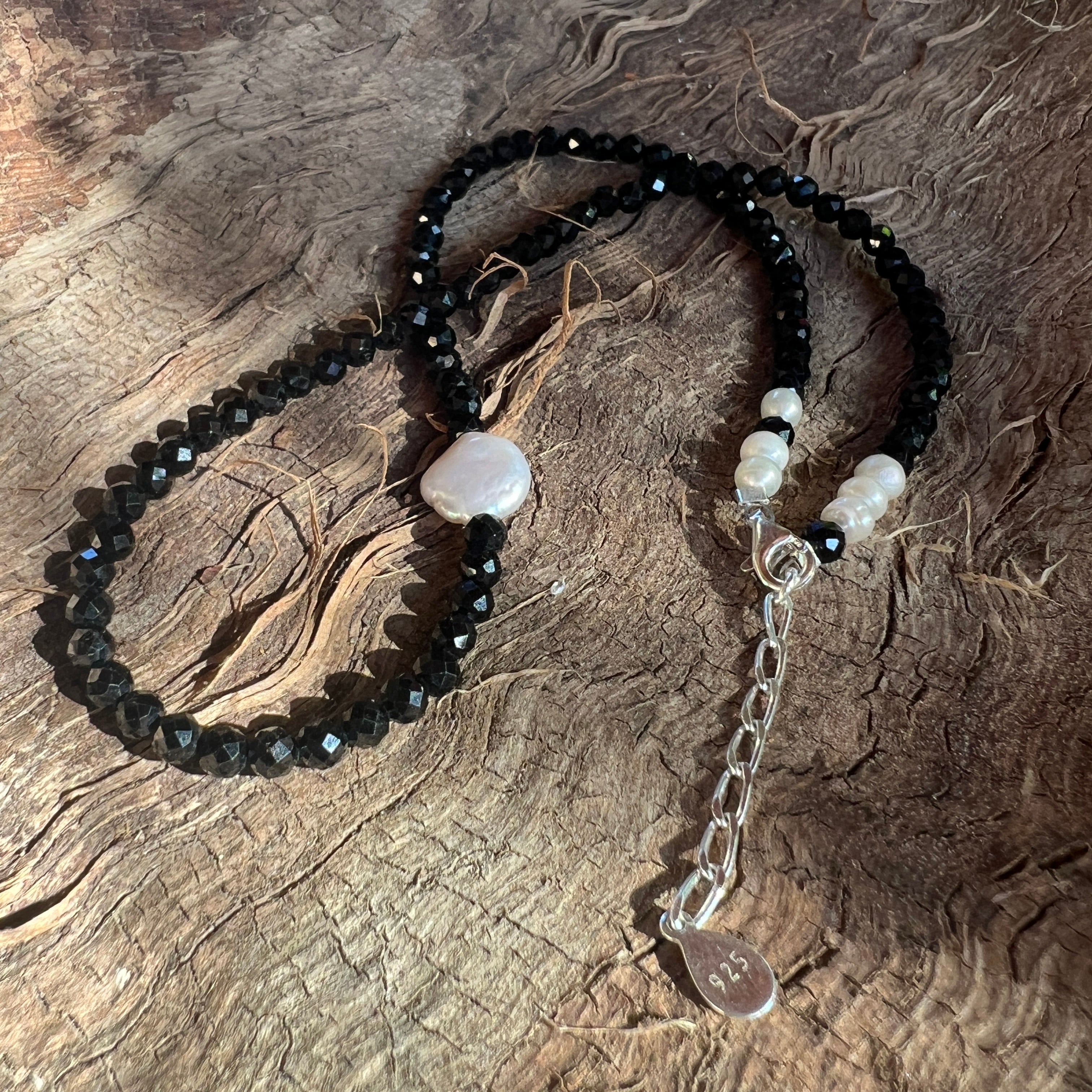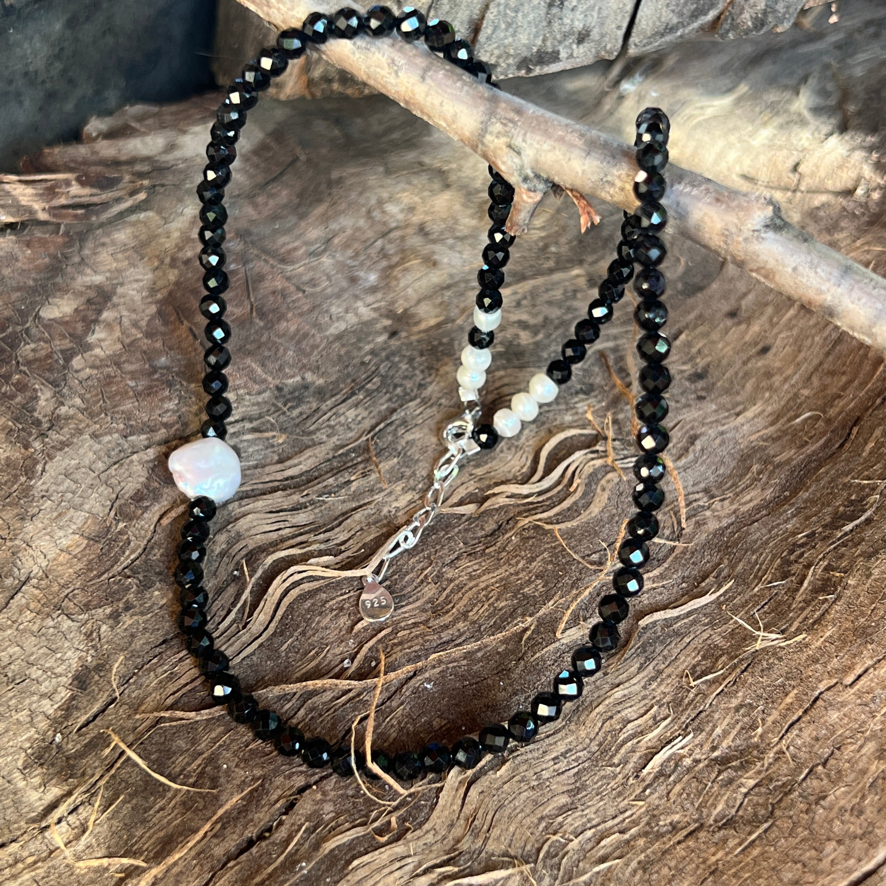 Készítve 4 mm-es természetes spinellből, lenyűgöző mély fekete árnyalatokkal és fényes fémes tükröződésekkel, amelyek a fényt megragadják, a nyakláncot finom drágakő díszítésekkelgazdagítják, melyek mindegyike finom kontrasztot és kifinomult színjátékot ad. Ezeket a díszítéseket gondosan helyezték el, hogy fokozzák a spinell természetes szépségét és egy csipetnyi varázst adjanak az ékszernek.