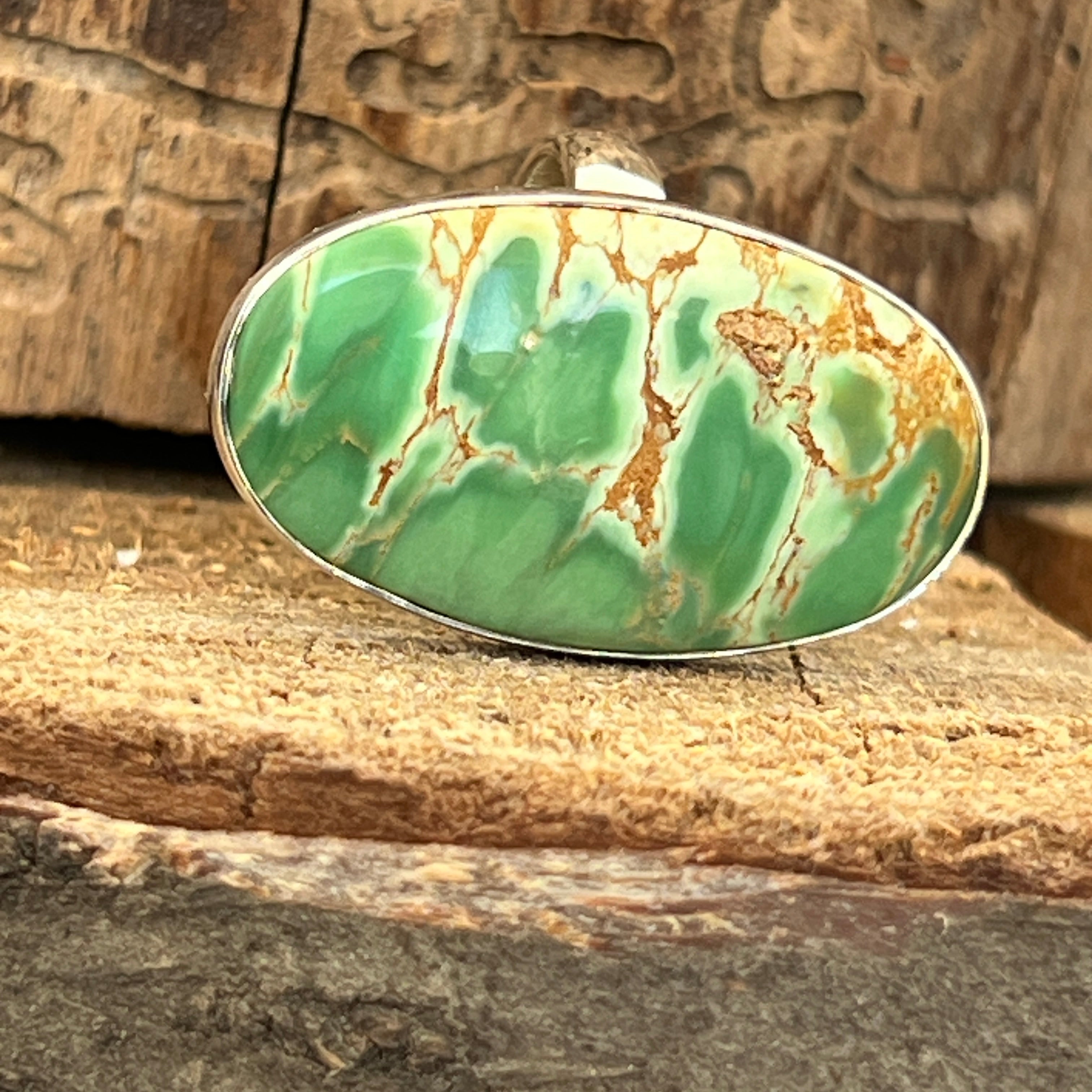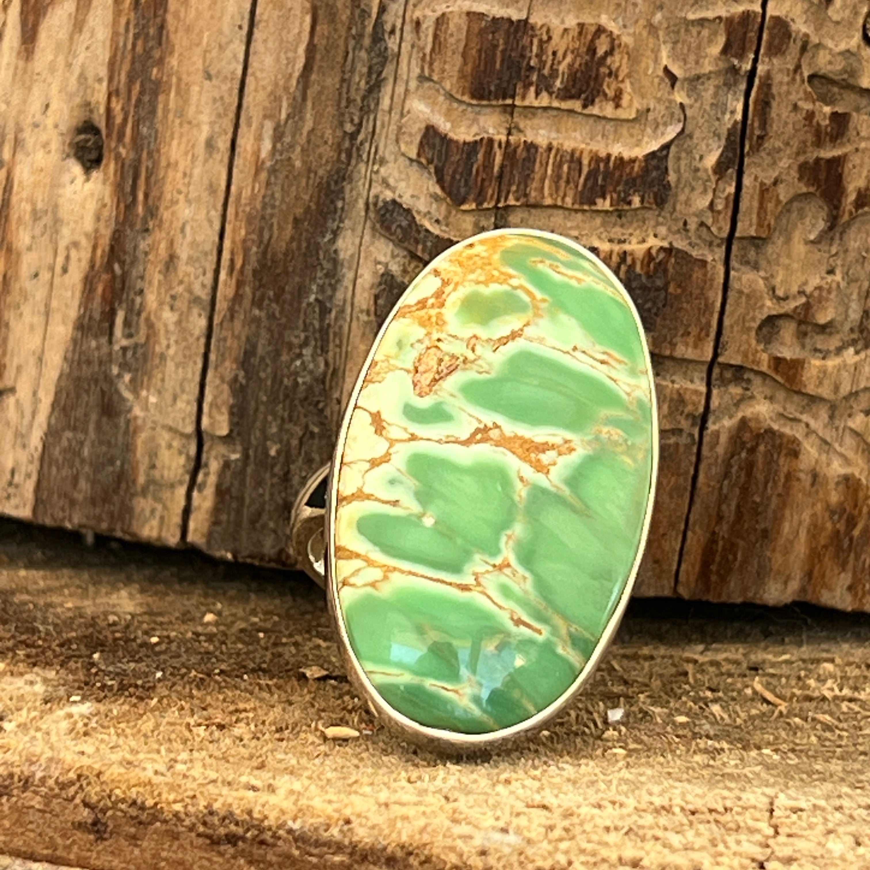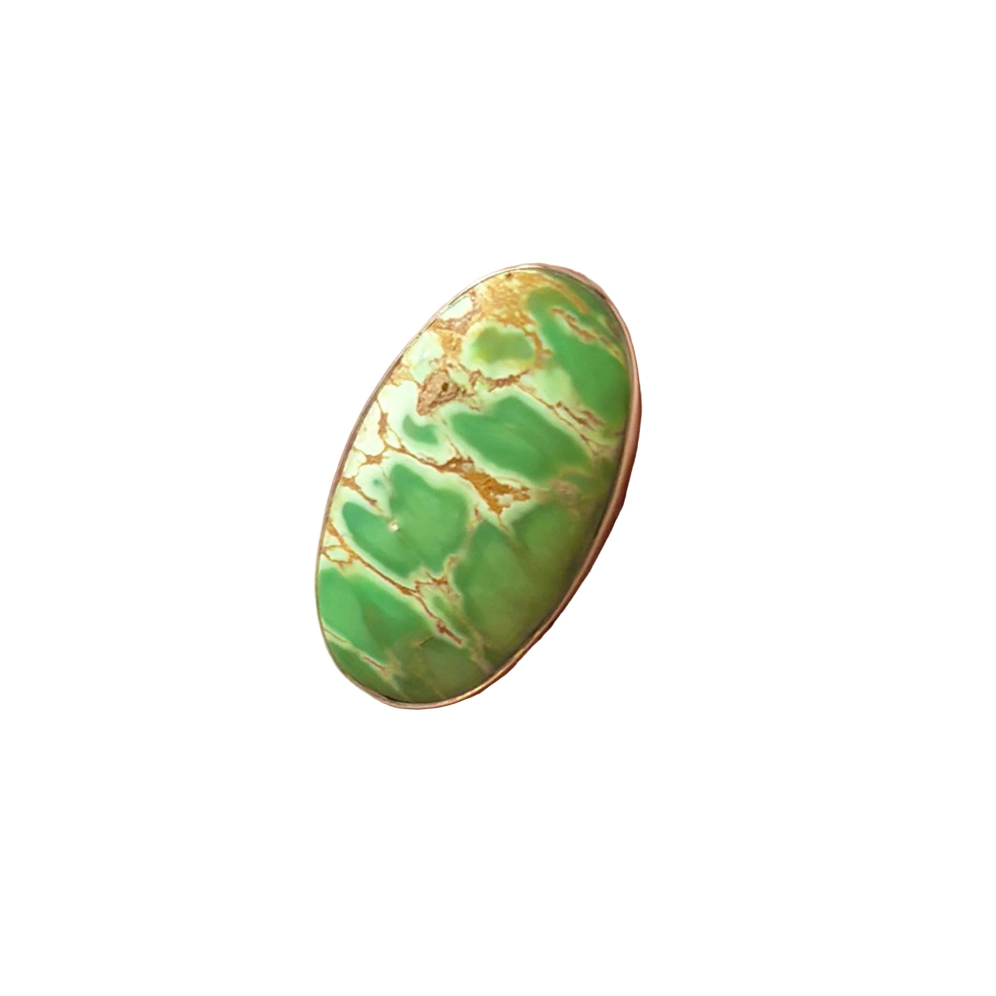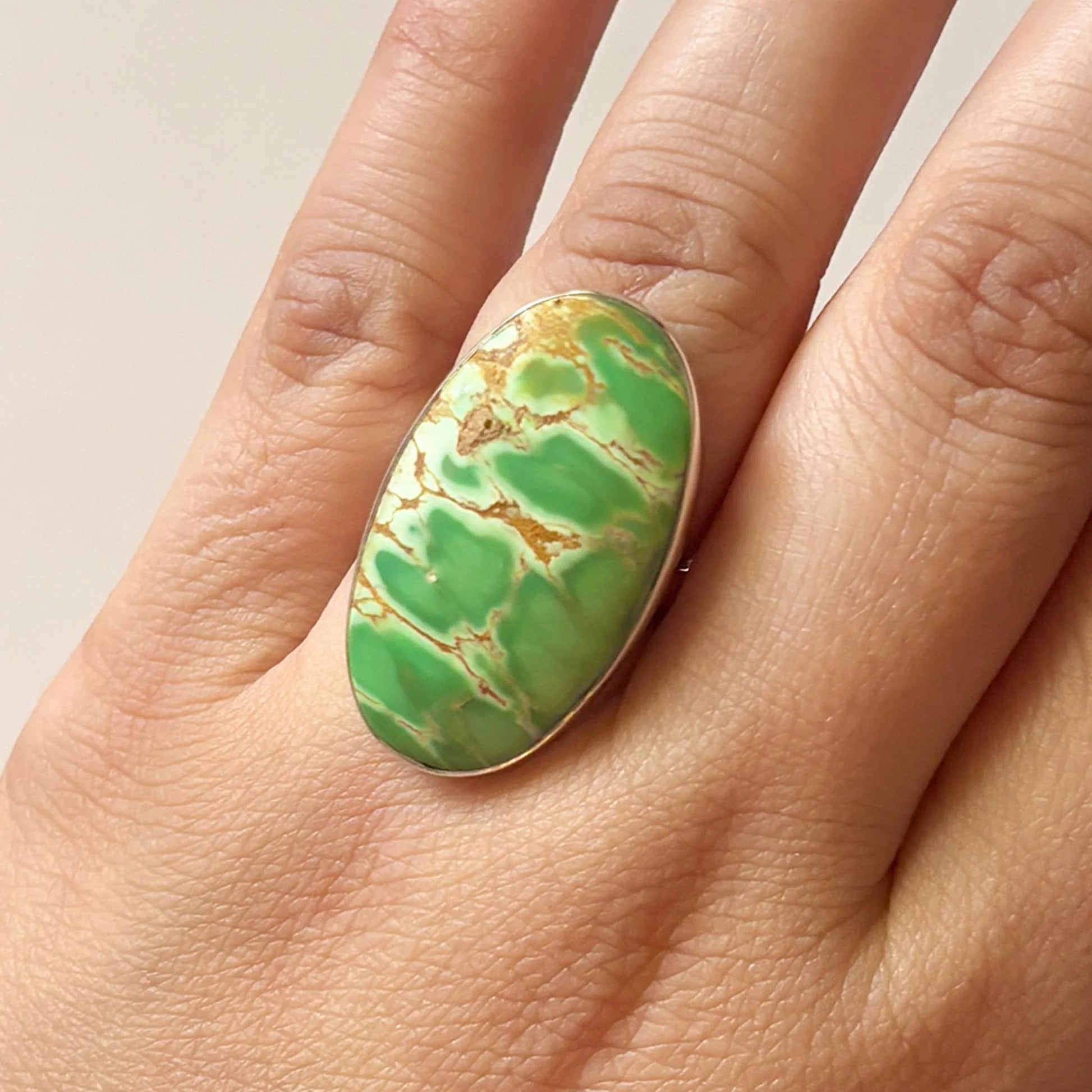 Ez az egyedi variszkitos gyűrű a természet nyers szépségét mutatja be, intenzív zöld és arany erezetek táncában, amelyek a föld gyökereire emlékeztetnek. Ovális, fényes köve a nyári eső utáni erdő csendjét és a kezdőlépések tiszta energiáját idézi.