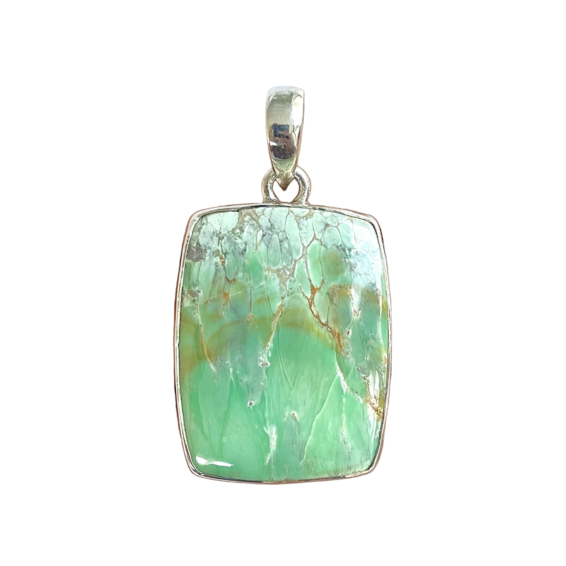 Ez az egyedi variszkitt medál nyugodt és megnyugtató vibrációt áraszt, mint egy érintetlen természetes zug. Finom zöld árnyalatai, amelyeket apró erek és földszínek színeznek, természetes játékot hoznak létre, amely az idő által formált mineralis tájakra emlékeztet.