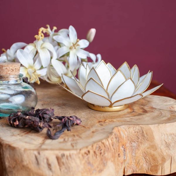 Világos fehér lótuszvirág gyertyatartó a Fülöp-szigetekről Capiz héjakkal