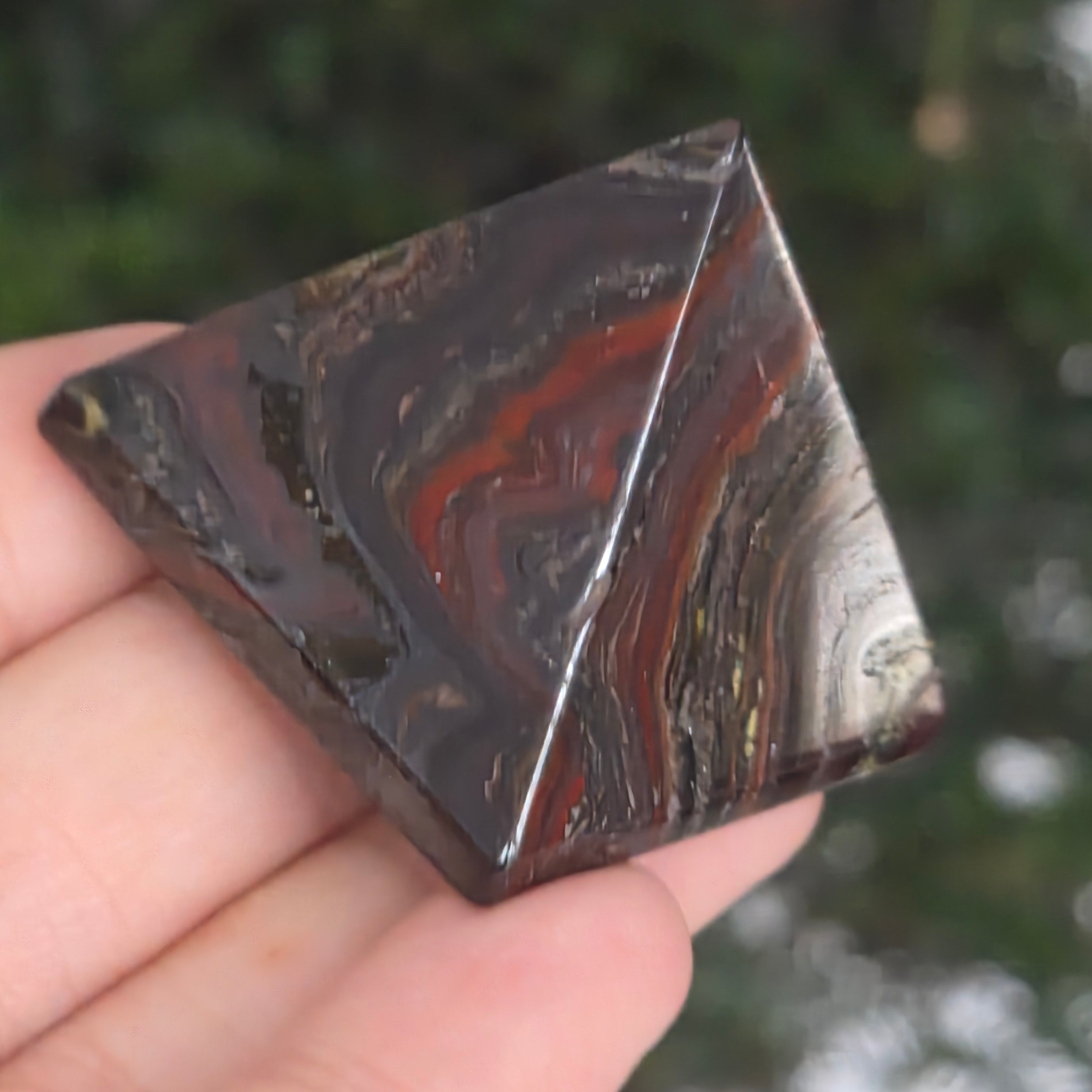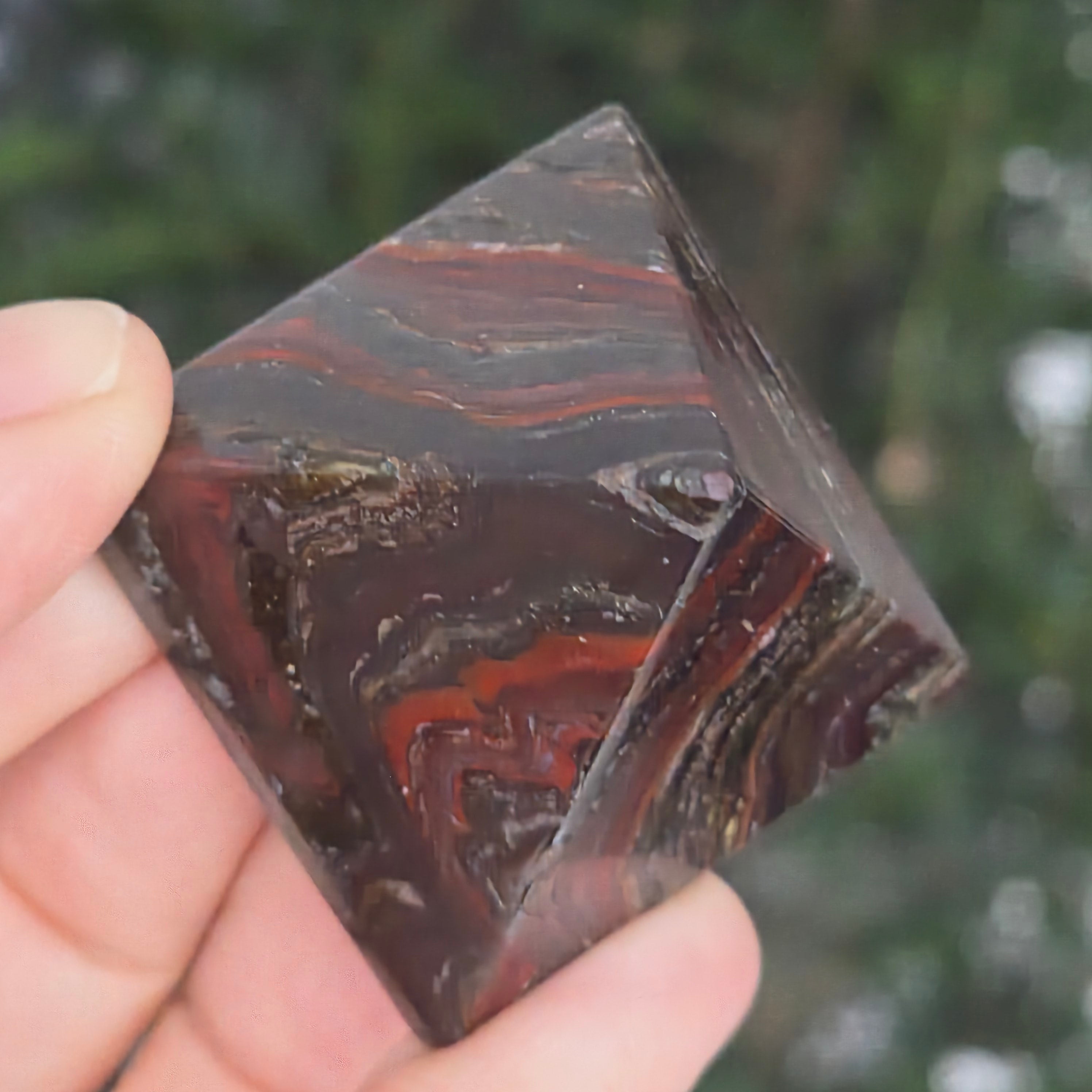 A belső tűz és az ősi föld színeit hordozó piramis. Ezt természetes vörös jáspis darab hematit zárványokkal, meleg tónusok – téglavörös, barna és metálszürke – látványát tárja elénk, melyeket természetes csíkok és csillogó tükröződések keresztezik. A tökéletesen csiszolt felület kiemeli a kontrasztokat és a gazdag textúrát, erős és nemes jelenlétet adva.