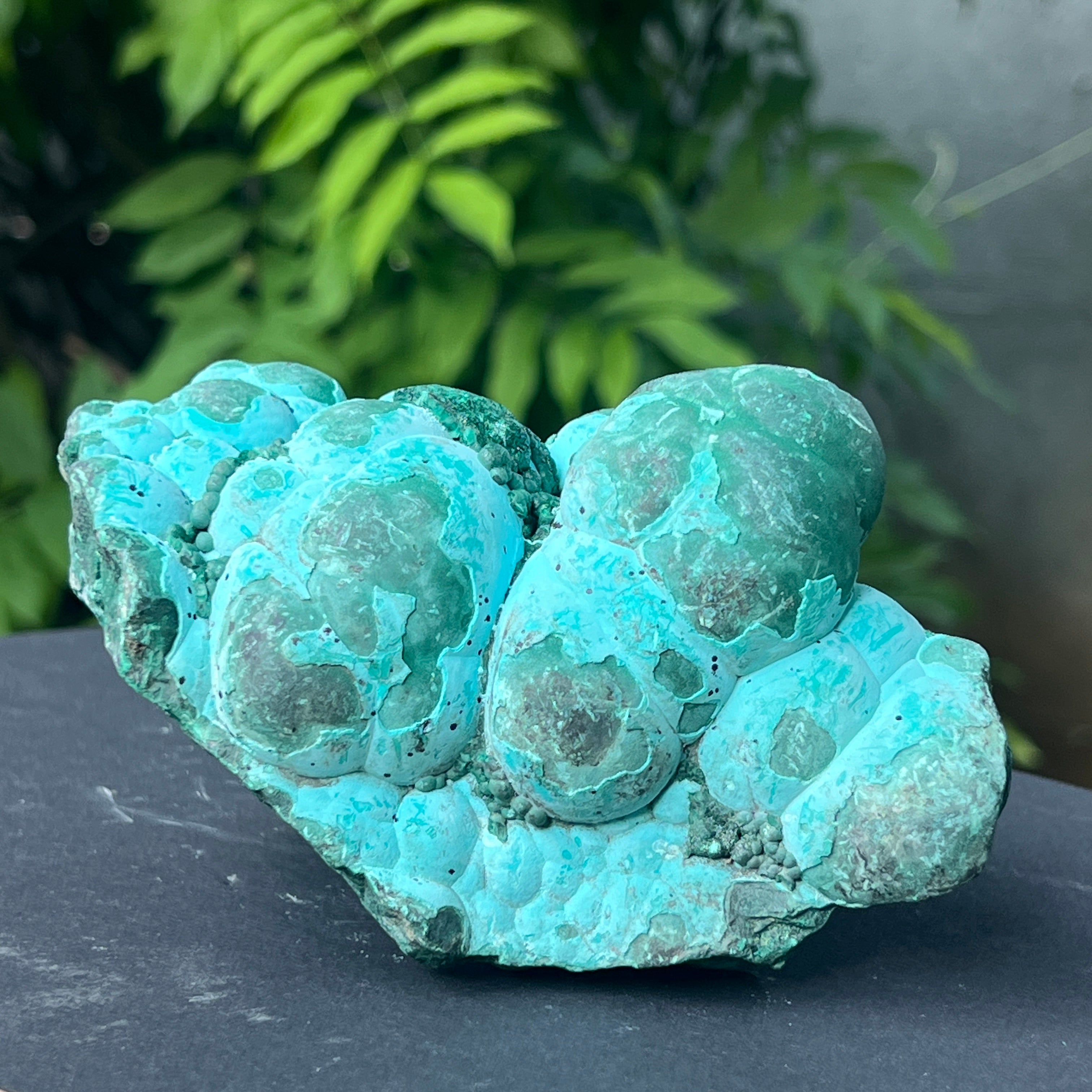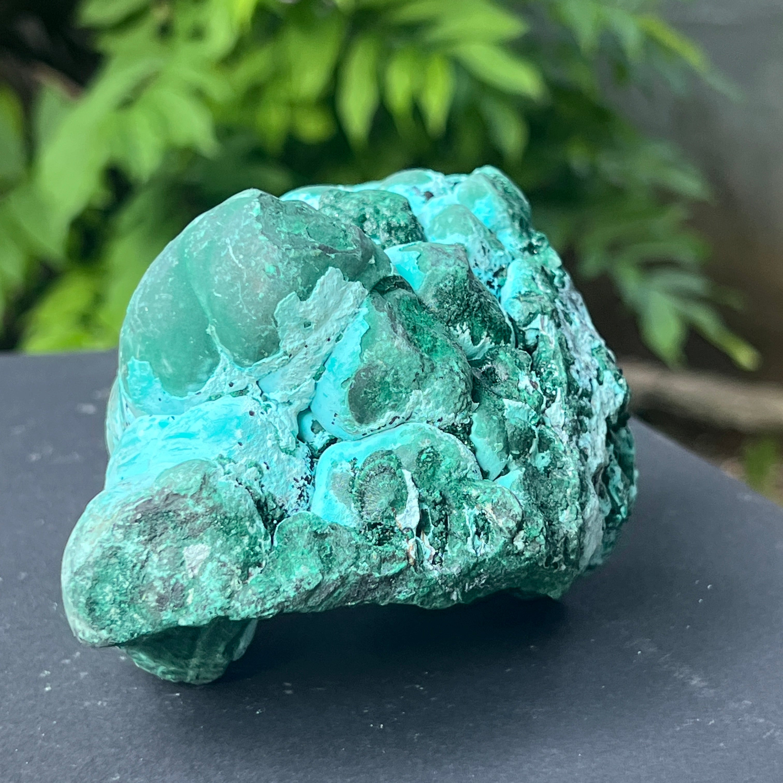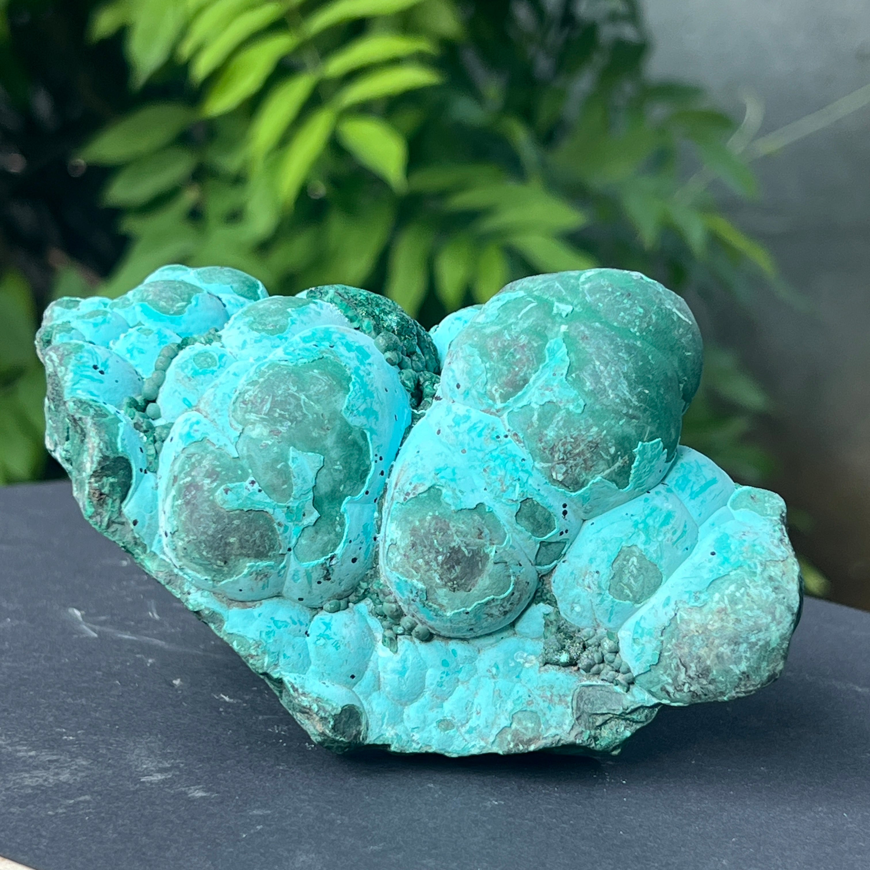 Ez a lenyűgöző, természetes alkotás egy látványos találkozást jelent két másodlagos ásvány között a rézlelőhelyek oxidációs zónájában: malachit és chrysocolla. A domináns botrioidális szerkezet – amelyet gömbszerű aggregációk jellemeznek, amelyek megszilárdult cseppek tömegére emlékeztetnek – ritka lassú képződés kifejezése, specifikus hidromineral körülmények között, gyakran olyan üregekben, ahol rézgazdag oldatok fokozatosan lecsapódnak a geológiai üregek falain.