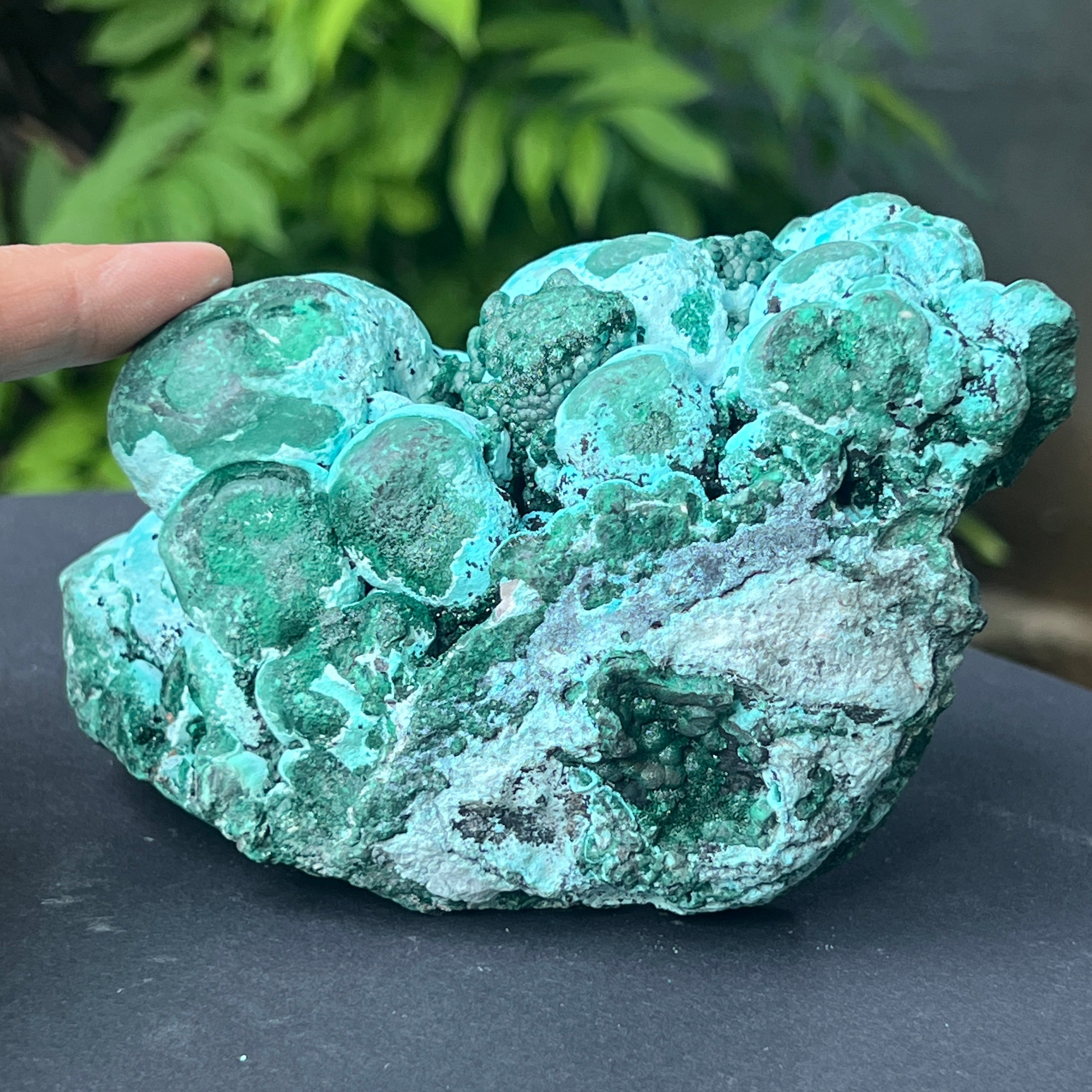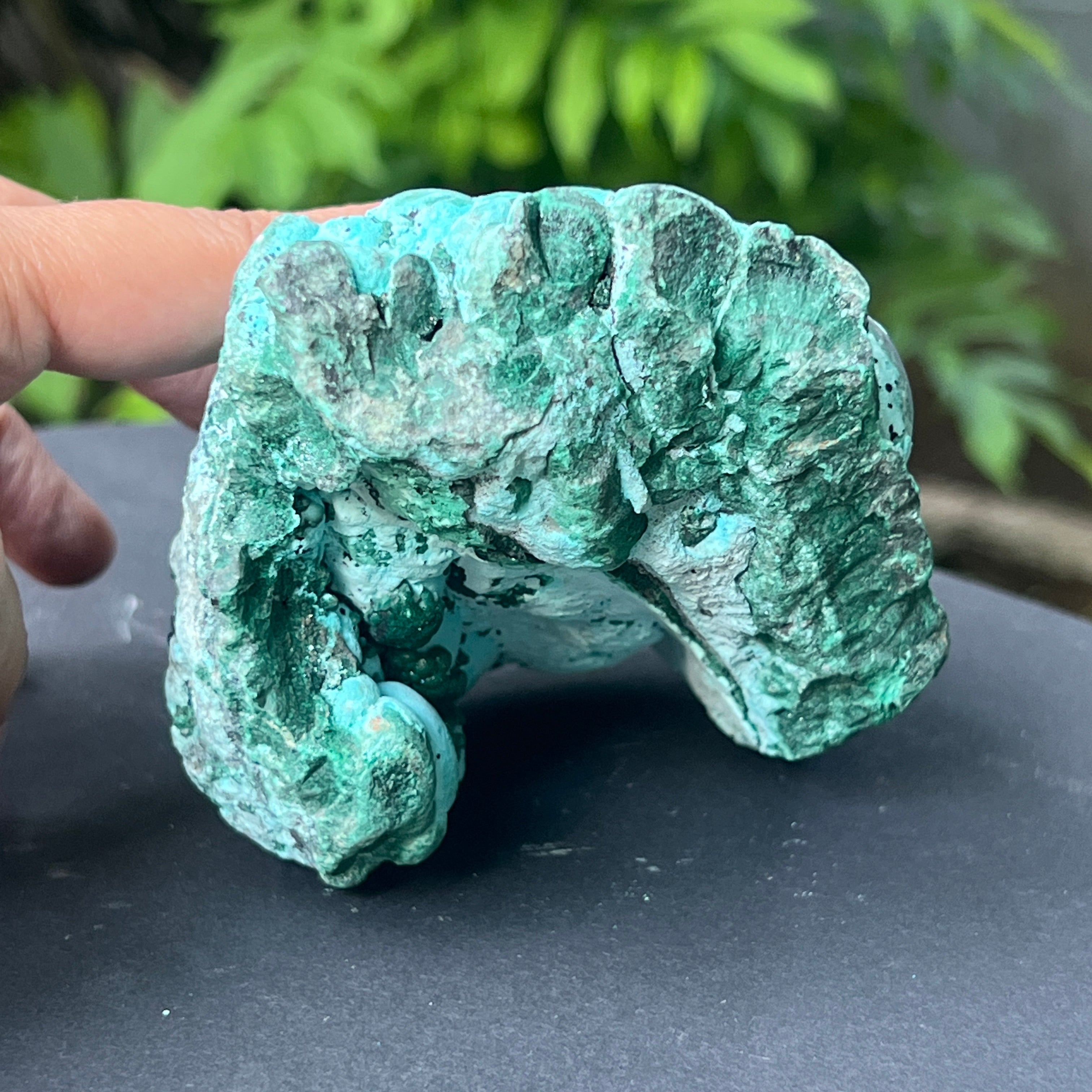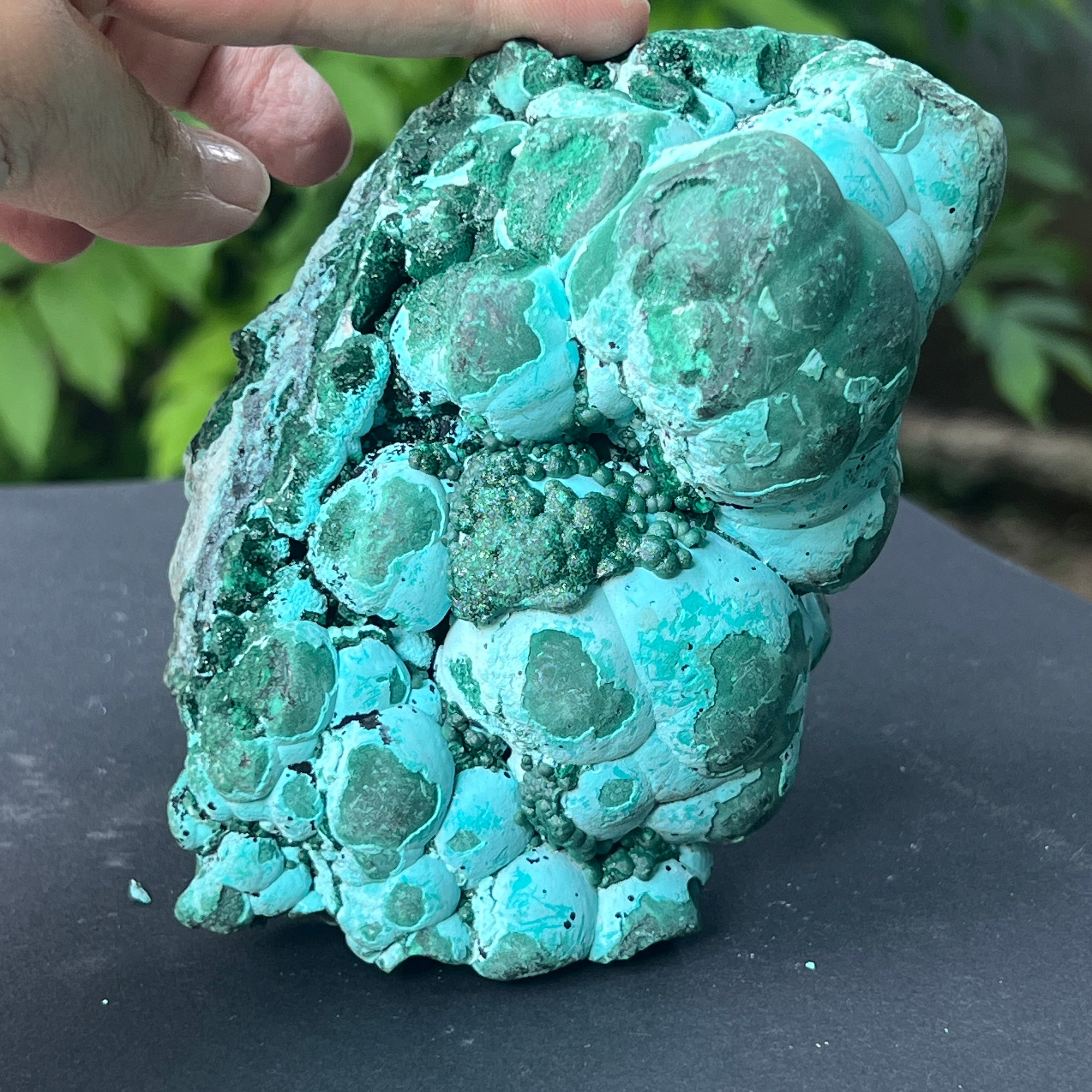 Ez a lenyűgöző, természetes alkotás egy látványos találkozást jelent két másodlagos ásvány között a rézlelőhelyek oxidációs zónájában: malachit és chrysocolla. A domináns botrioidális szerkezet – amelyet gömbszerű aggregációk jellemeznek, amelyek megszilárdult cseppek tömegére emlékeztetnek – ritka lassú képződés kifejezése, specifikus hidromineral körülmények között, gyakran olyan üregekben, ahol rézgazdag oldatok fokozatosan lecsapódnak a geológiai üregek falain.