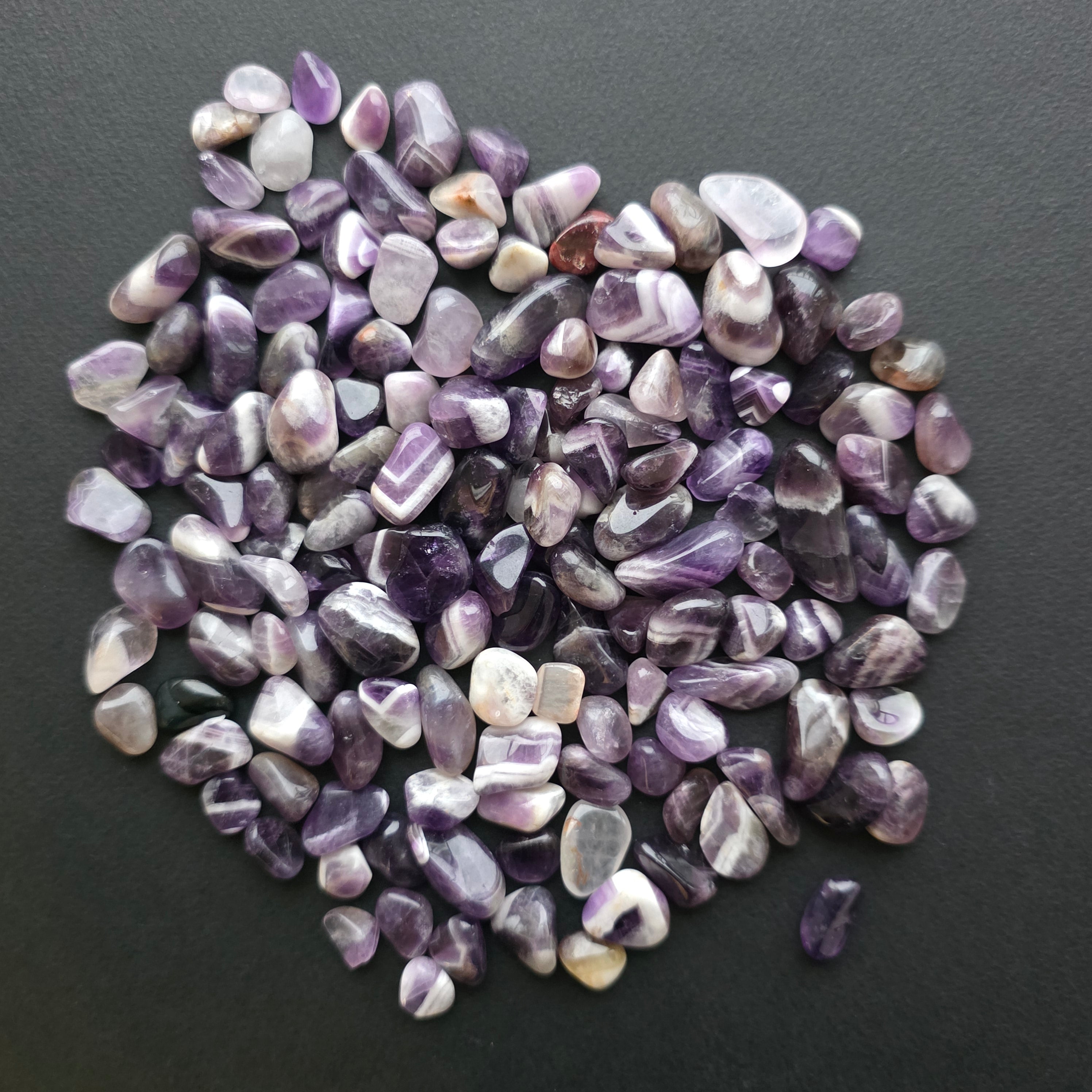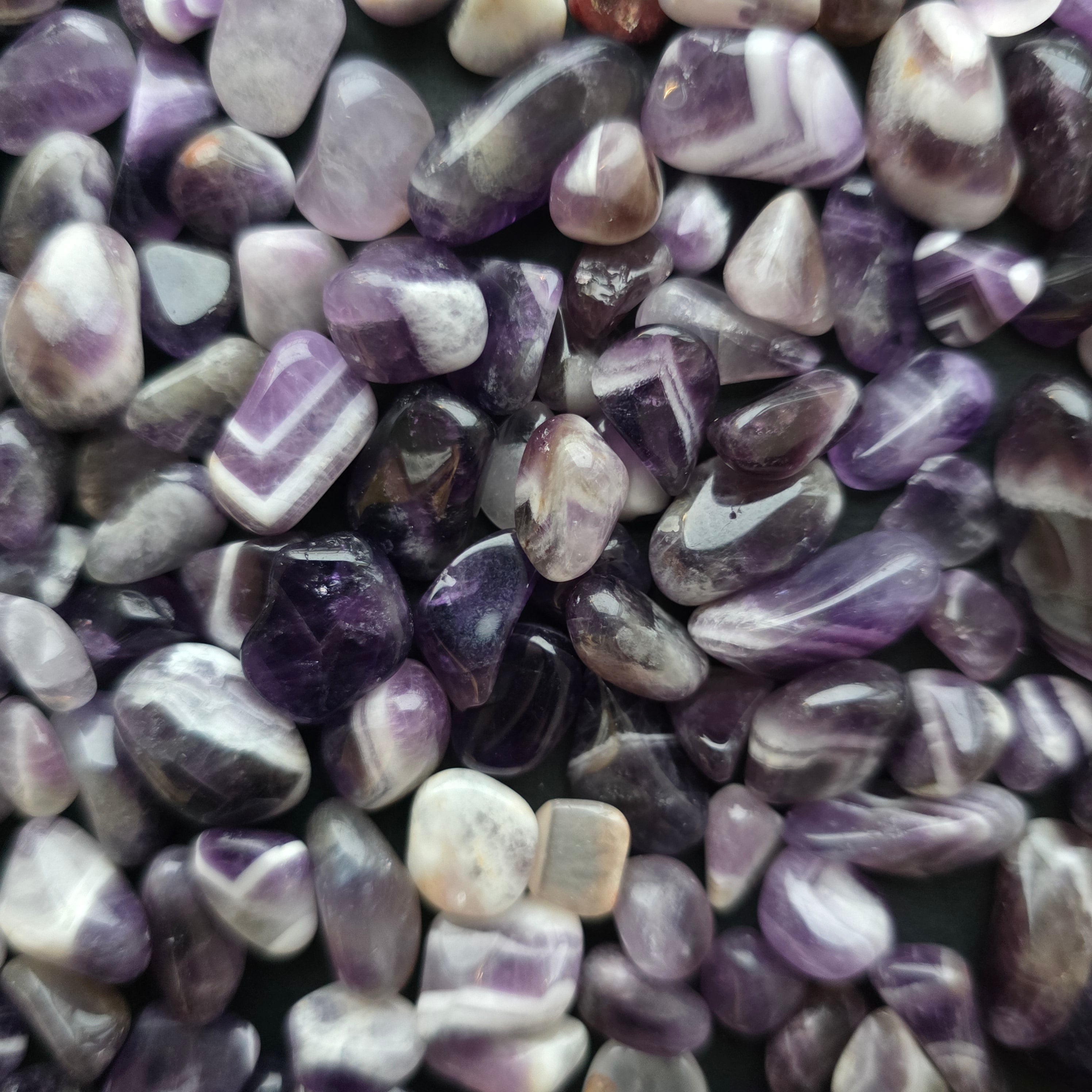 A zambiai Chevron ametistát a leglátványosabb ametistafajták egyikének tartják, köszönhetően a természetes, intenzív lila és tejfehér sávos vagy „V” alakú mintázatának. Ebben a csipsz változatban a kis, szabálytalan kövek megőrzik a nyers kristály teljes energiáját, de könnyen használható formában kínálják kreatív projektekhez, energetikai rituálékhoz vagy dekorációkhoz.