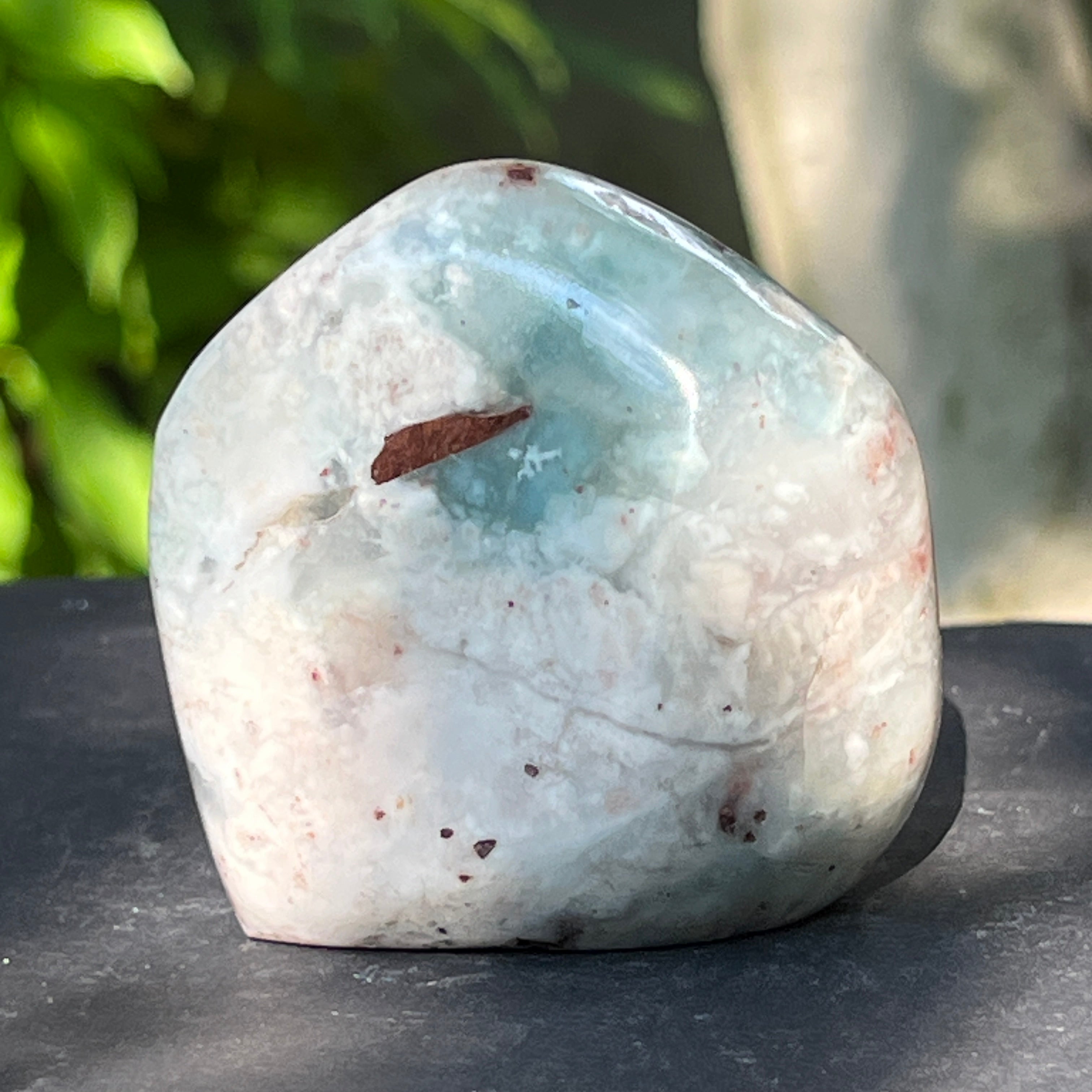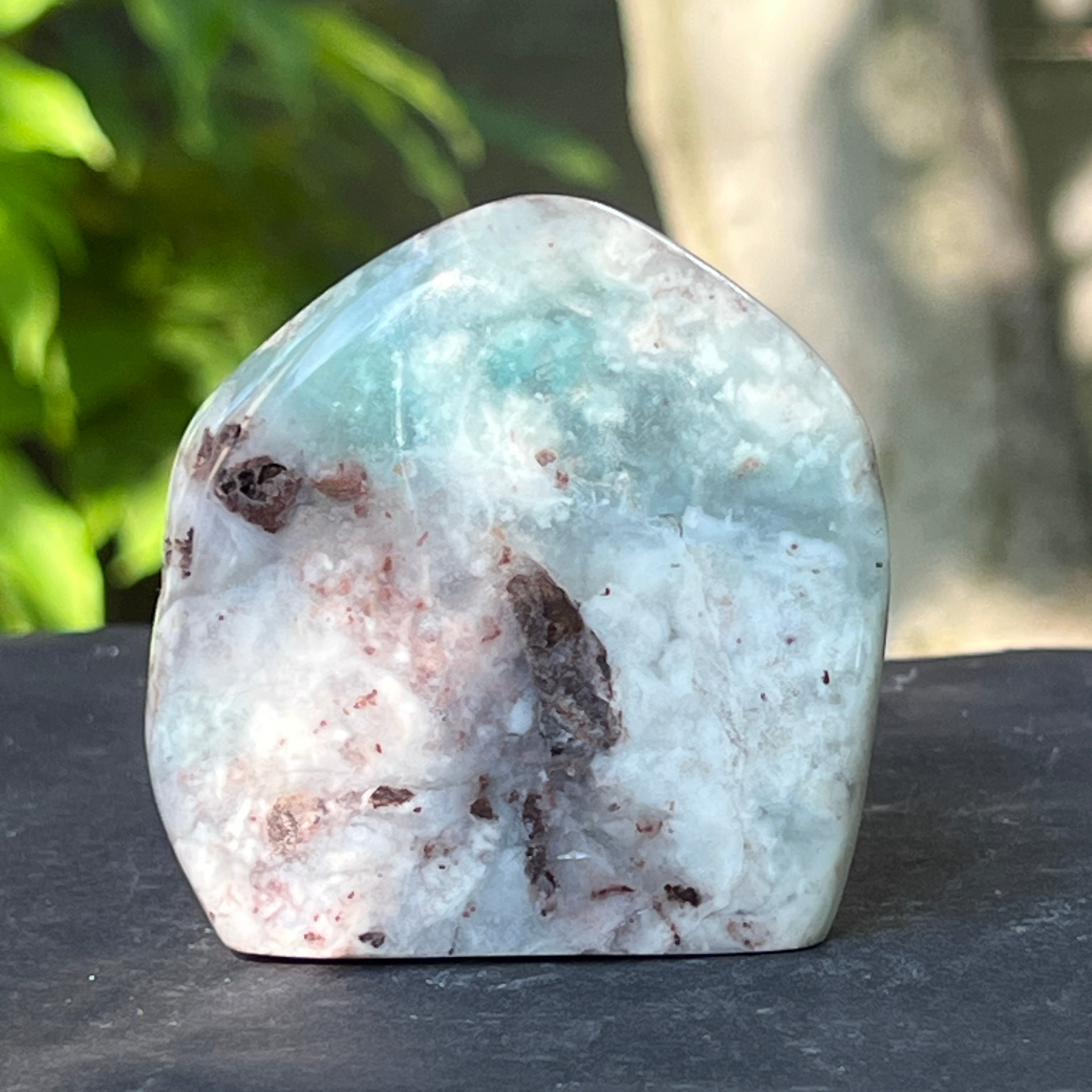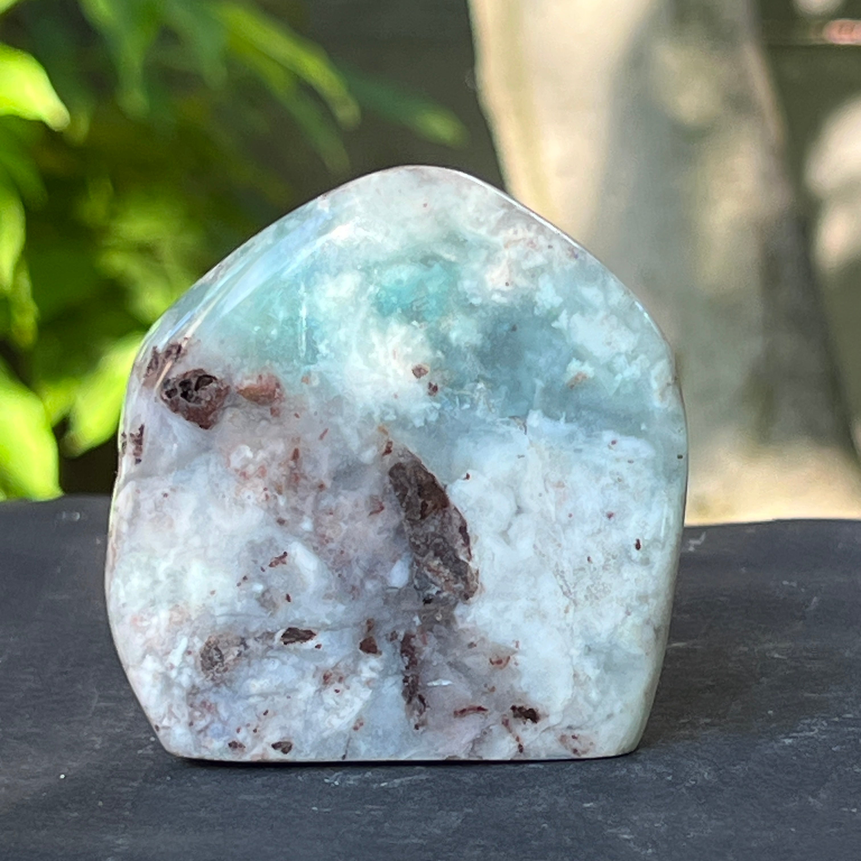 A textúrája élénk – tejeskalmopátos erekkel, diszkrét kvarctörésekkel és rozsdaszínű mátrixfoltokkal – mind a lassú képződés bizonyítékai, egy összetett és feszültségekkel teli geológiai környezetben.