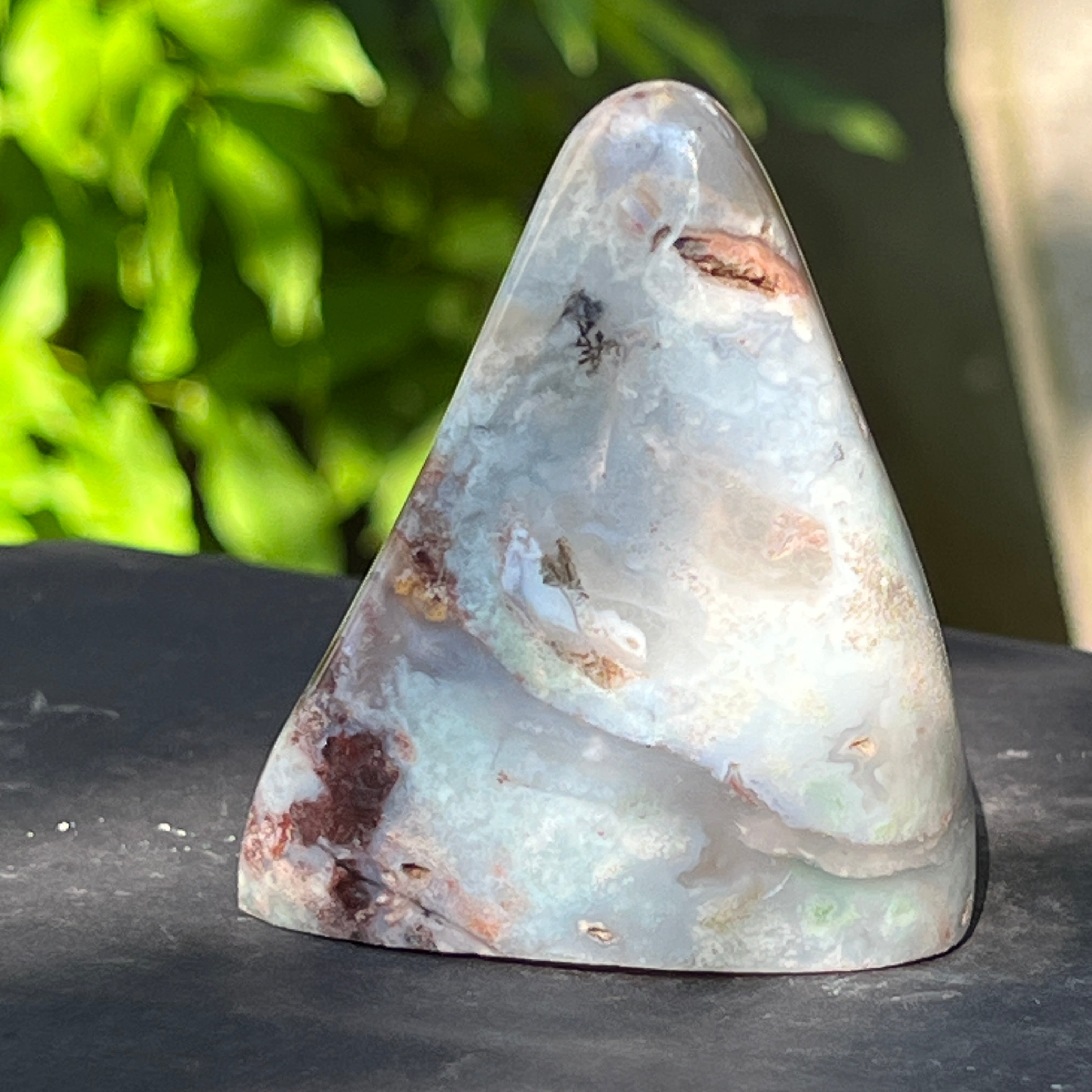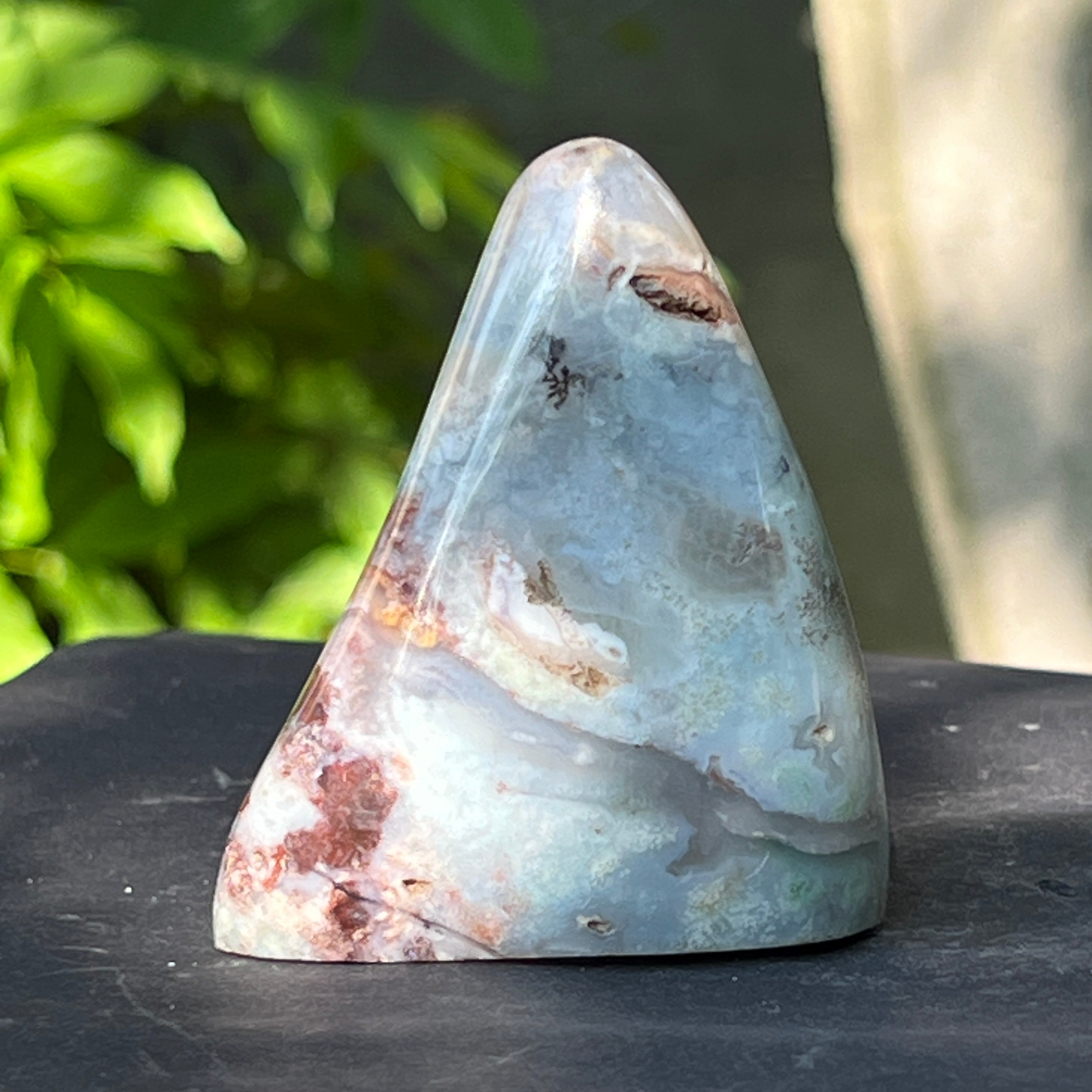 Ez egy természetes, módosítatlan forma egy krómkalcedonból – egy nehezen található ásvány, kizárólag Zimbabwéből nyerik ki, és élénk színéért értékelik, amely nem nikkelből származik (mint a krizopráz esetében), hanem abból a krómból, amely mélyen pulzál a kristályszerkezetében. Ebben a különleges változatban a kék és zöld beszúrások lenyűgöző színjátékot hoznak létre, finom átmenetekkel az áttetsző és átlátszatlan, a sűrű és könnyed között.