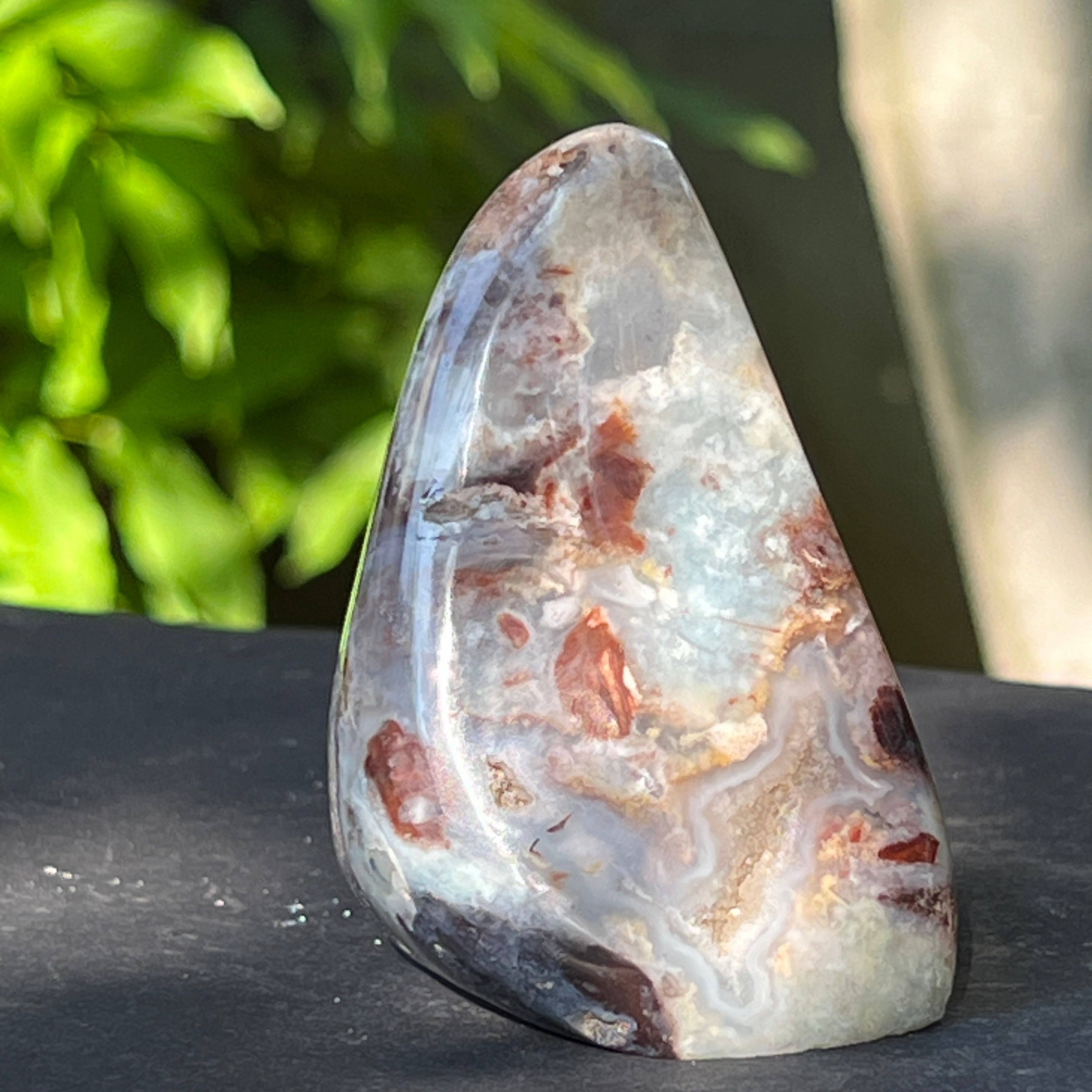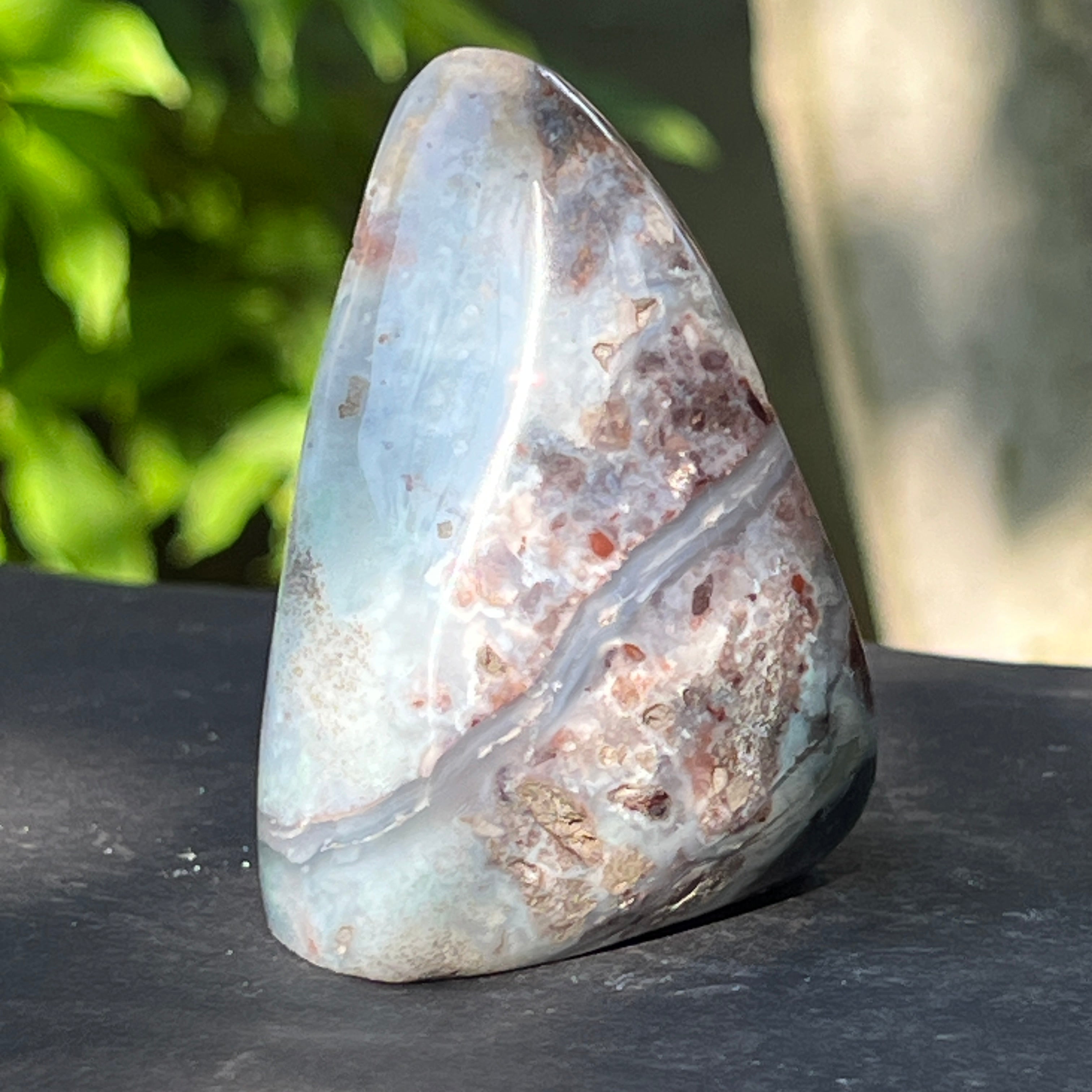 A textúrája élénk – tejfehér kalcedon erekkel, diszkrét kvarc repedésekkel és a mátrix rozsdabarna foltjaival – mind a lassú kialakulás tanúbizonyságai, egy összetett és feszültségekkel teli geológiai környezetben.