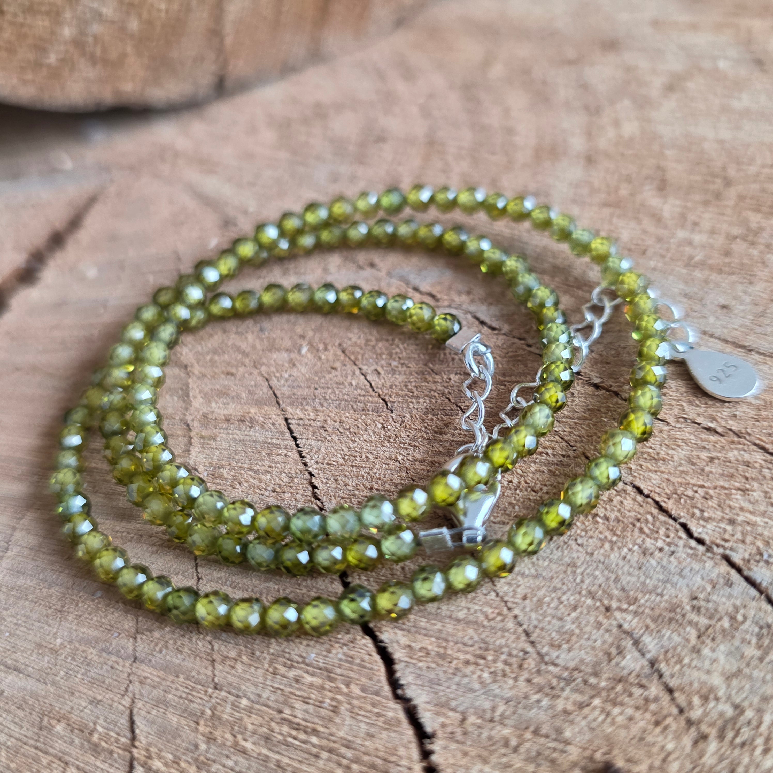 Ez a nyaklánc természetes zöld cirkónból készült, amelyet friss árnyalatai és finom, elegáns csillogása miatt választottak. A 2,5 mm-es csiszolt gömbök finoman visszaverik a fényt, finom csillogást teremtve, amely kifinomult és ragyogó megjelenést kölcsönöz az ékszernek.