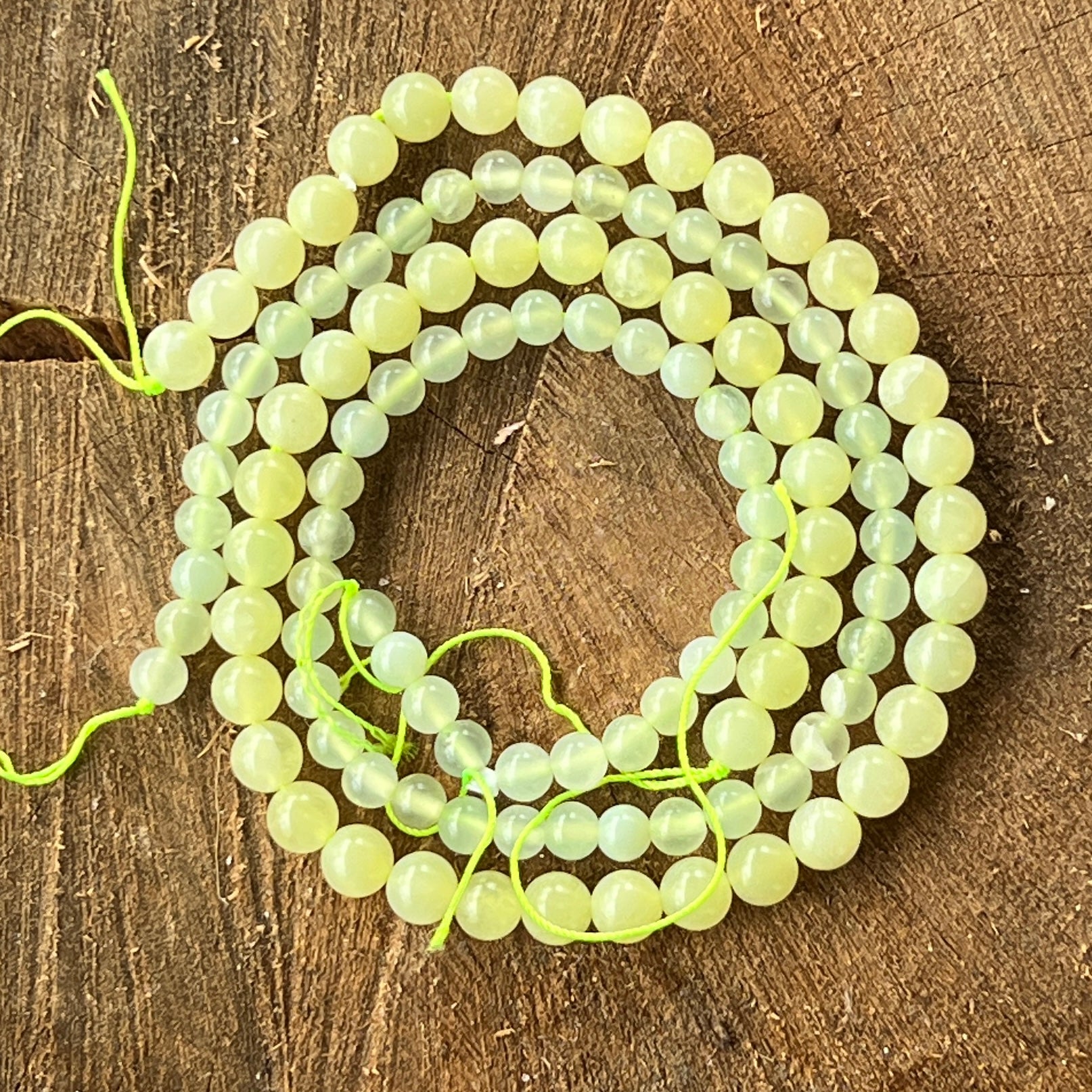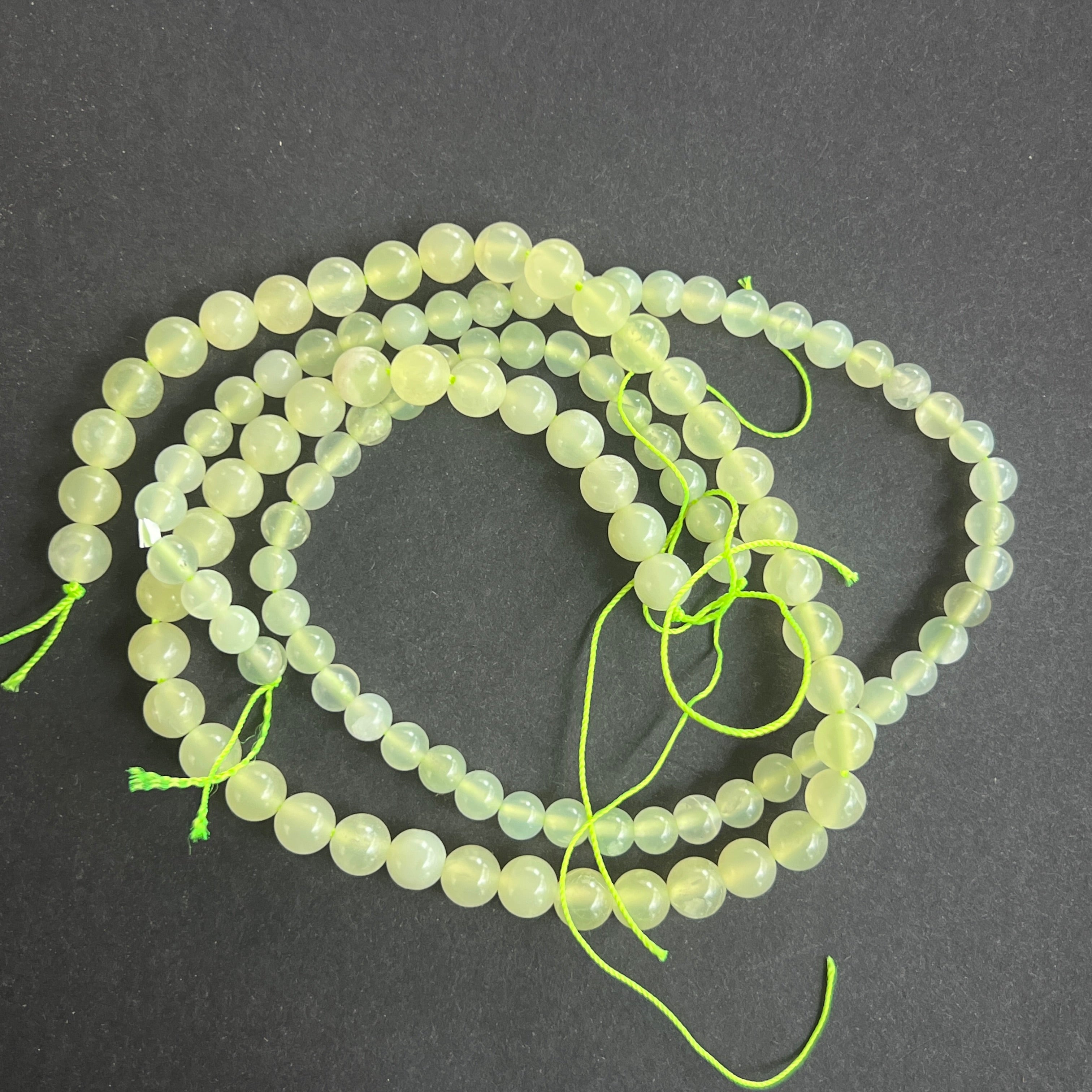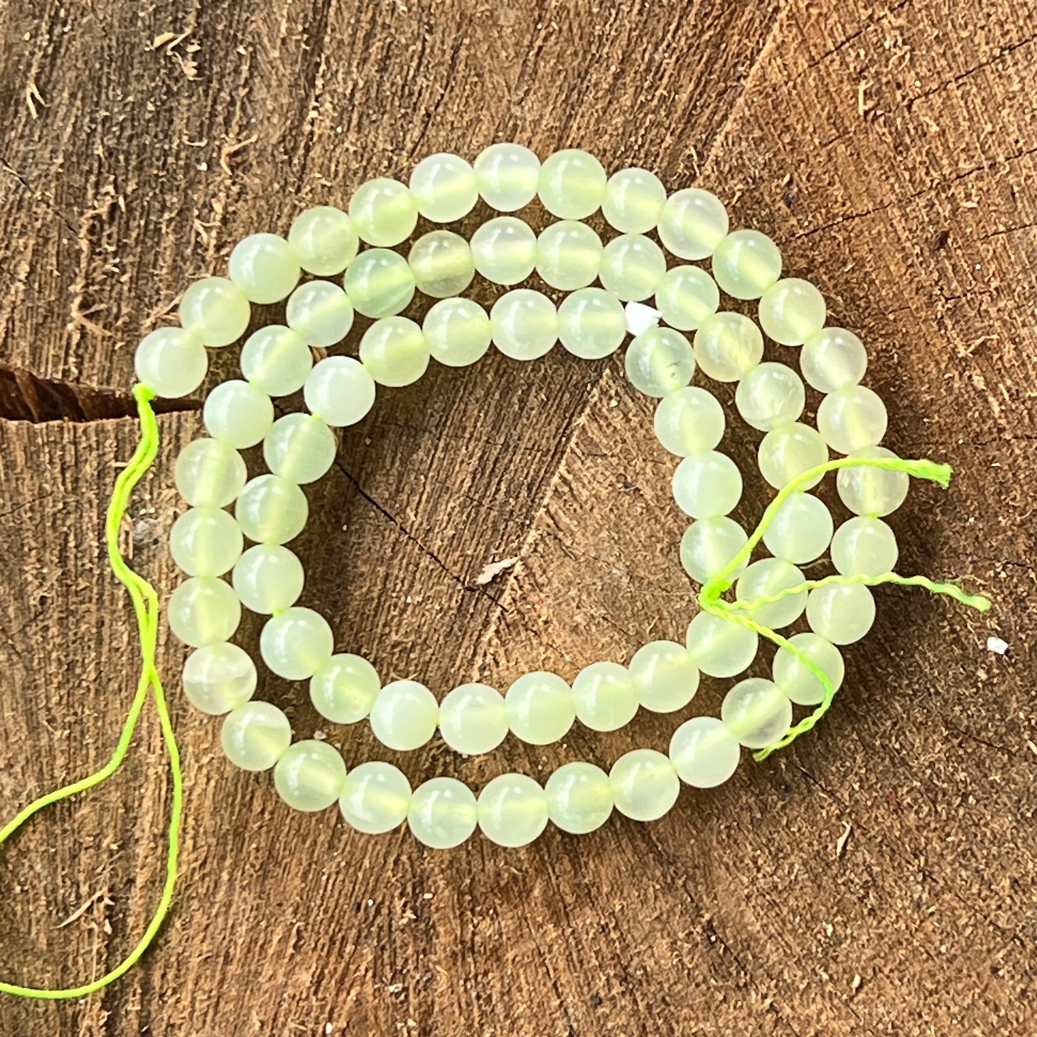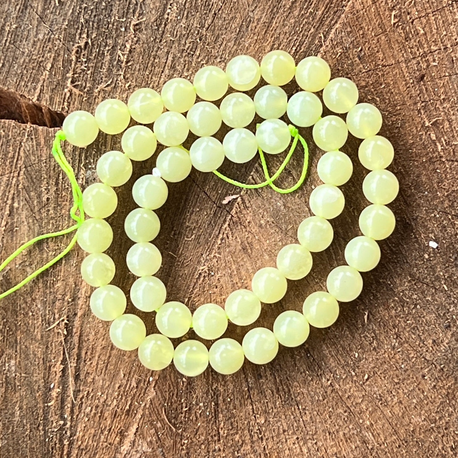 Zöld Jádé "NEW JADE" gyöngysor, amely természetes gömb alakú gyöngyökből áll, tökéletes nyakláncokhoz, karkötőkhöz vagy egyéb kézműves ékszerekhez.
