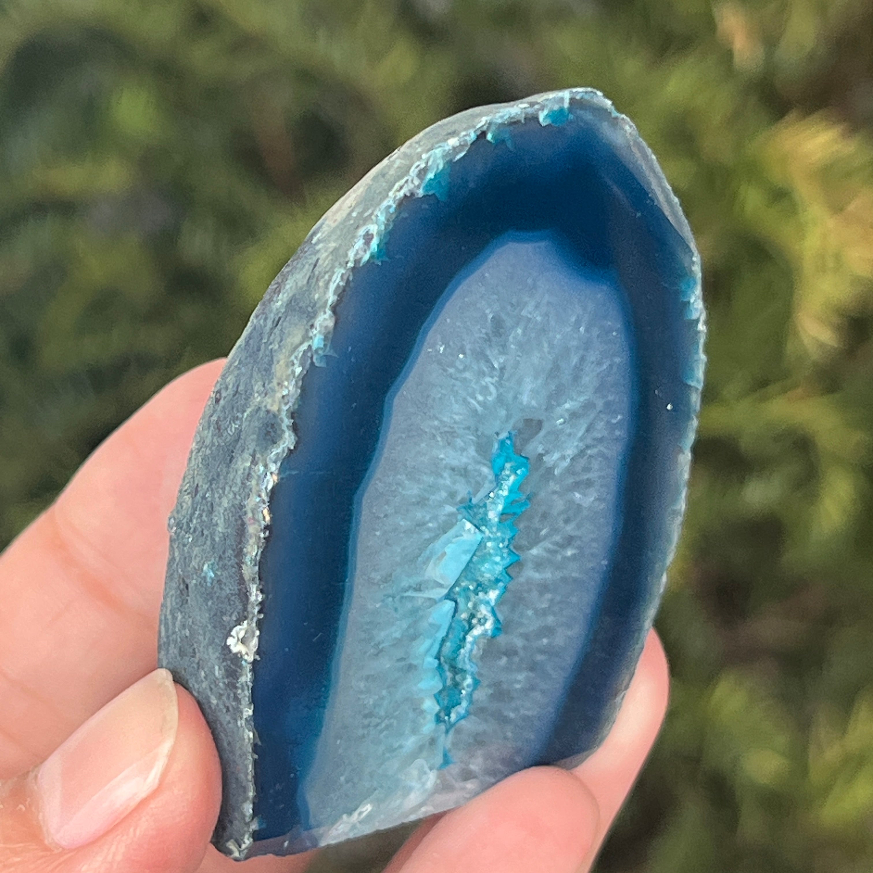 A zöld-kék achát a kalcedon egy változata, rétegzett szerkezettel, amelyet a szilícium szekvenciális lerakódása hoz létre geológiai üregekben. Zöld és kék árnyalatai kiemelik az achátra jellemző természetes csíkokat. Színei harmóniájáért és a belső egyensúllyal és érzelmi nyugalommal kapcsolatos szimbolikájáért is értékelik.