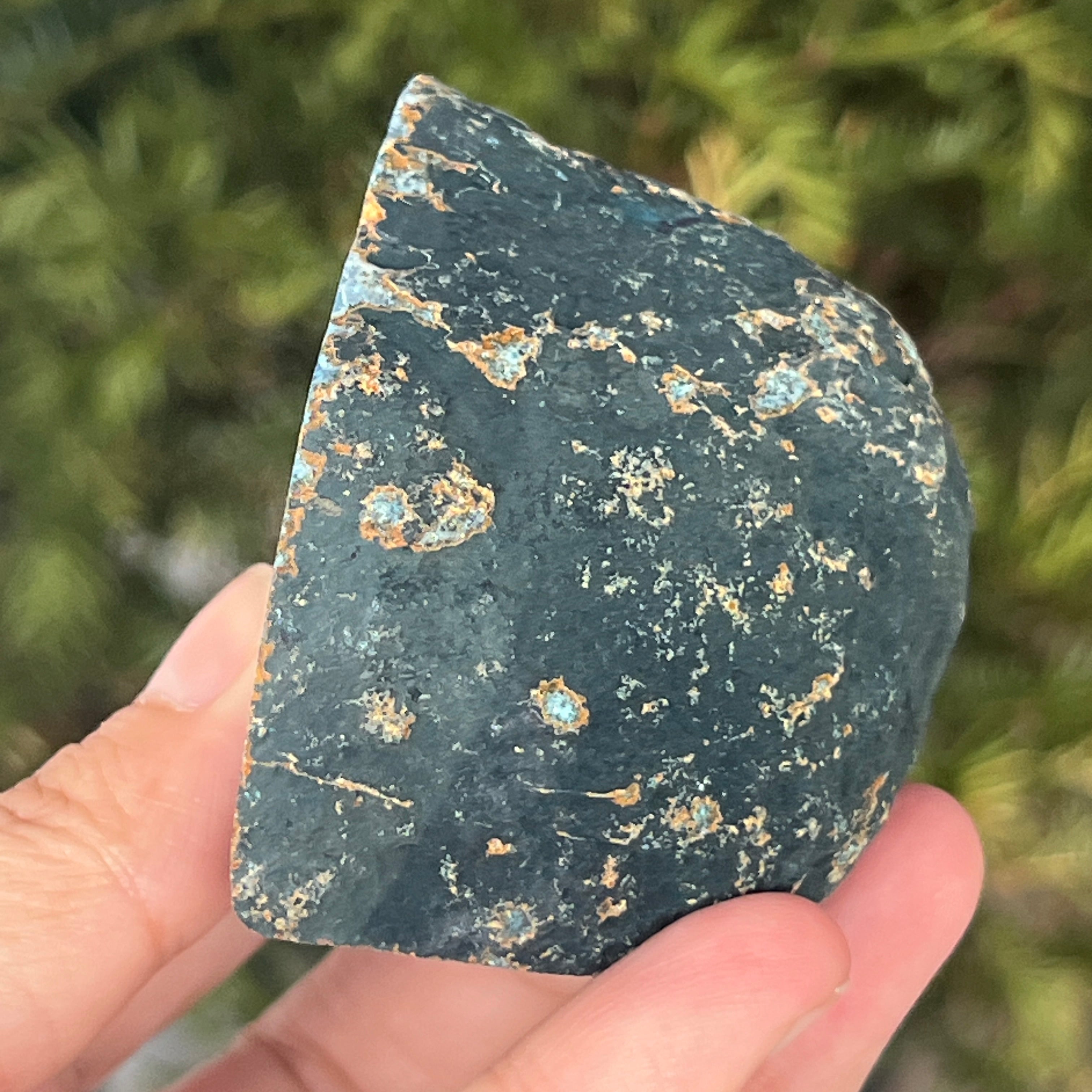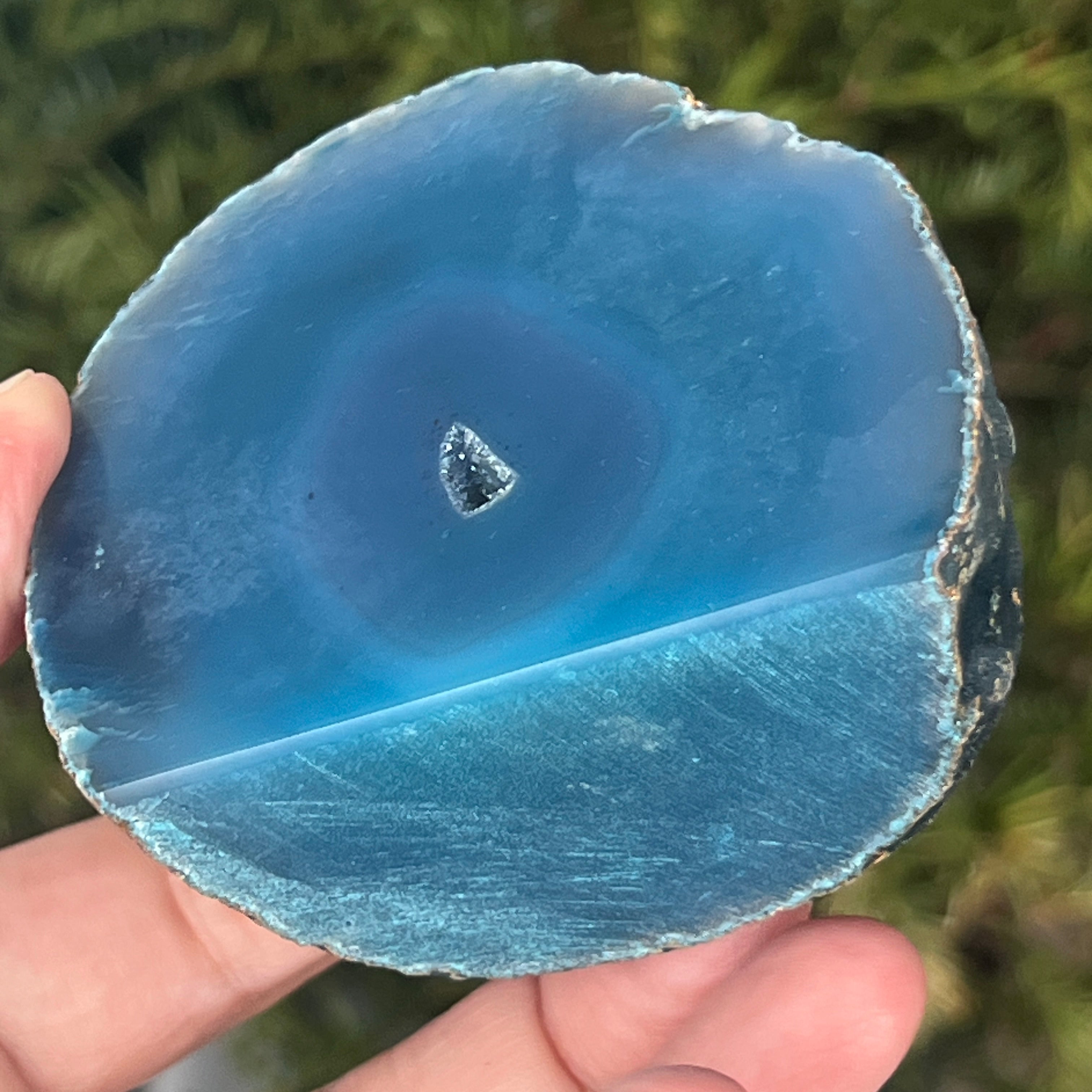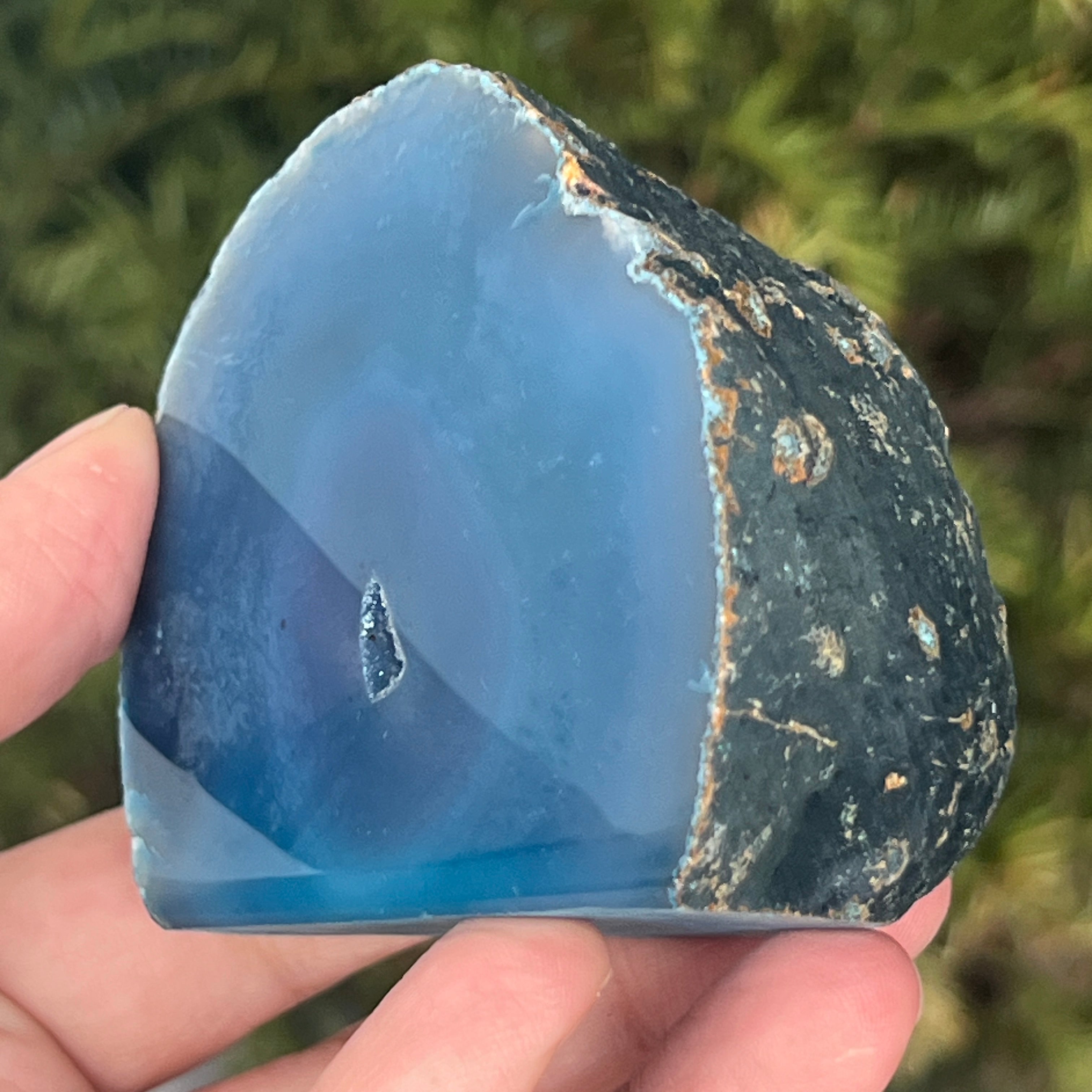 A zöld-kék achát a kalcedon egy fajtája, rétegzett szerkezettel, amelyet a szilícium szekvenciális lerakódása hoz létre geológiai üregekben. Zöld és kék közötti árnyalatai kiemelik az achátra jellemző természetes csíkokat. Színei harmonikusak, és az belső egyensúllyal és érzelmi nyugalommal kapcsolatos szimbolikája miatt is értékelt.