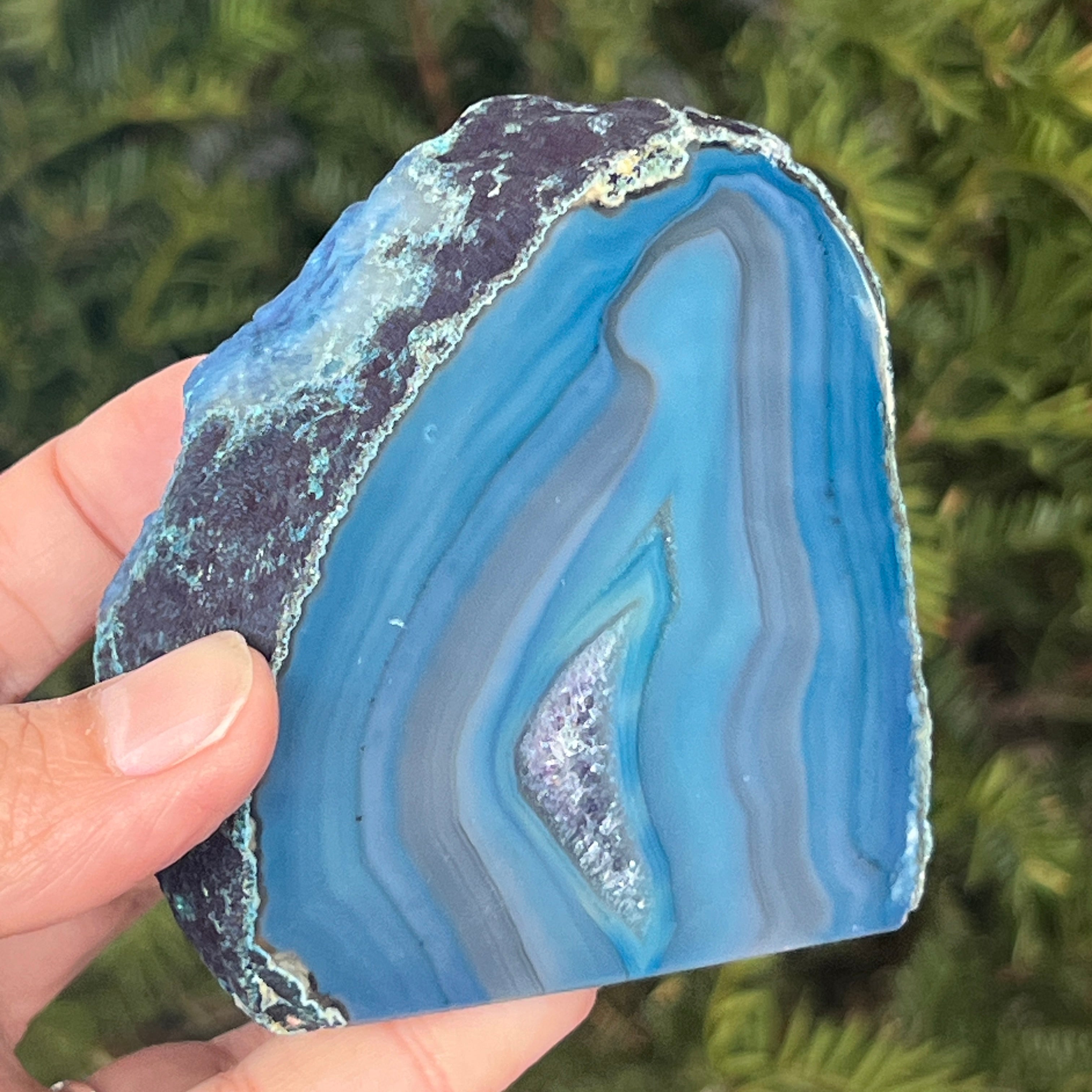 A zöldeskék achát egy kalcedon változat, amely rétegzett szerkezetű, a szilikát többrétegű lerakódása révén alakul ki geológiai üregekben. Zöld és kék árnyalatai kiemelik az achátra jellemző természetes csíkokat. Szépségét a színek harmóniájáért és a belső egyensúllyal, valamint az érzelmi békével kapcsolatos szimbolikájáért értékelik.