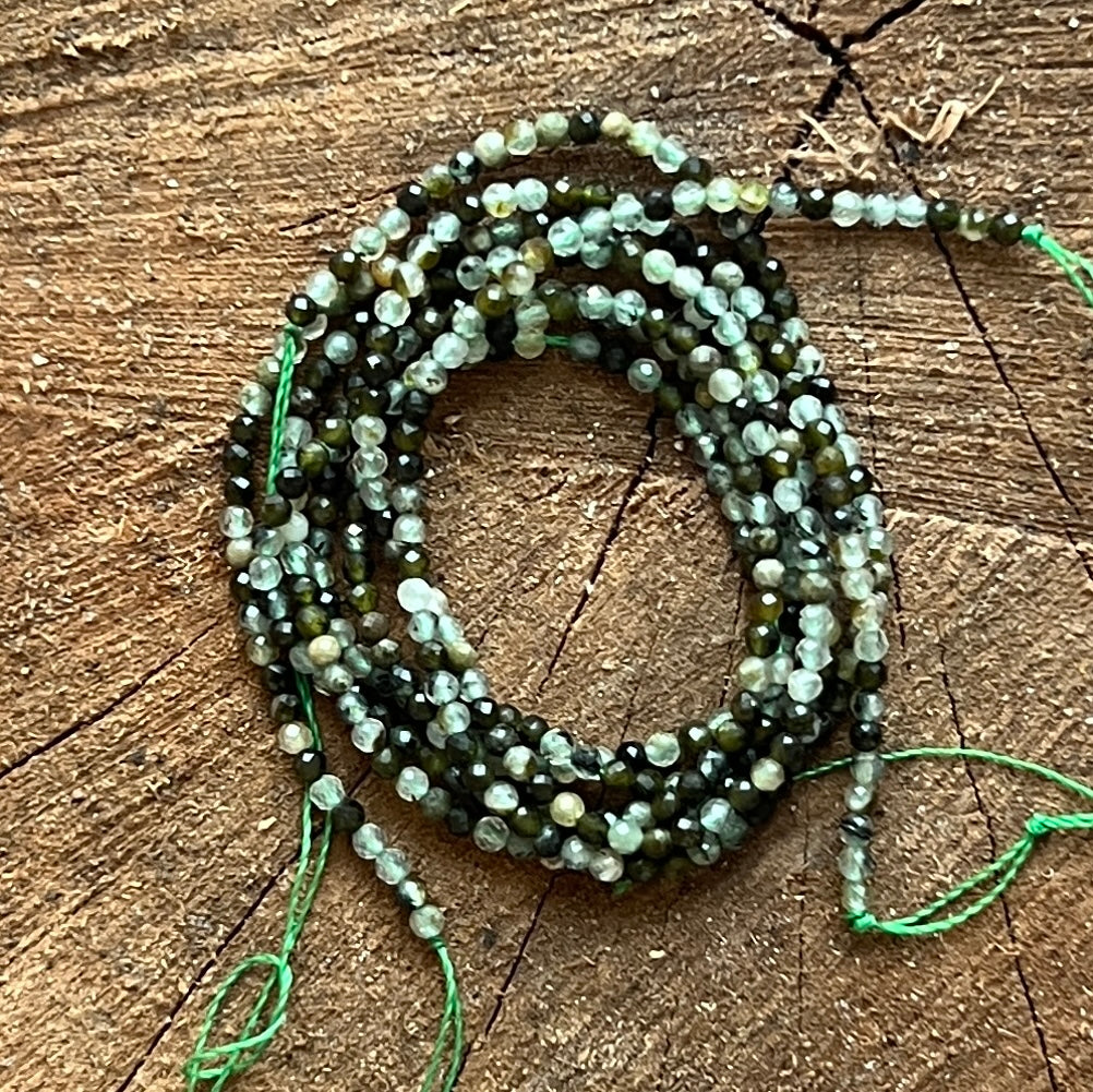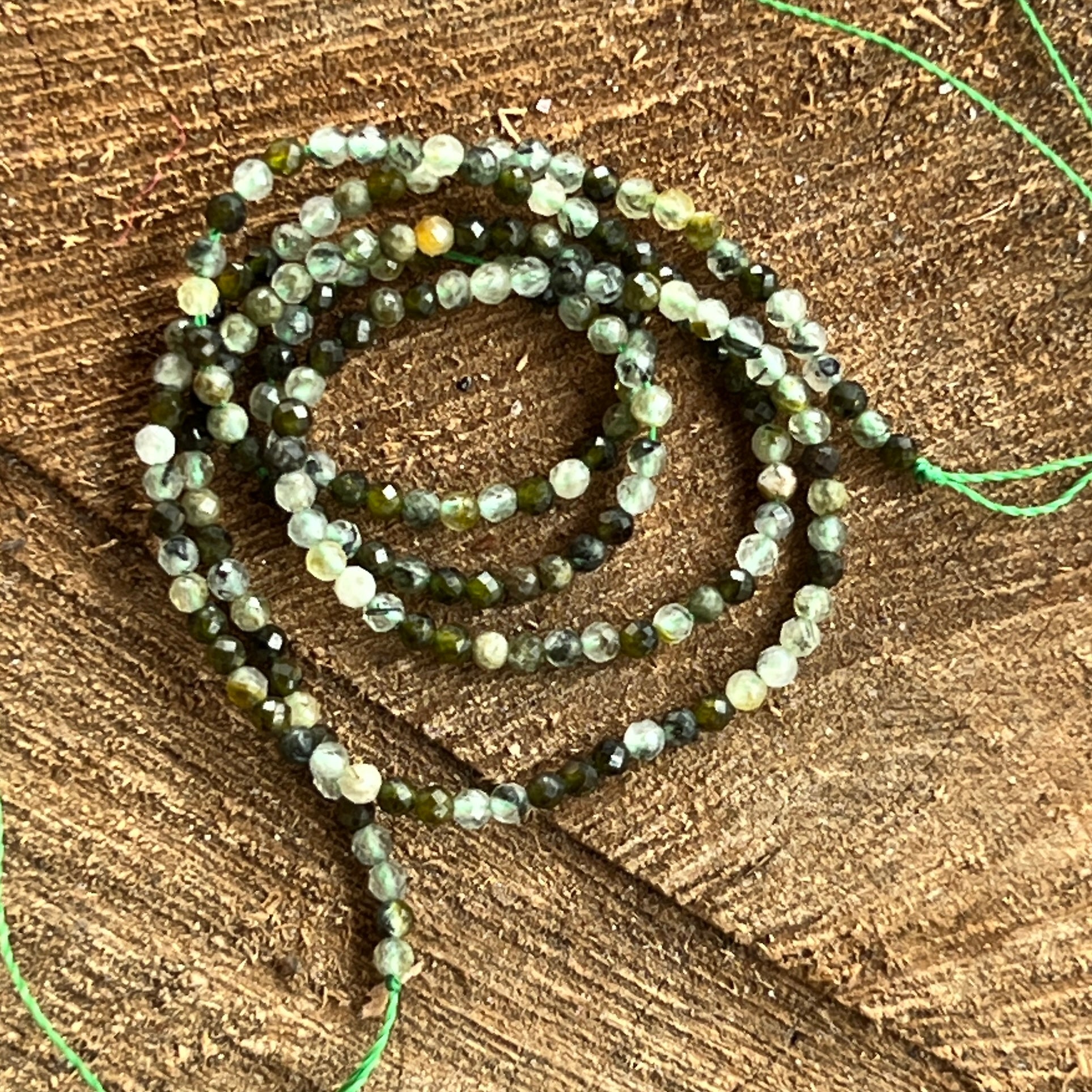 Zöld turmalin füzér, amely természetes CSISZOLT gömb alakú gyöngyökből áll, tökéletes nyakláncokhoz, karkötőkhöz vagy más kézműves ékszerekhez.