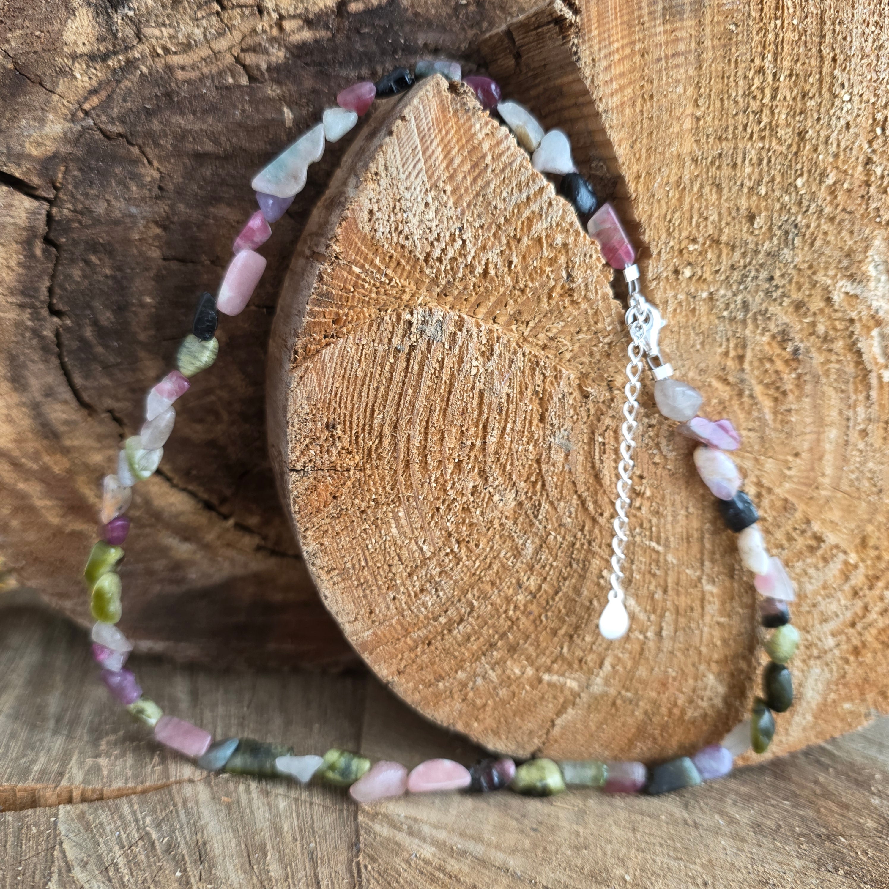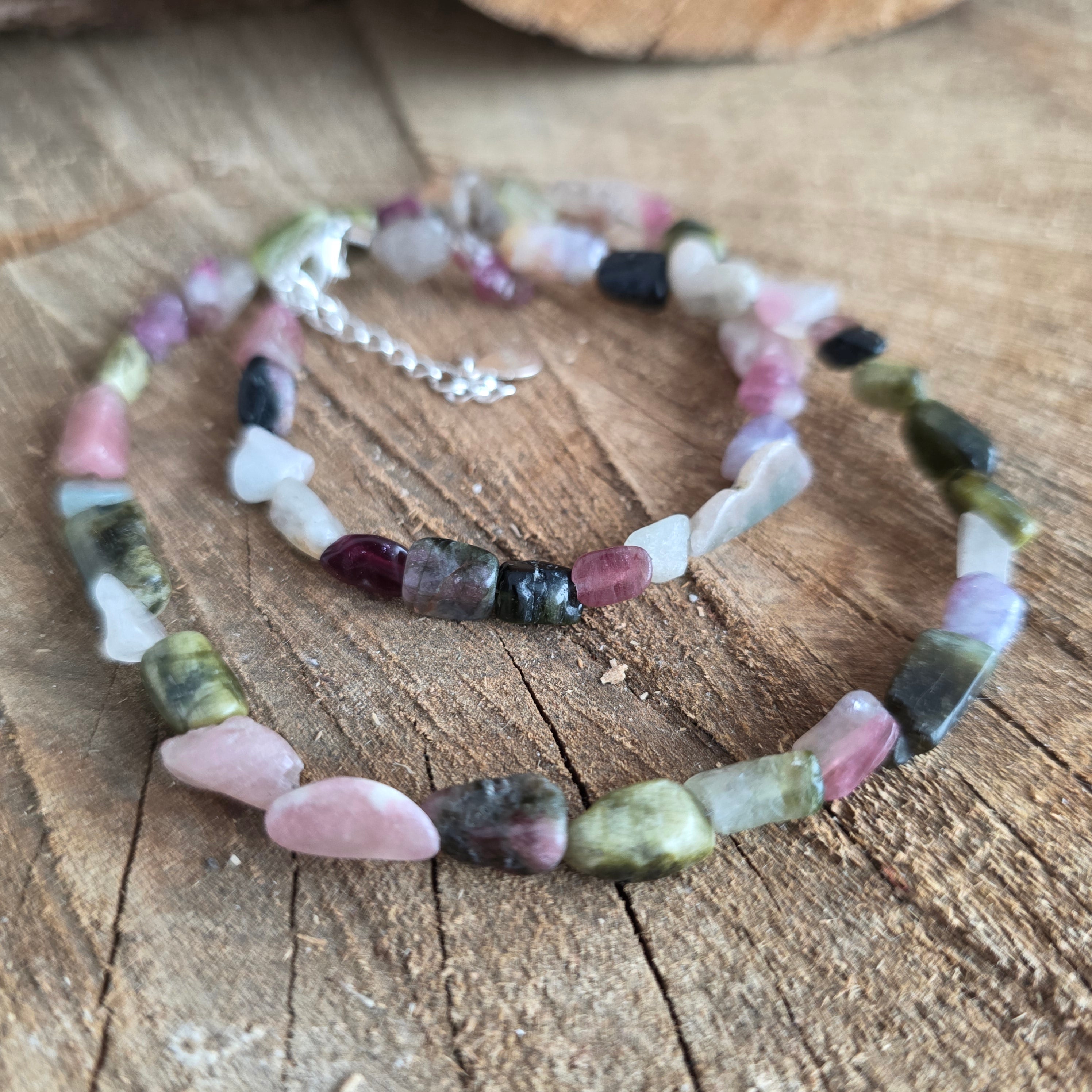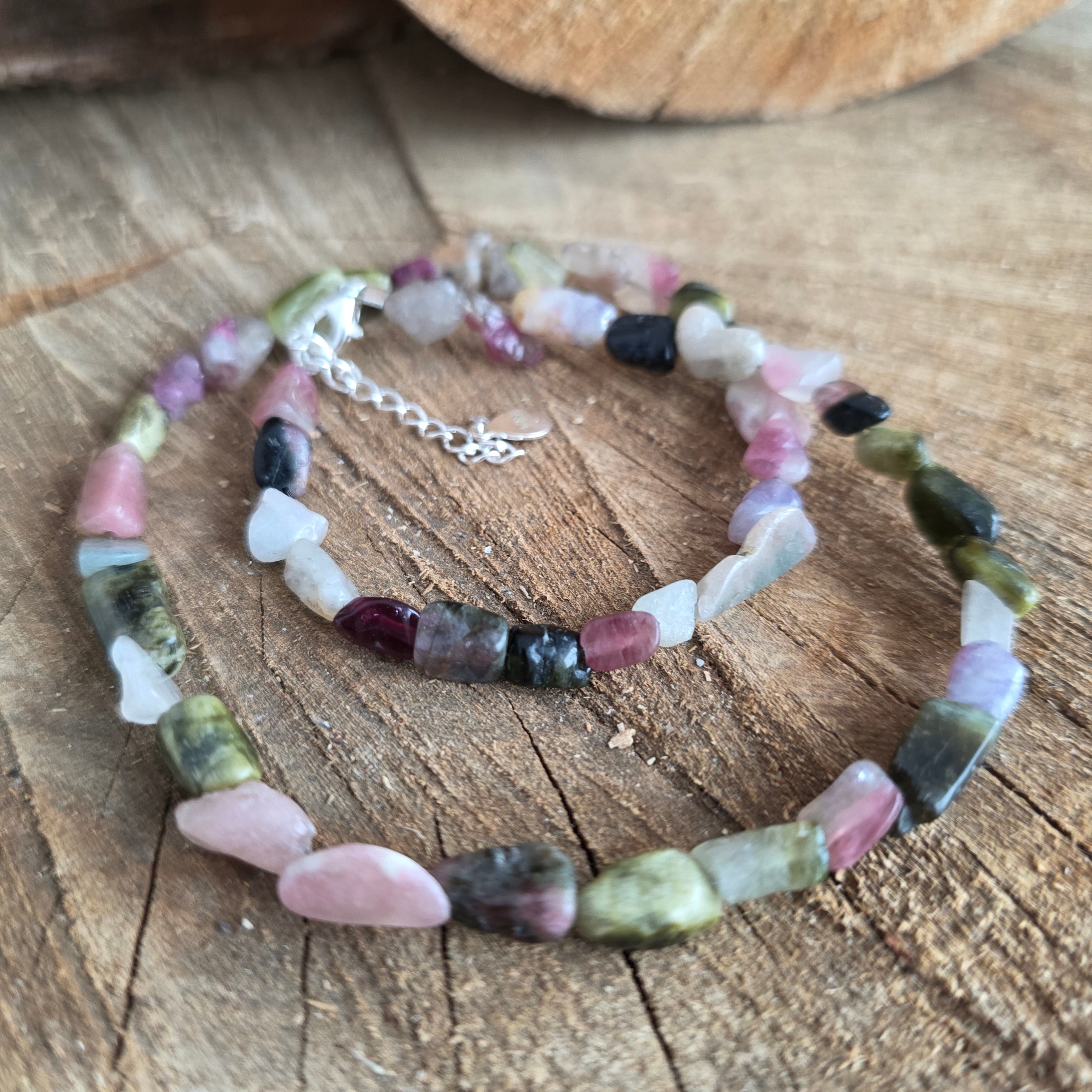 Egy nyaklánc, amely egyesíti az erőt a sokszínűség szépségével. 2 mm-es csiszolt természetes turmalin földes és pasztell színek szimfóniáját mutatja be, mint egy őszi kert, amelyet a fény örökített meg. Finom oldalai finoman tükrözik minden árnyalatot, kifinomultságot és életerővel teli hangulatot kölcsönözve a nyakláncnak.